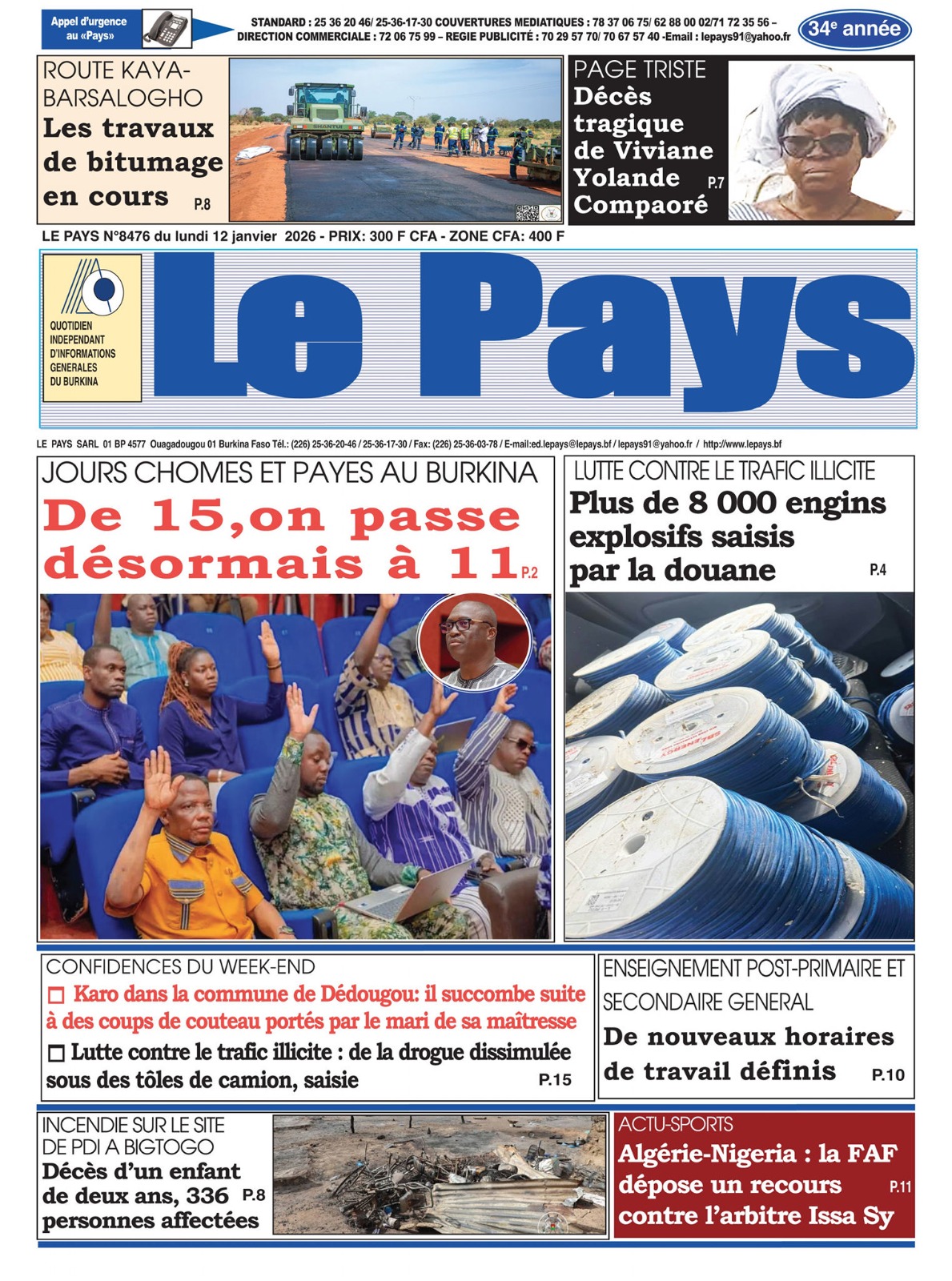 Photos. Les journaux du Burkina Faso du lundi 12 janvier 2026