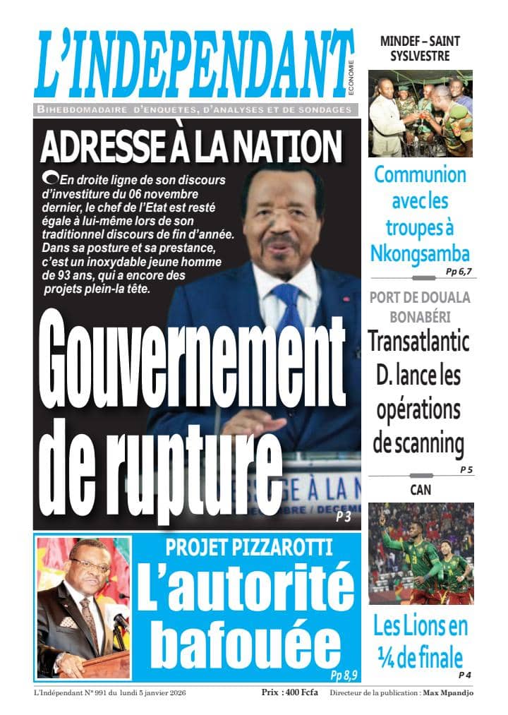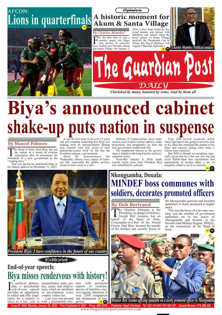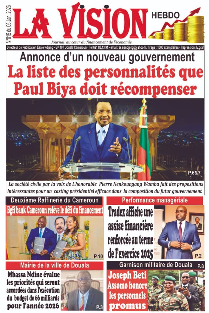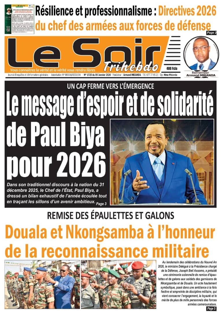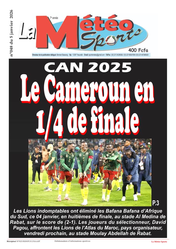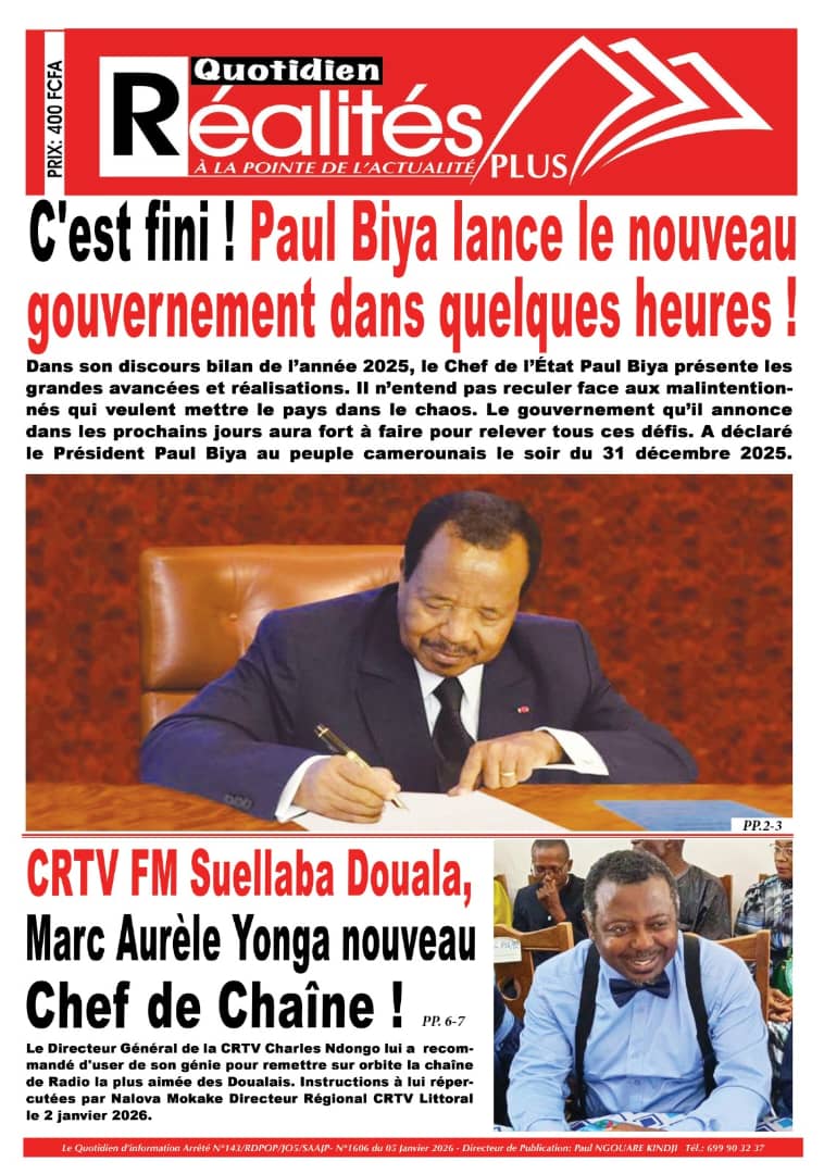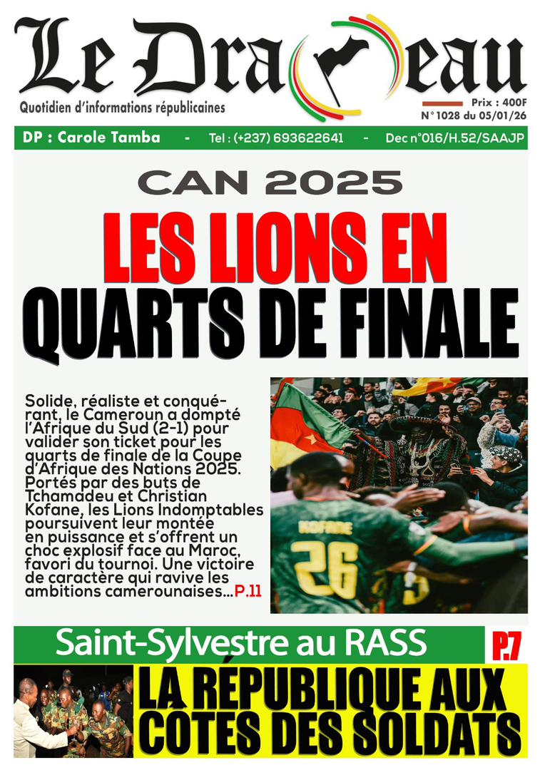 Cameroun : les journaux du lundi 05 janvier 2026 sont marqués par les attentes liées au nouveau gouvernement du Président Paul Biya après sa réélection et la qualification des Lions Indomptables en 1/4 de finales de la CAN 2025 au Maroc, après leur victoire contre l’Afrique du Sud.