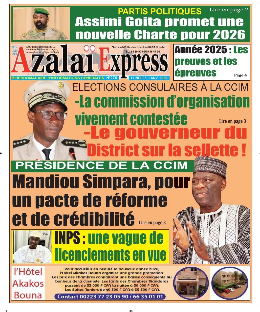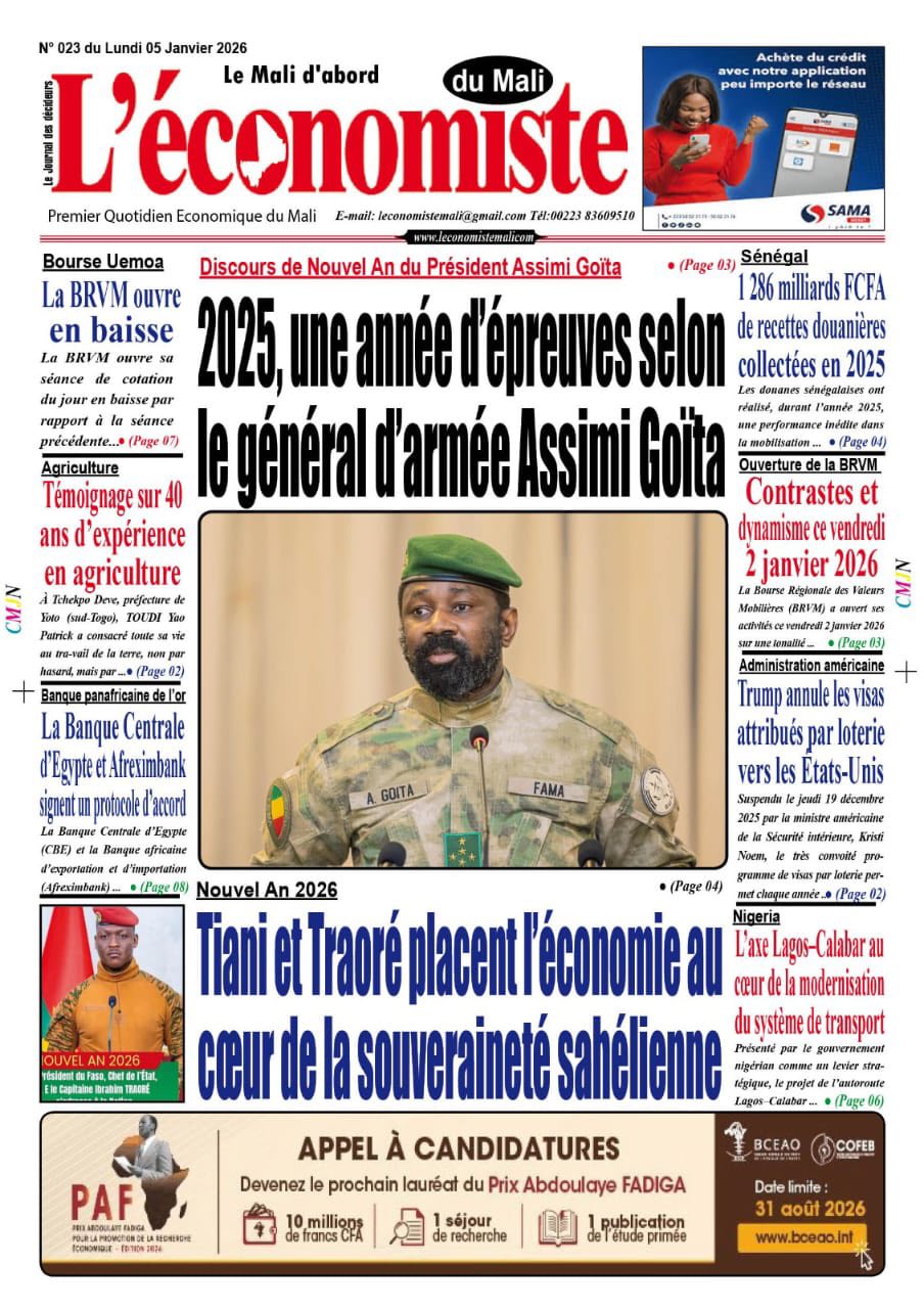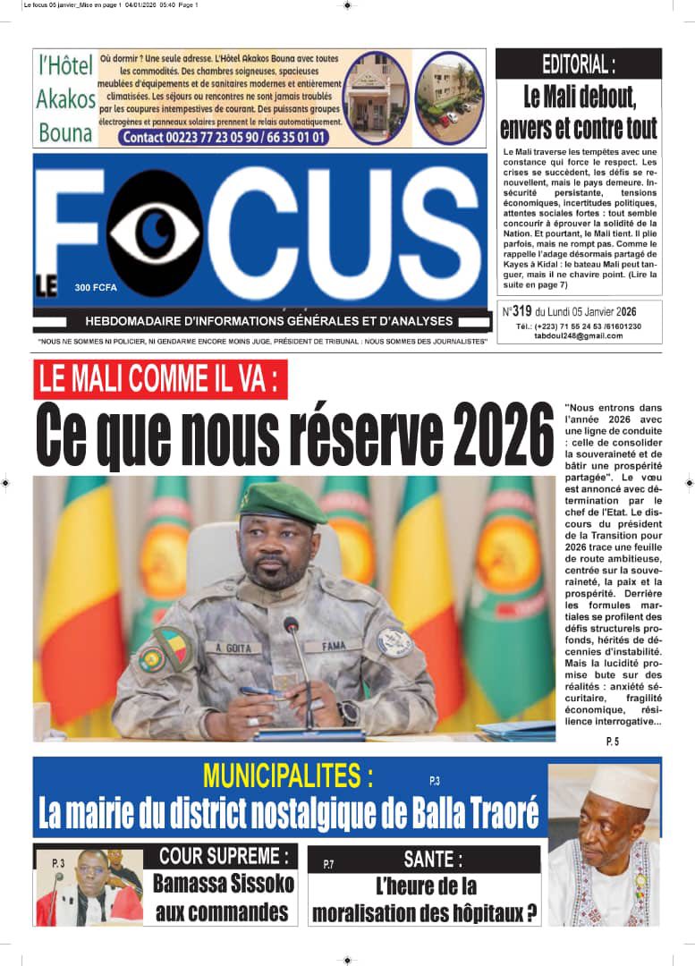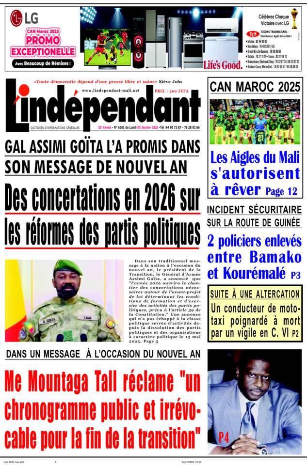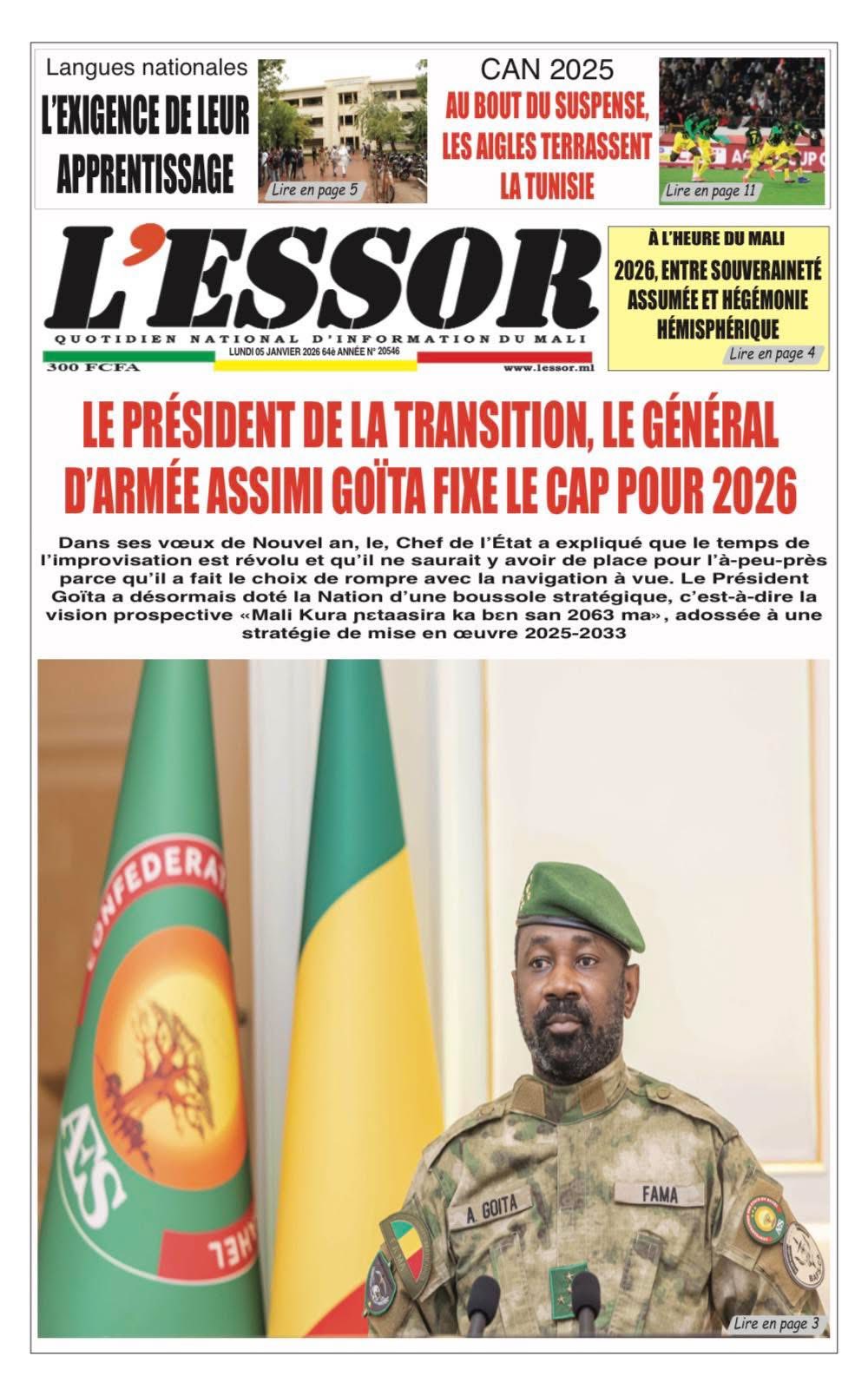 Mali : les journaux du lundi 05 janvier 2026 avec en exergue le bilan de l’année écoulée et les perspectives pour la nouvelle dressée par le Général Assimi Goïta dans ses voeux aux populations.