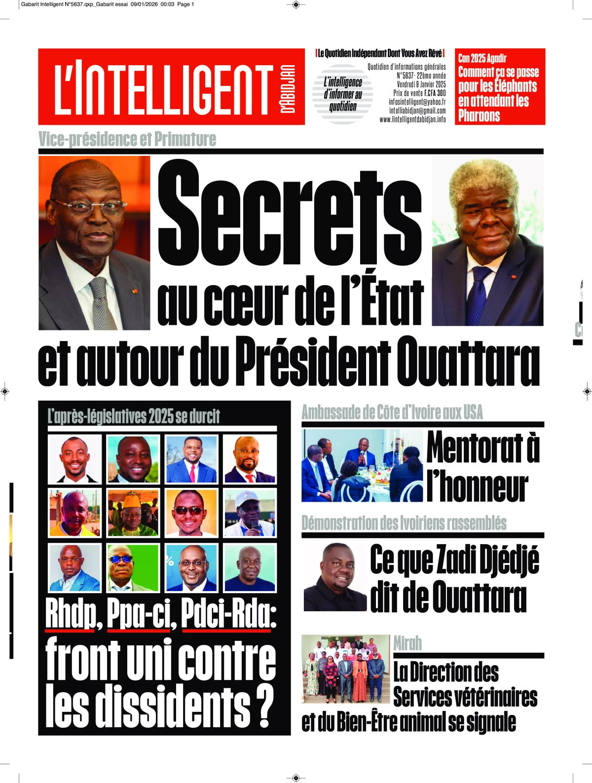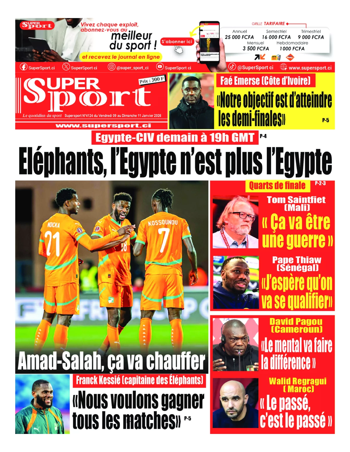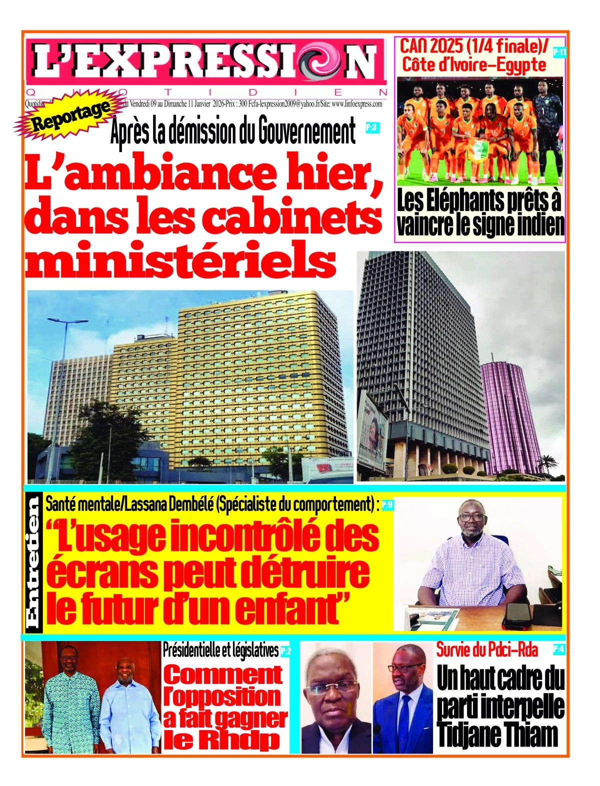 Les journaux ivoiriens du vendredi 09 janvier 2026 restent marqués par les perspectives liés au nouveau gouvernement à mettre en place par le Président Alassane Ouattara. La CAN 2025 est aussi présente, avec le match de 1/4 de finales à disputer par les Eléphants, champions en titre, ce samedi 10 janvier contre les Pharaons d’Egypte.