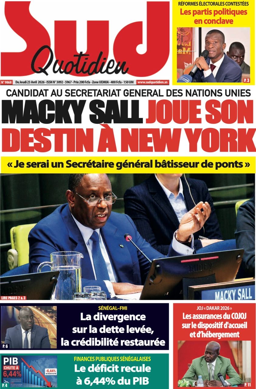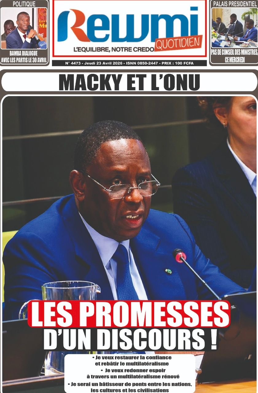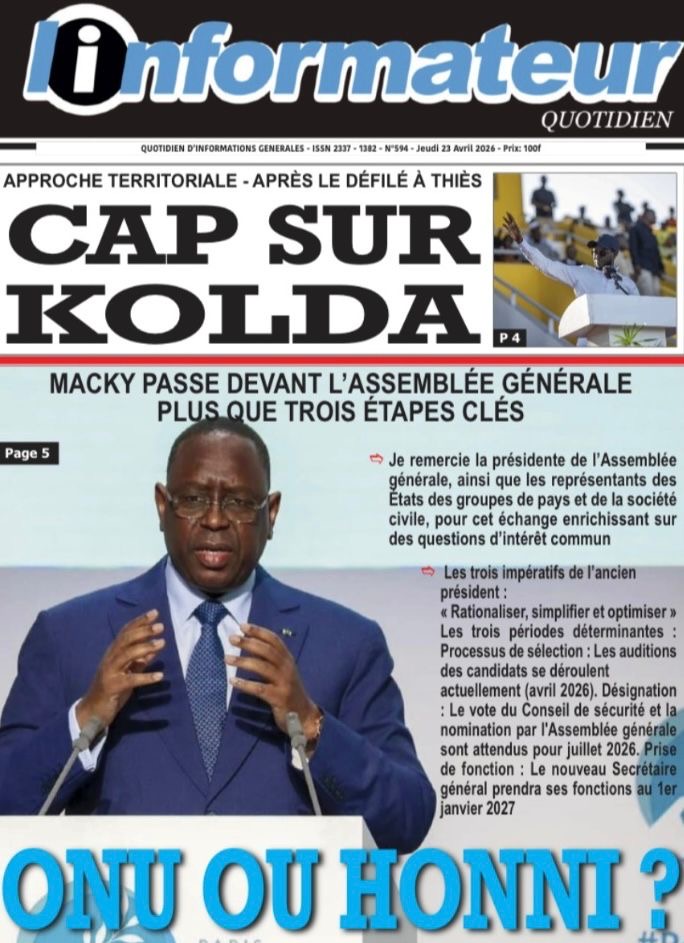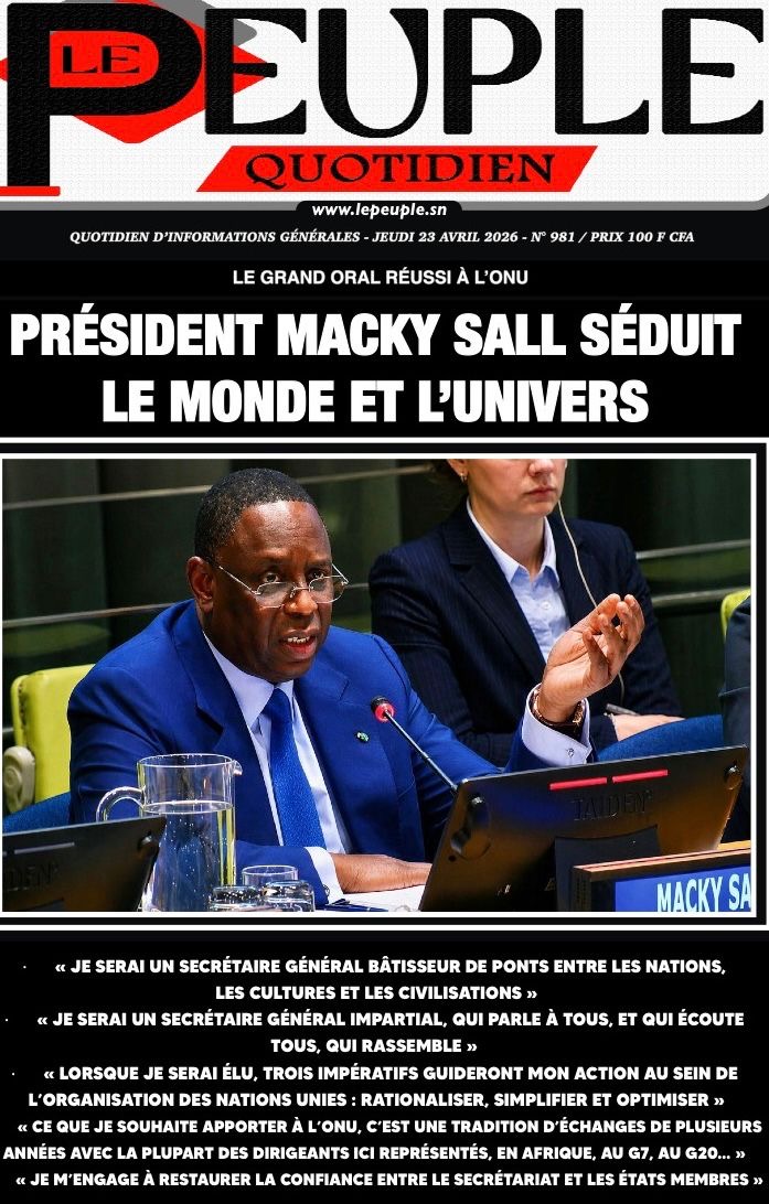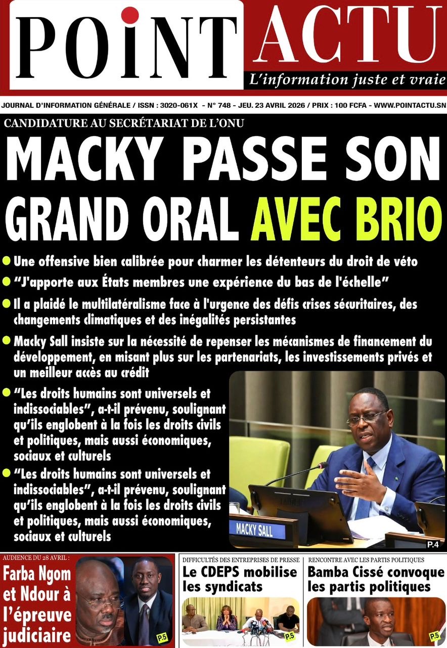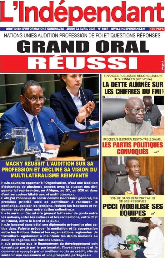 Les journaux sénégalais du jeudi 23 avril 2026 mettent en vedette un seul sujet, le Grand oral de l’ex-Président Macky Sall devant l’assemblée générale de l’ONU pour l’audition dans le cadre de sa candidature au poste de Secrétaire général.