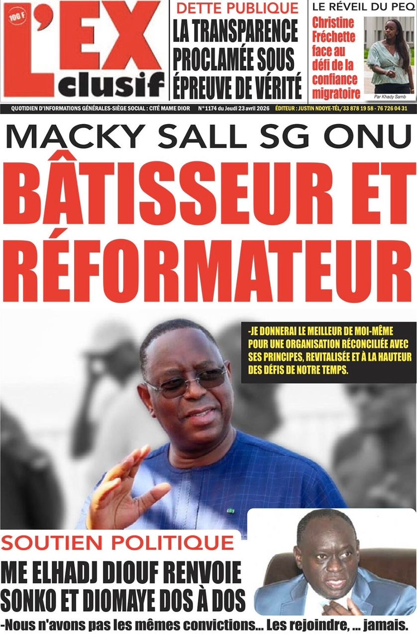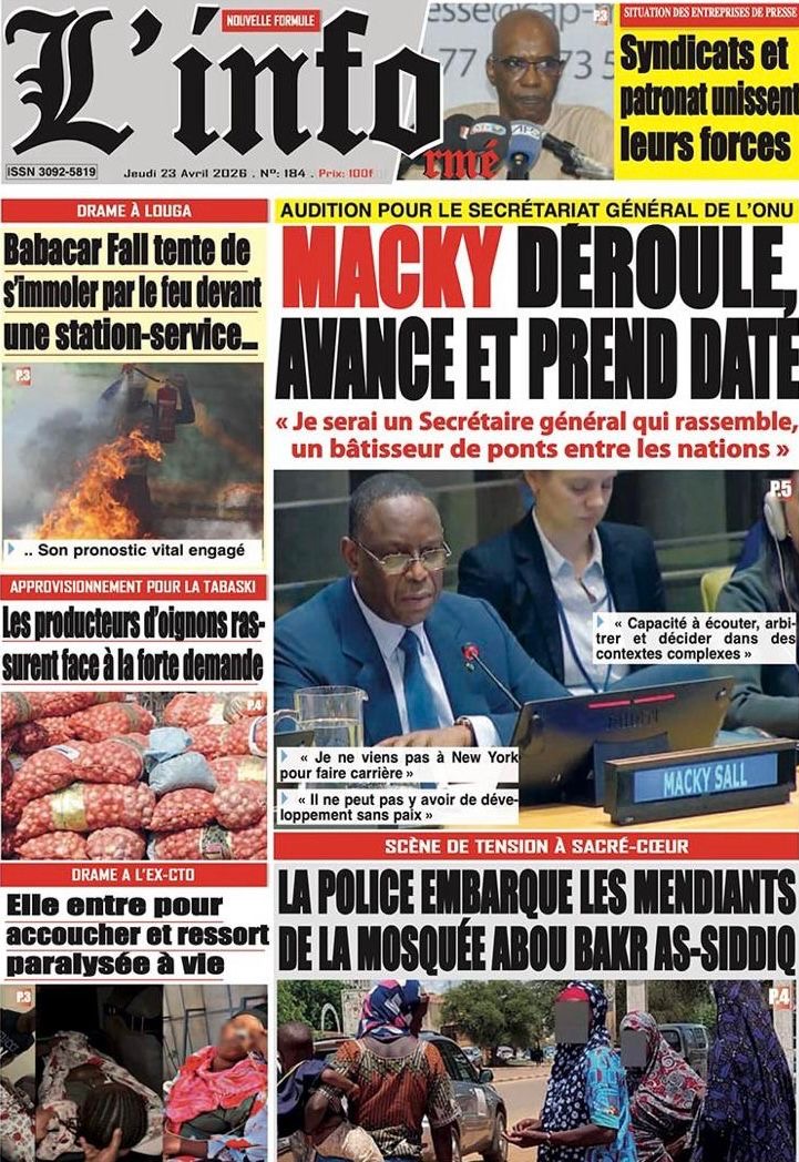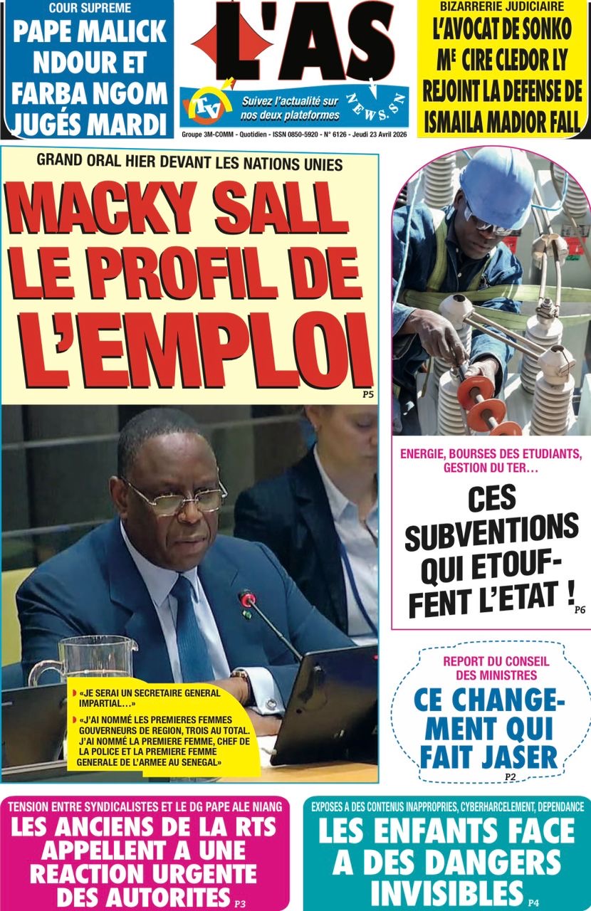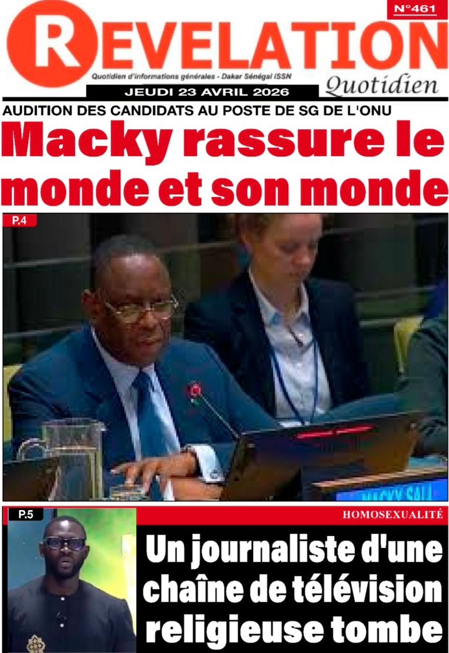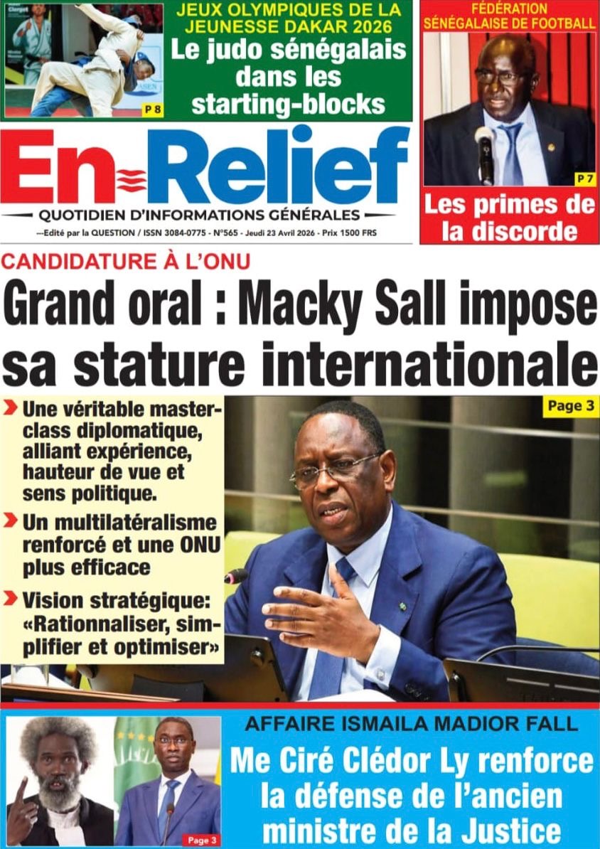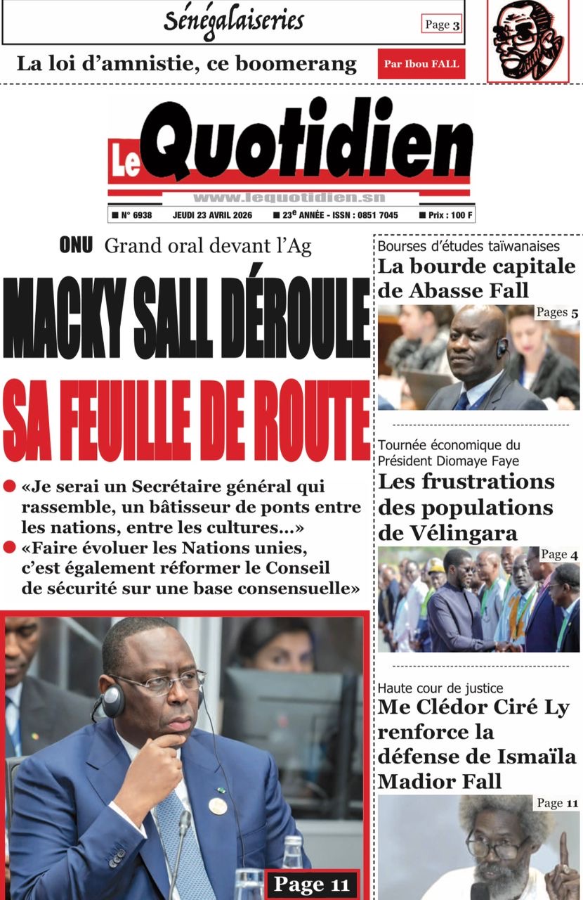 Les journaux sénégalais du jeudi 23 avril 2026 mettent en vedette un seul sujet, le Grand oral de l’ex-Président Macky Sall devant l’assemblée générale de l’ONU pour l’audition dans le cadre de sa candidature au poste de Secrétaire général.