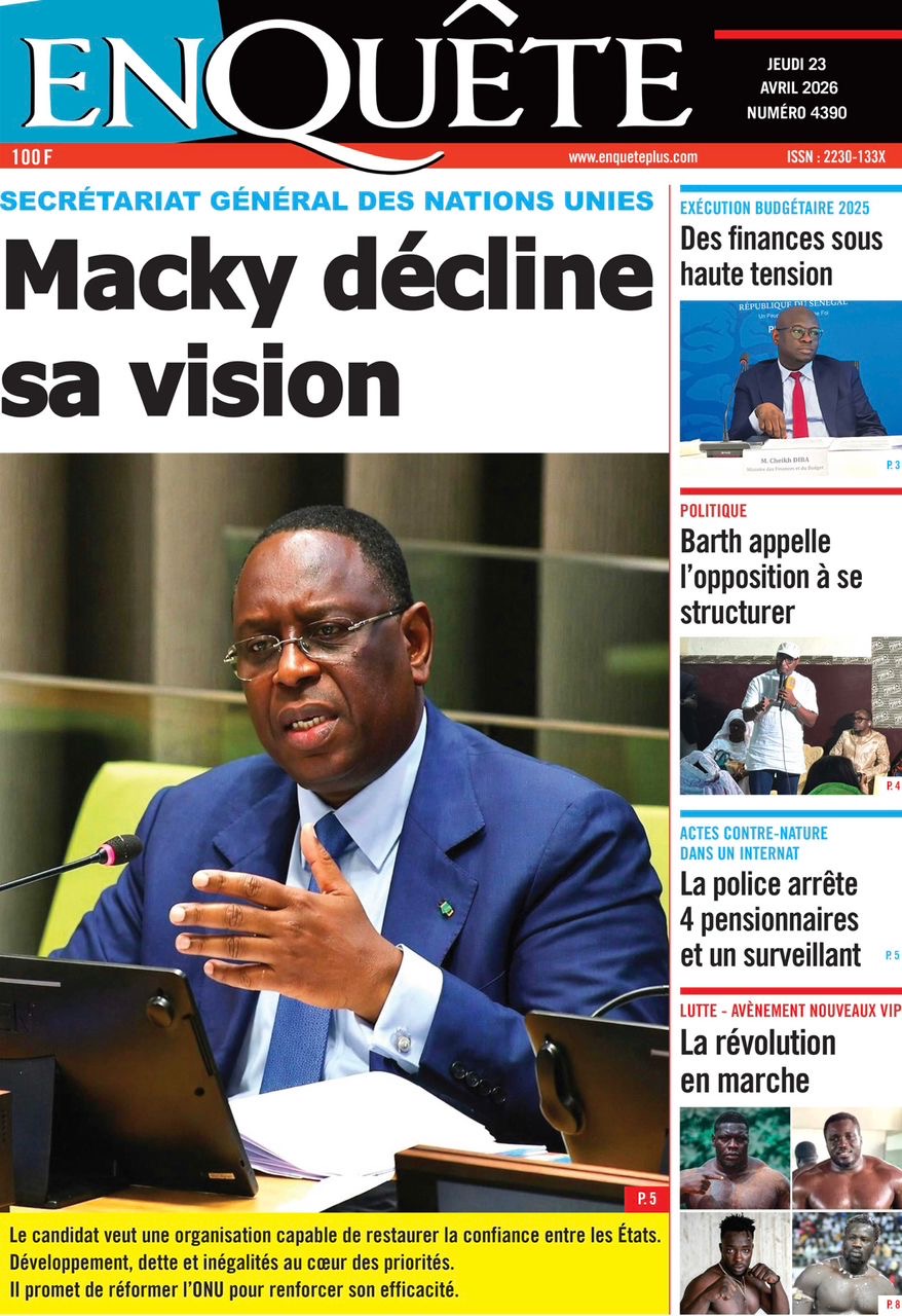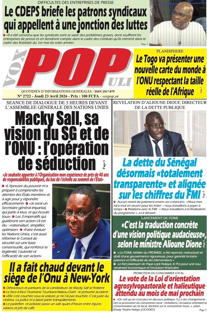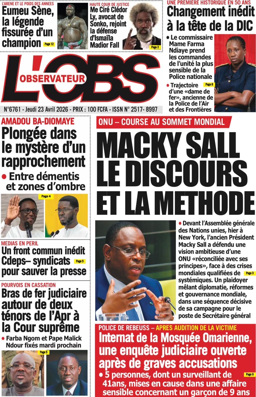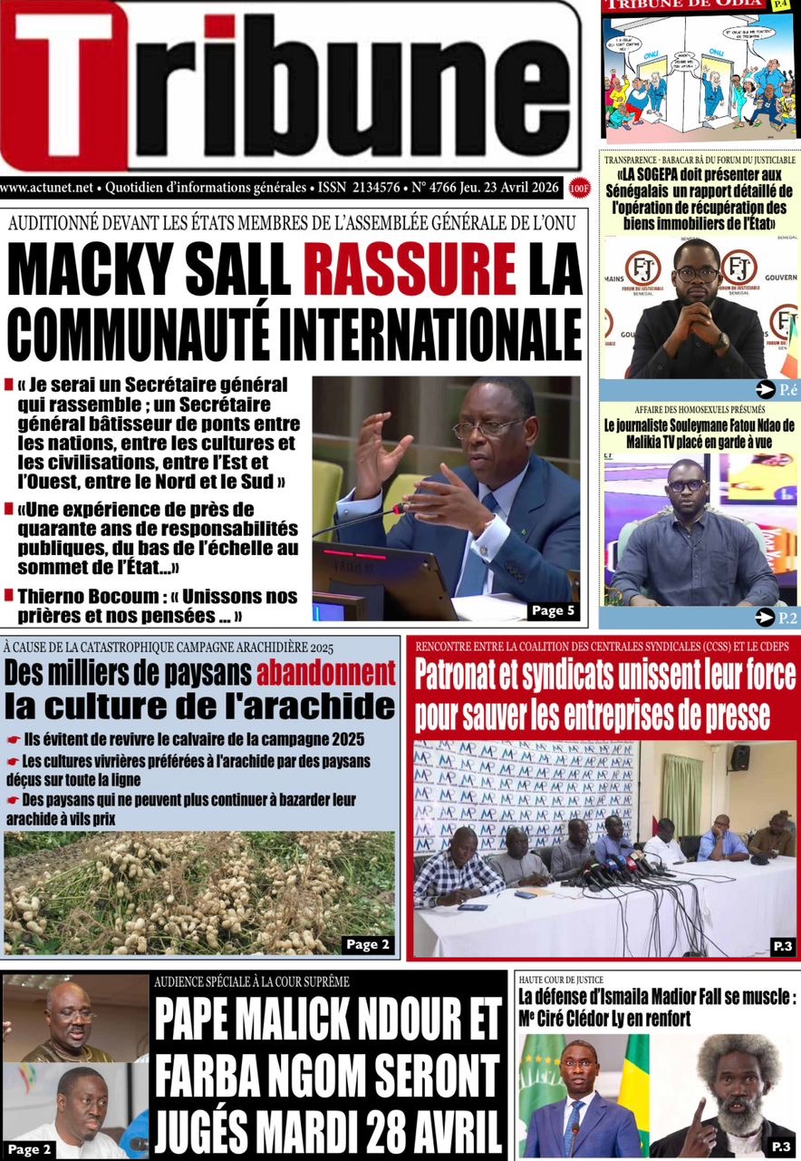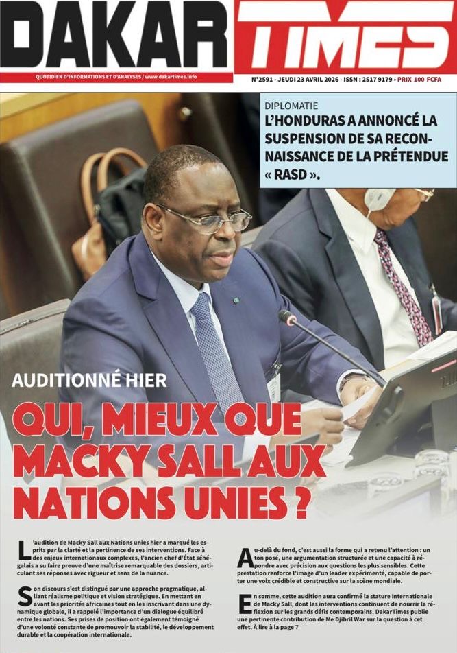 Les journaux sénégalais du jeudi 23 avril 2026 mettent en vedette un seul sujet, le Grand oral de l’ex-Président Macky Sall devant l’assemblée générale de l’ONU pour l’audition dans le cadre de sa candidature au poste de Secrétaire général.