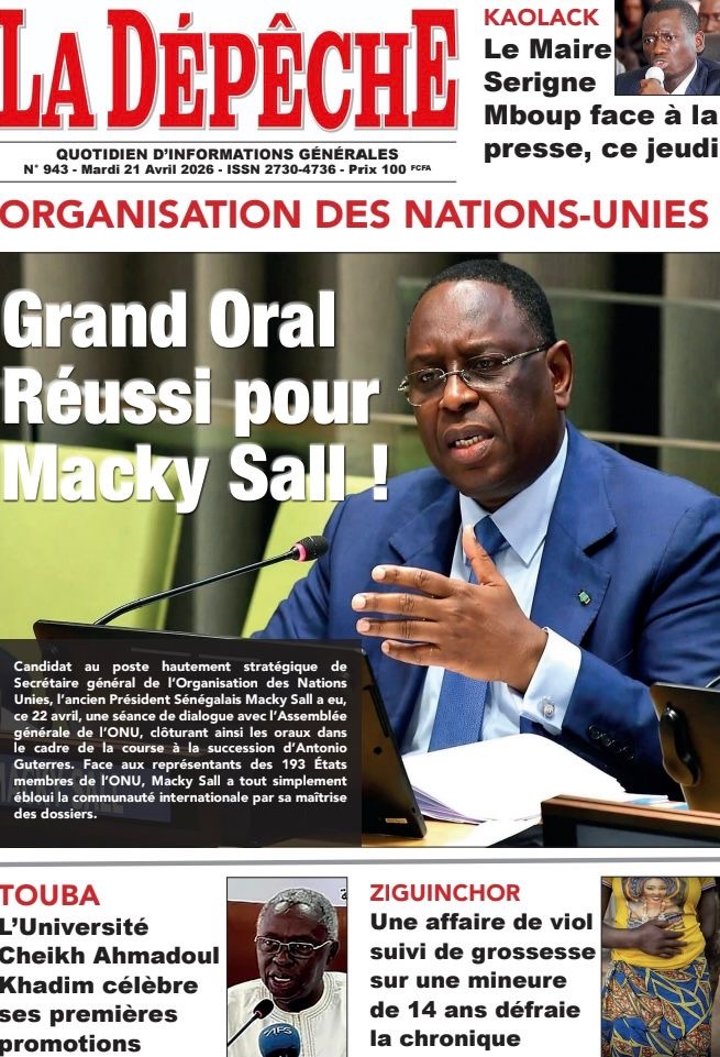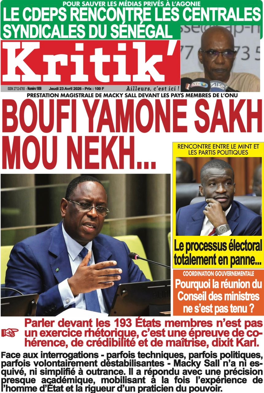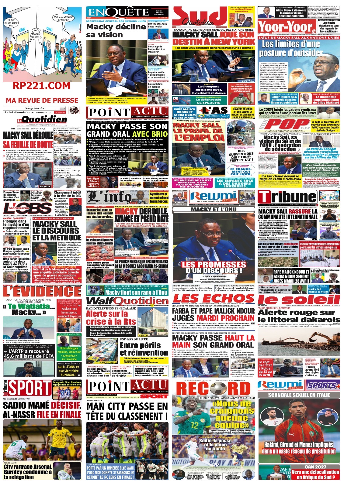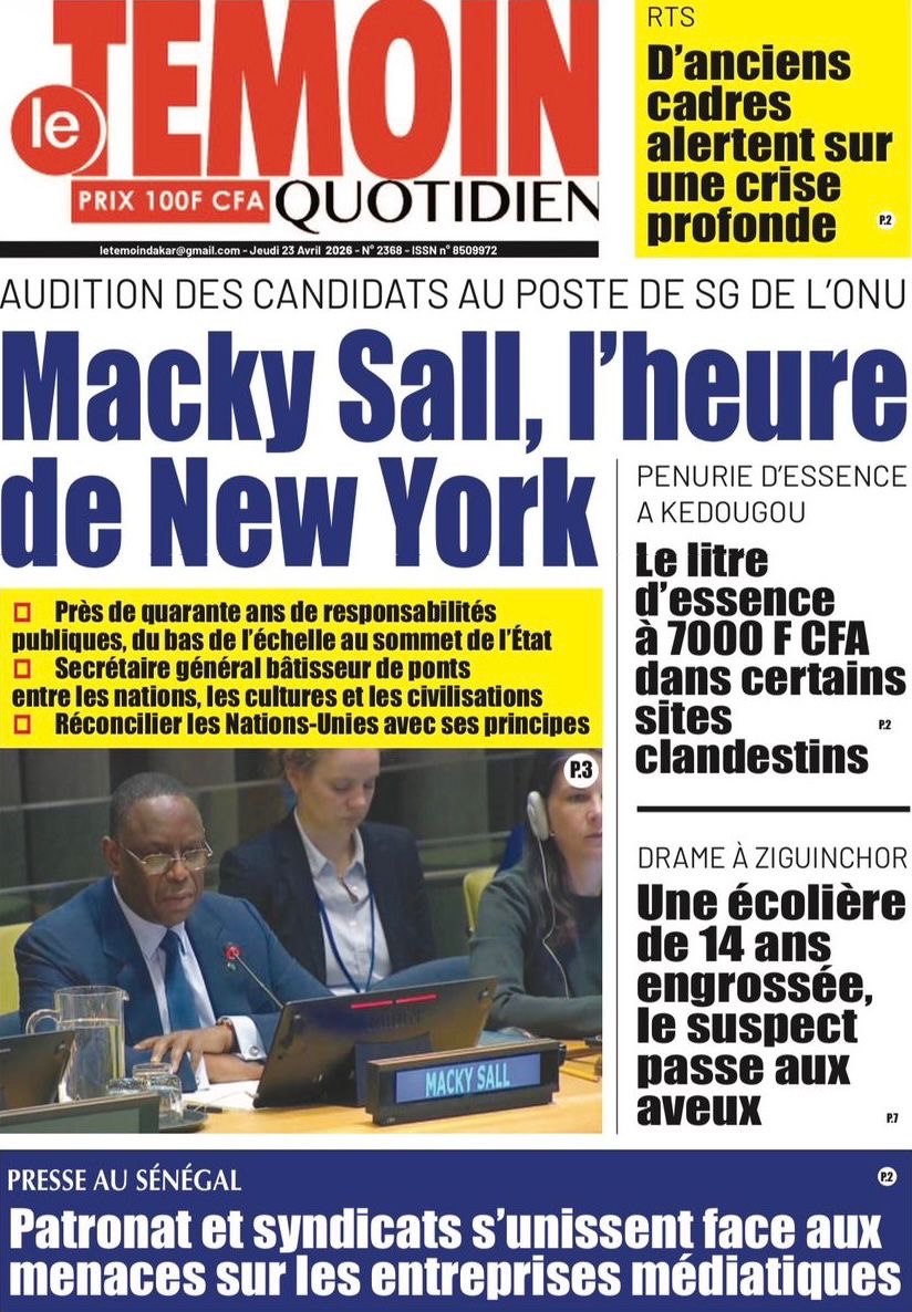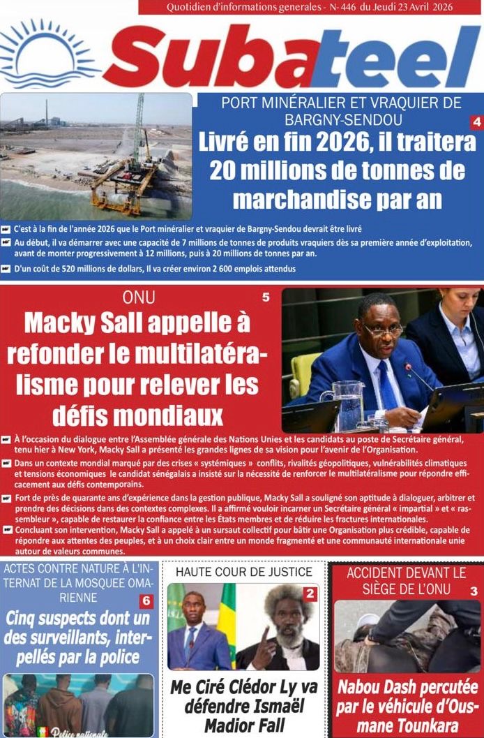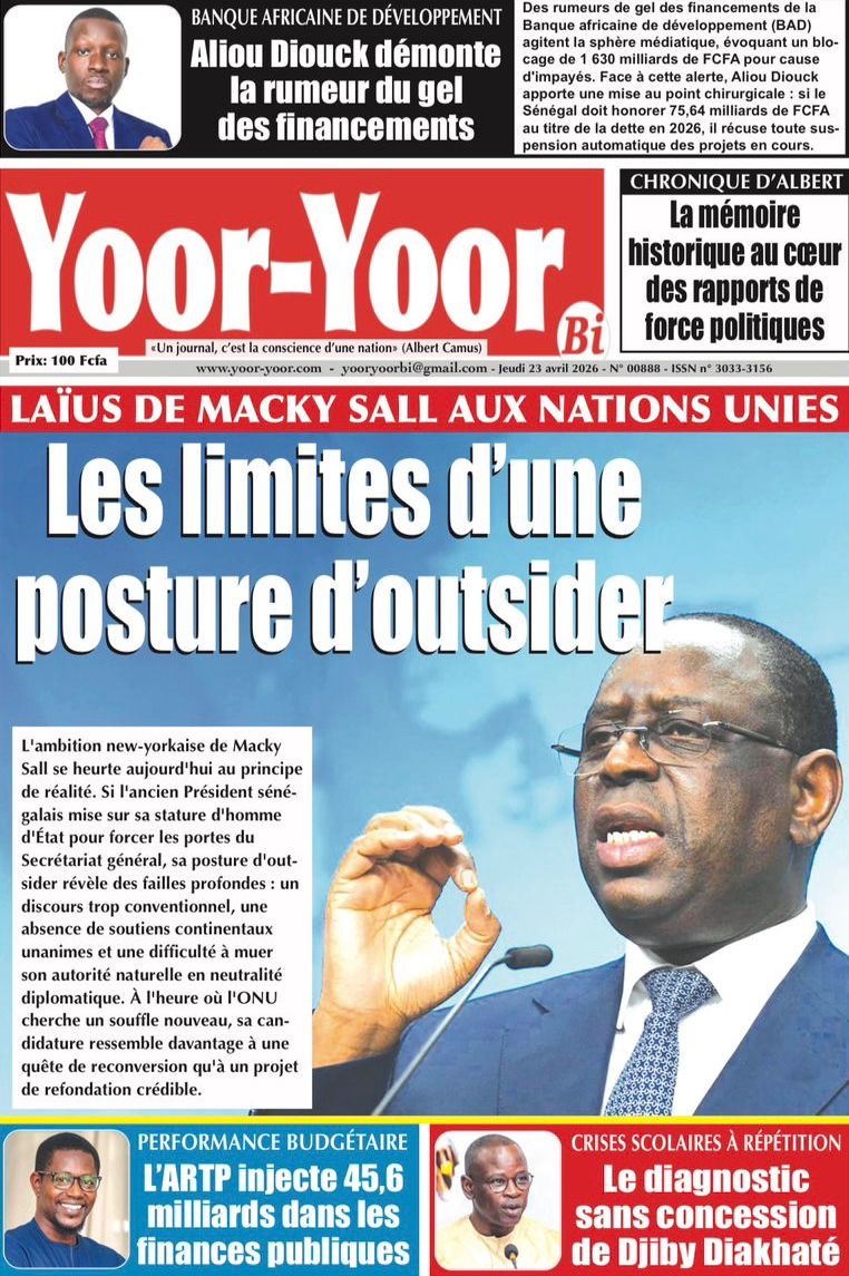 Les journaux sénégalais du jeudi 23 avril 2026 mettent en vedette un seul sujet, le Grand oral de l’ex-Président Macky Sall devant l’assemblée générale de l’ONU pour l’audition dans le cadre de sa candidature au poste de Secrétaire général.