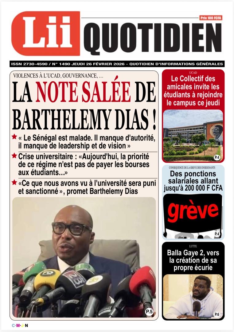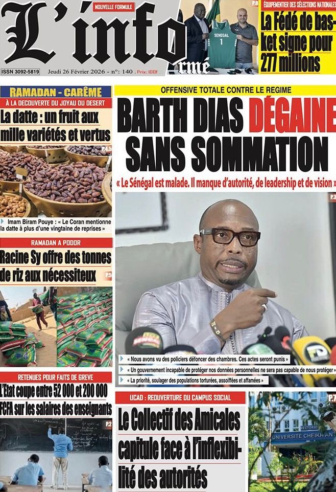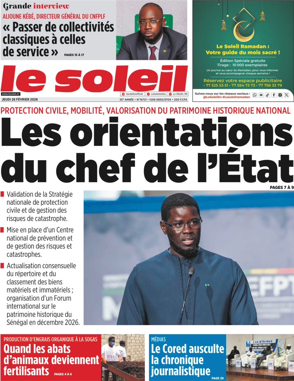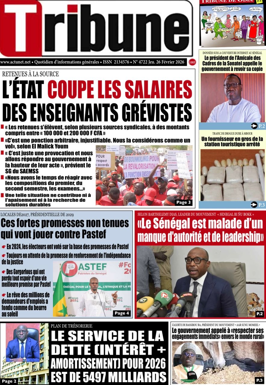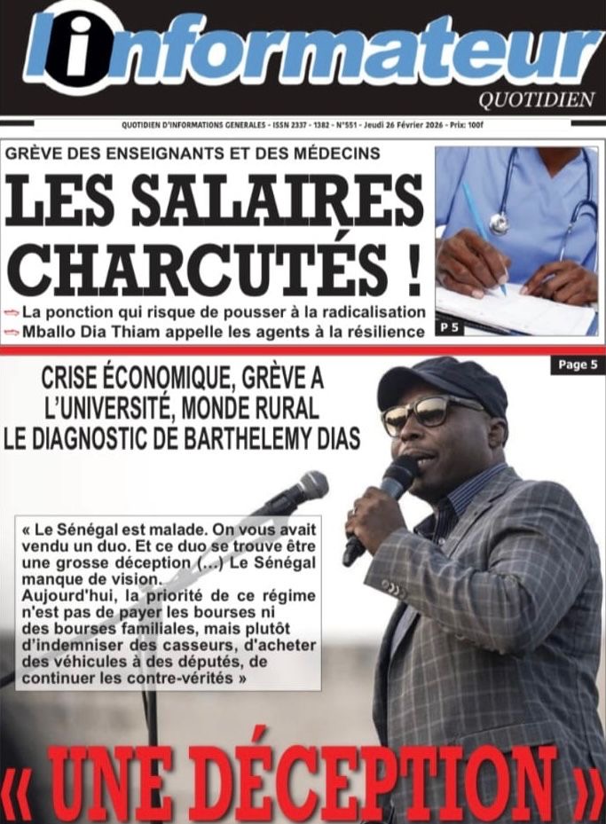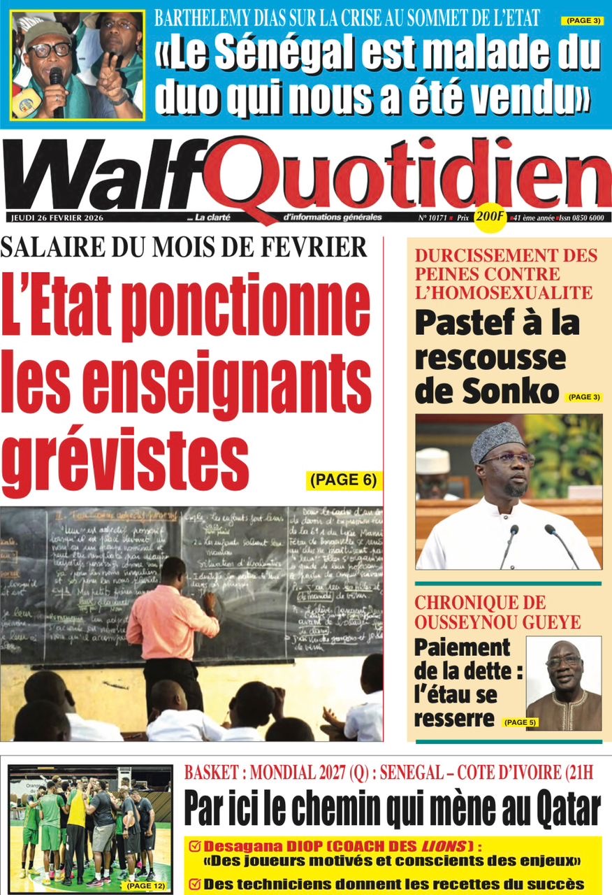 Jeudi 26 février 2026 : les journaux sénégalais mettent en avant les directives du Président de la République lors du dernier conseil des ministres, les ponctions opérées sur les salaires des enseignants grévistes et la sortie de Barthélémy Dias sur la situation nationale.