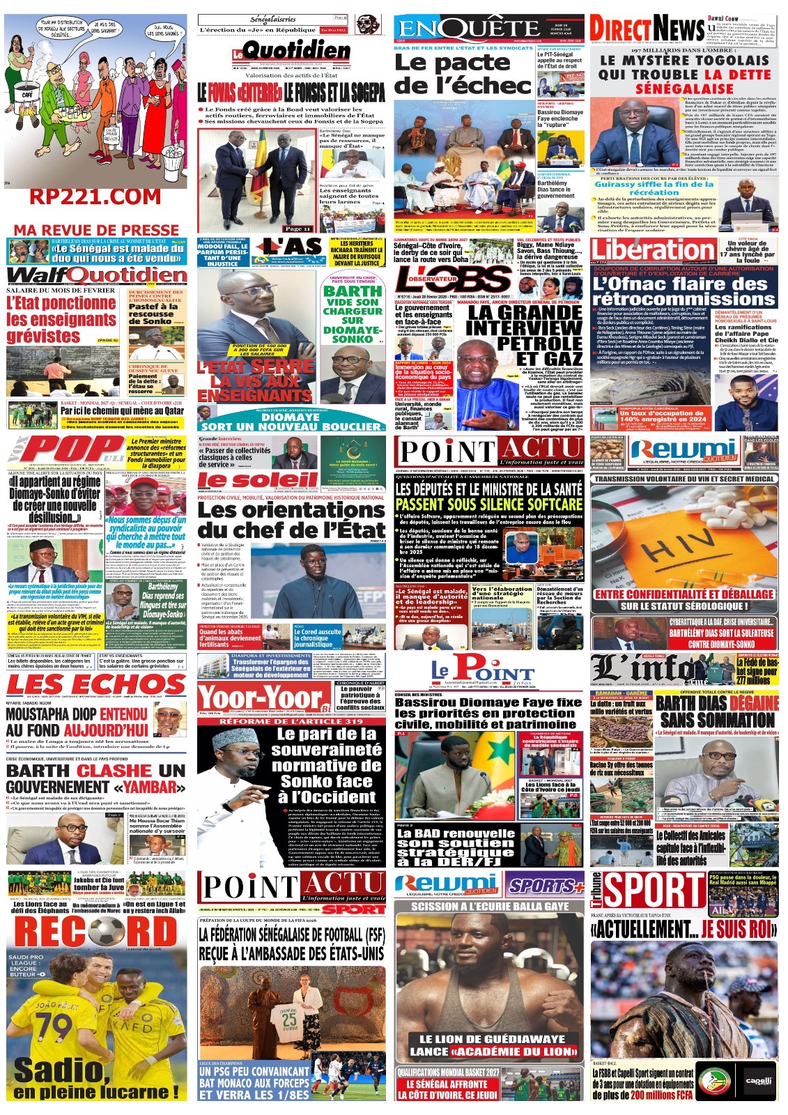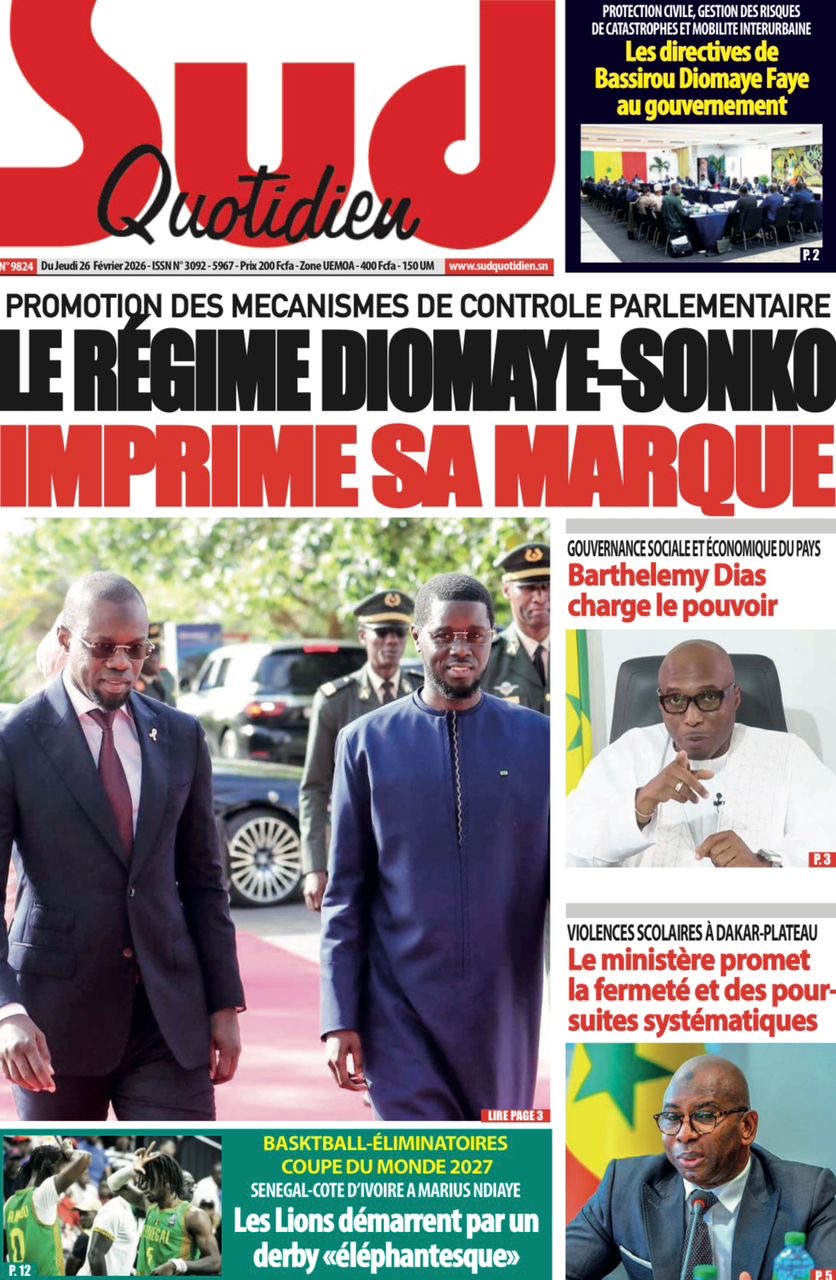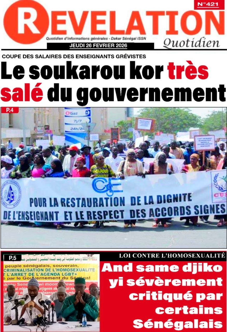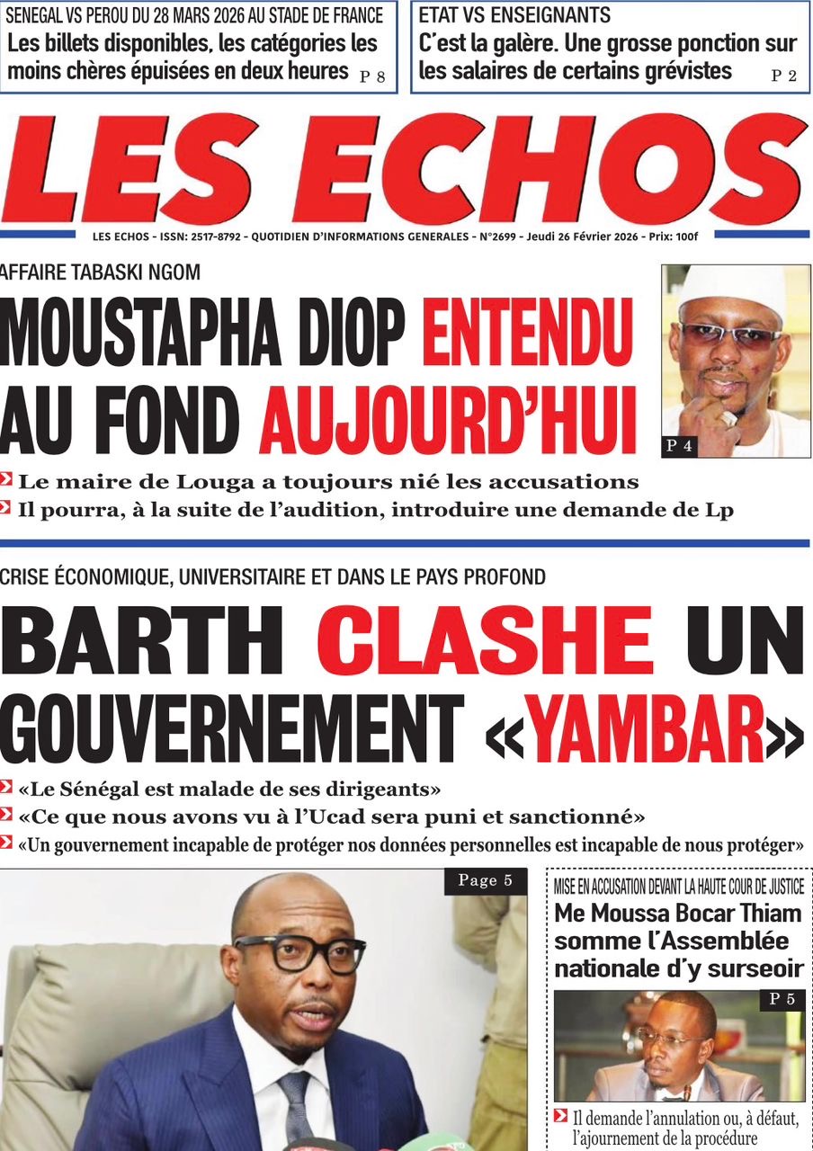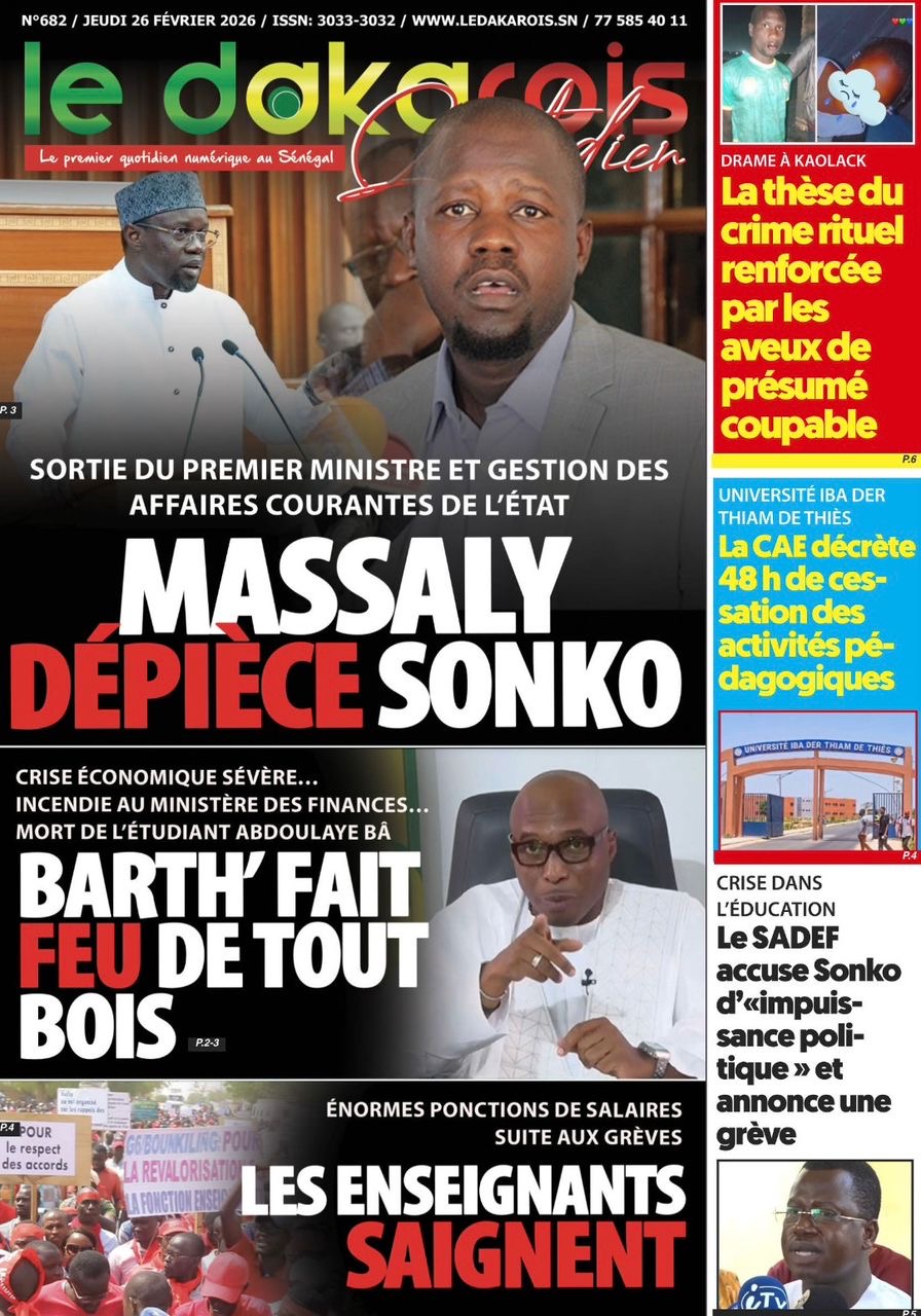 Jeudi 26 février 2026 : les journaux sénégalais mettent en avant les directives du Président de la République lors du dernier conseil des ministres, les ponctions opérées sur les salaires des enseignants grévistes et la sortie de Barthélémy Dias sur la situation nationale.