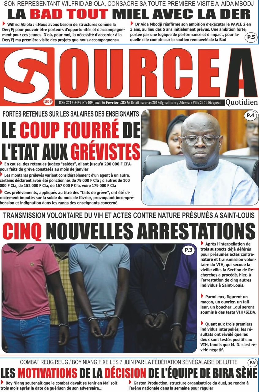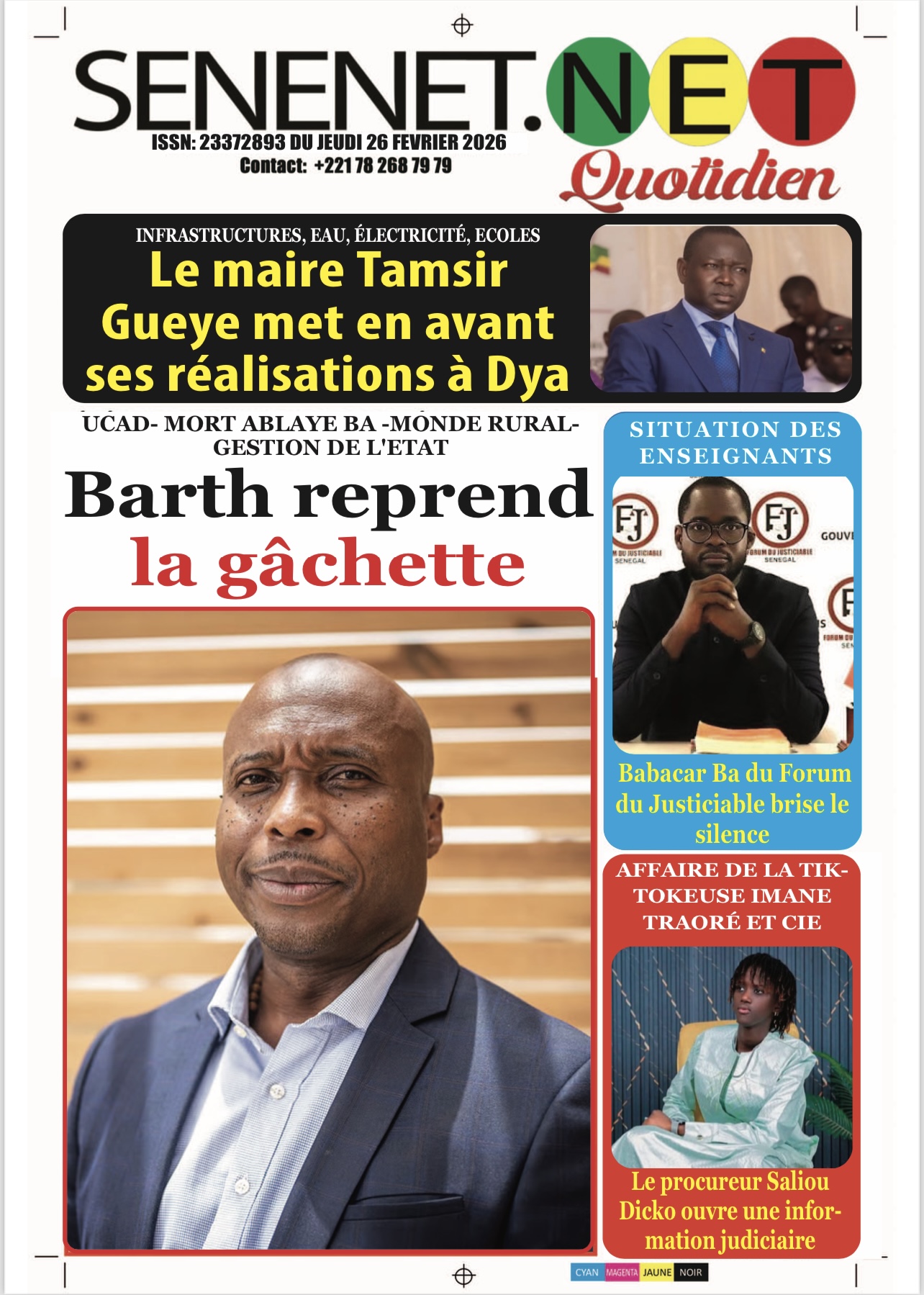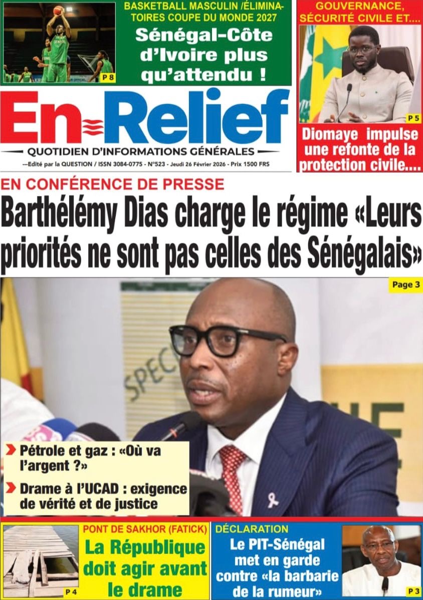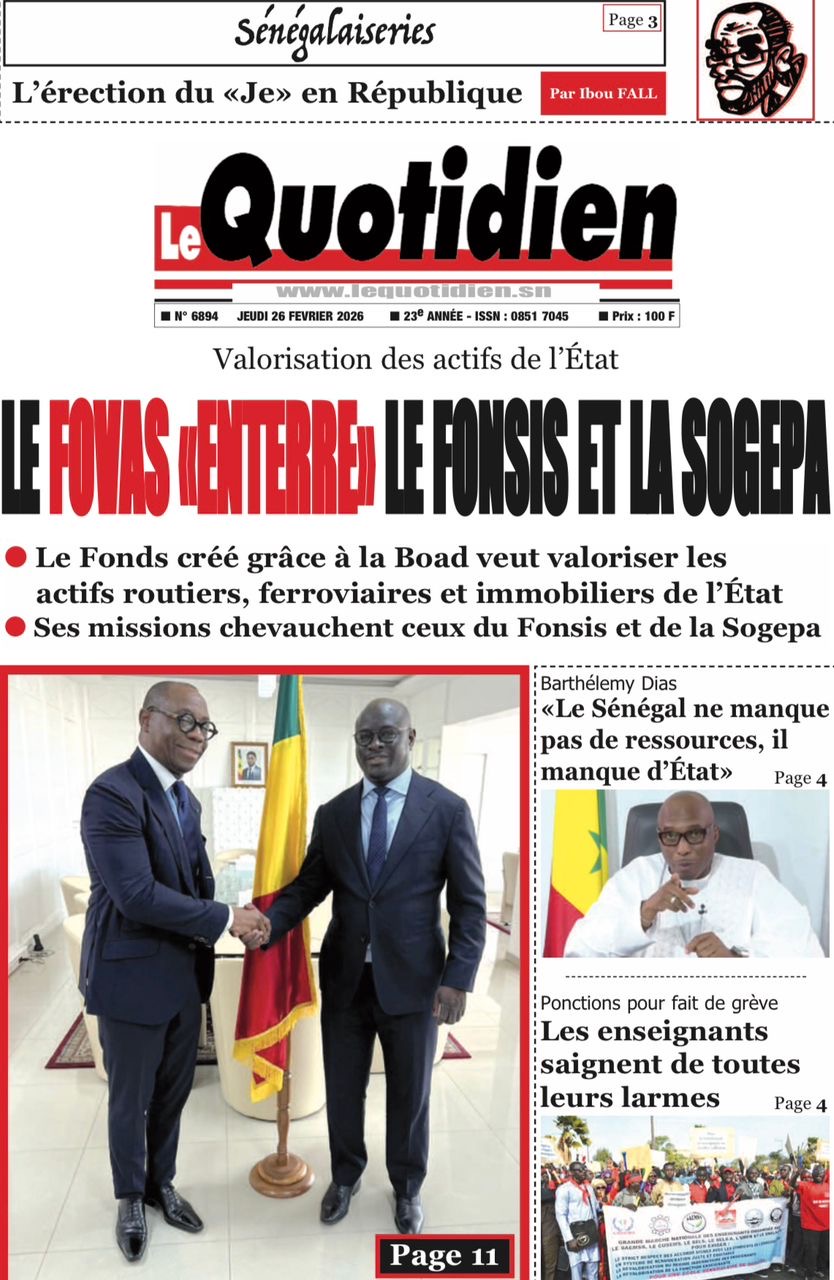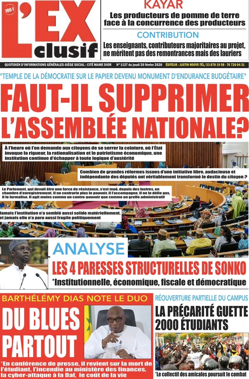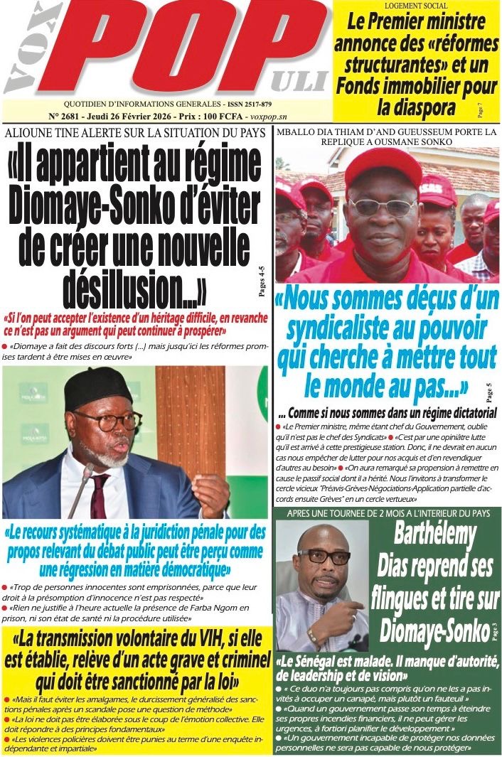 Jeudi 26 février 2026 : les journaux sénégalais mettent en avant les directives du Président de la République lors du dernier conseil des ministres, les ponctions opérées sur les salaires des enseignants grévistes et la sortie de Barthélémy Dias sur la situation nationale.
