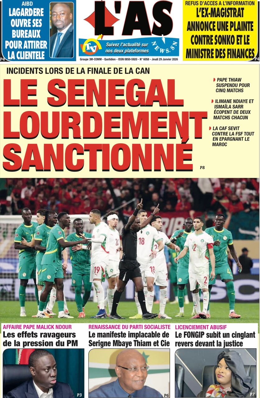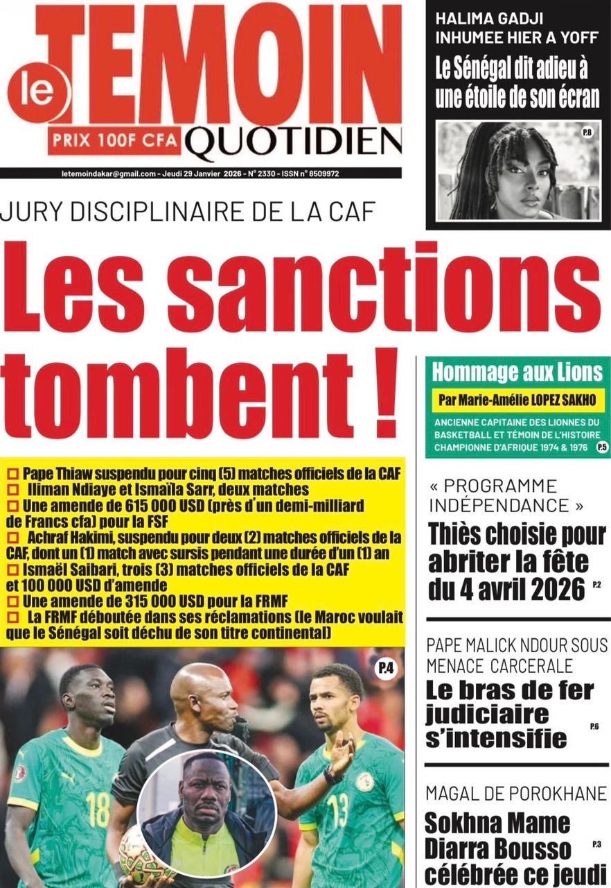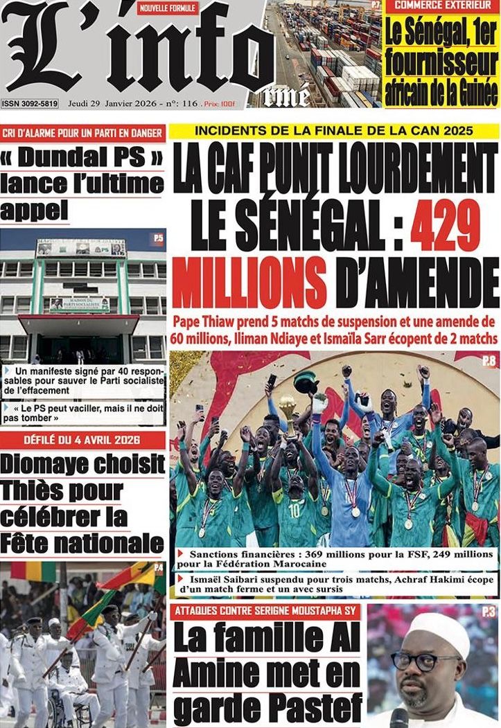 Les journaux sénégalais du jeudi 29 janvier 2026 mettent en exergue les sanctions de la CAF contre le football sénégalais, suite aux incidents survenus lors de la finale de la CAN 2025 remportée par les Lions face au Maroc. Il y a aussi le choix de Thiès pour accueillir la célébration en avril des 66 ans de l’indépendance du Sénégal, l’annonce est dans le communiqué du dernier conseil des ministres.