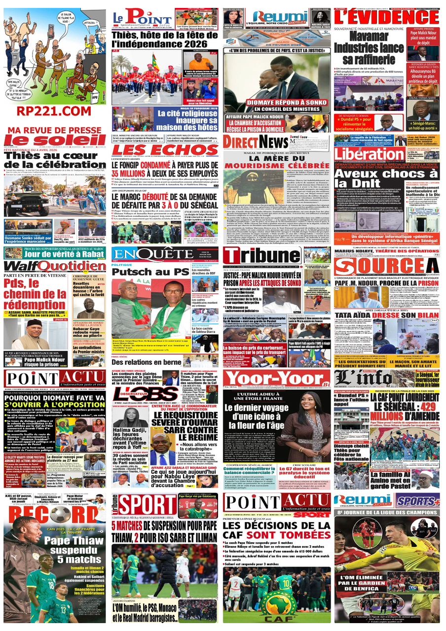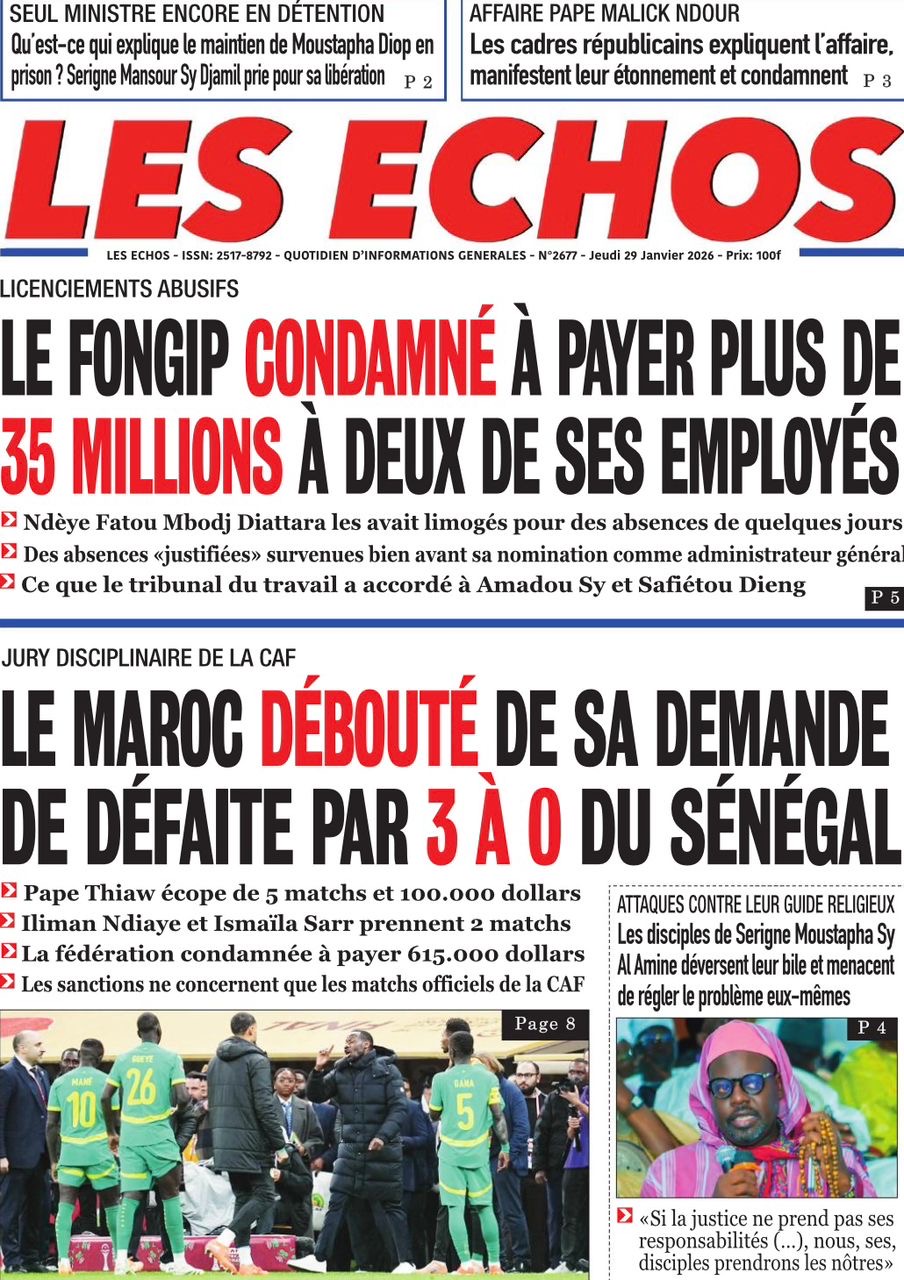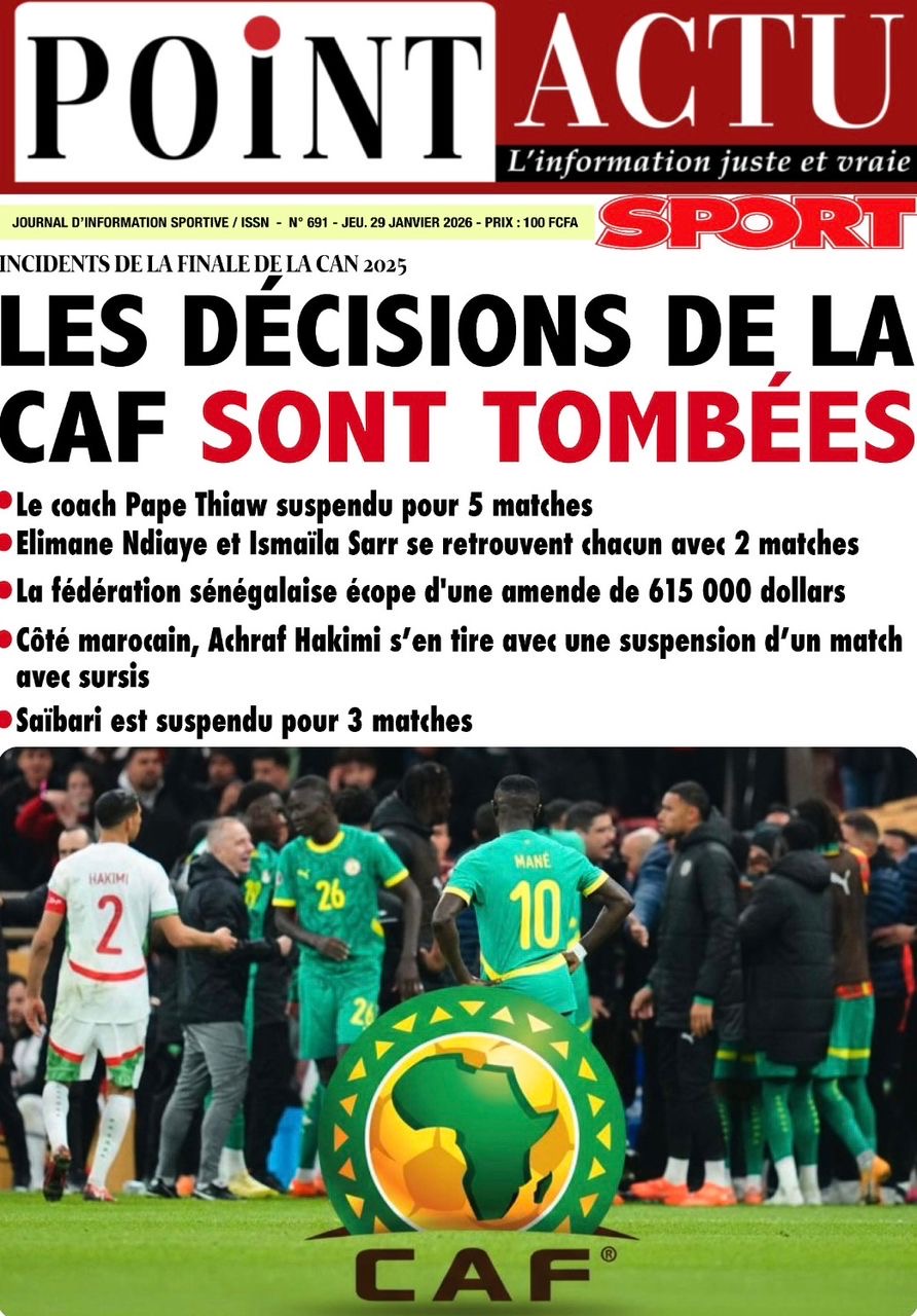Les journaux sénégalais du jeudi 29 janvier 2026 mettent en exergue les sanctions de la CAF contre le football sénégalais, suite aux incidents survenus lors de la finale de la CAN 2025 remportée par les Lions face au Maroc. Il y a aussi le choix de Thiès pour accueillir la célébration en avril des 66 ans de l’indépendance du Sénégal, l’annonce est dans le communiqué du dernier conseil des ministres.