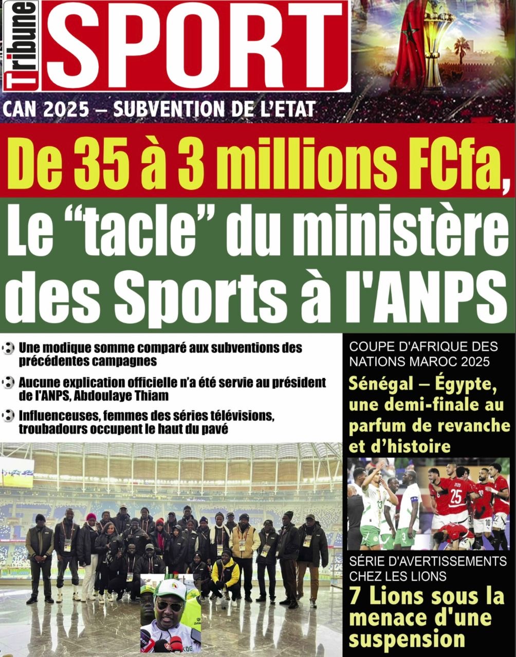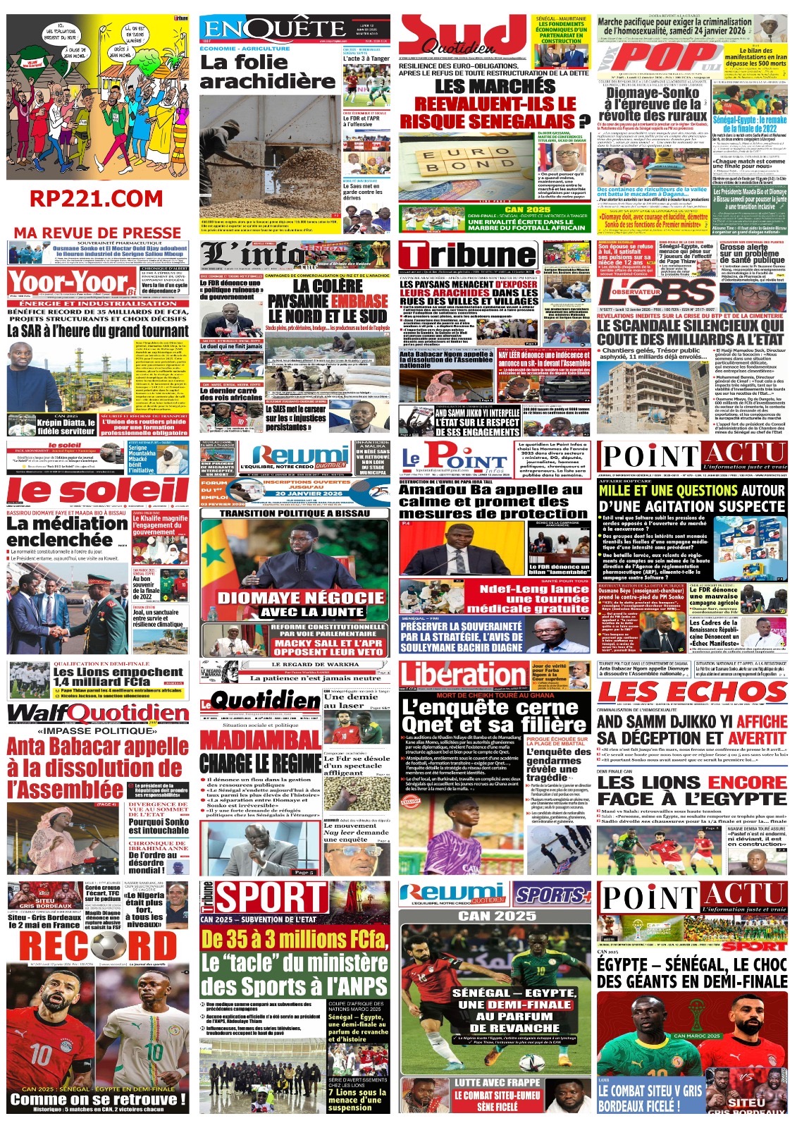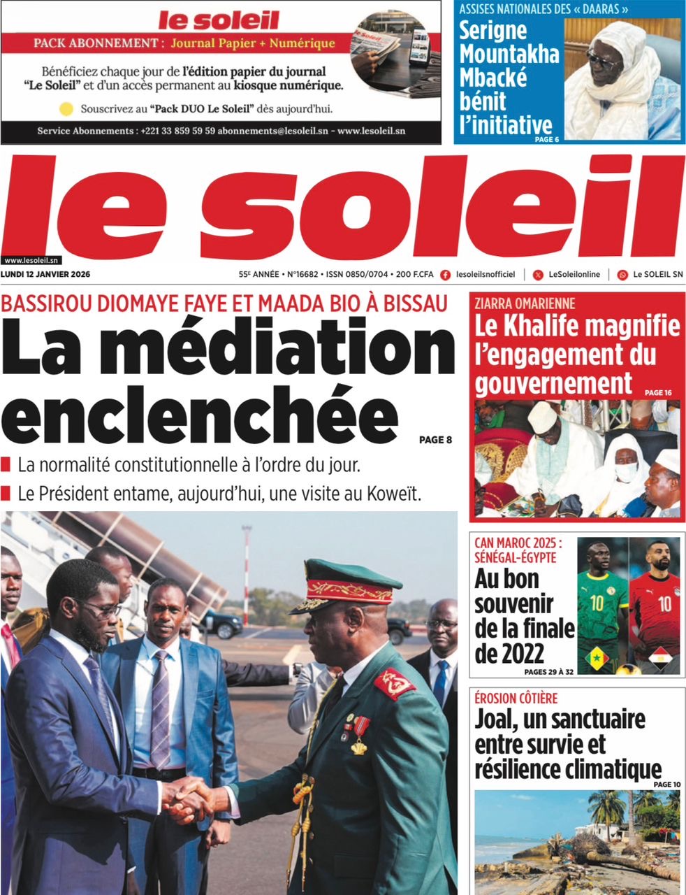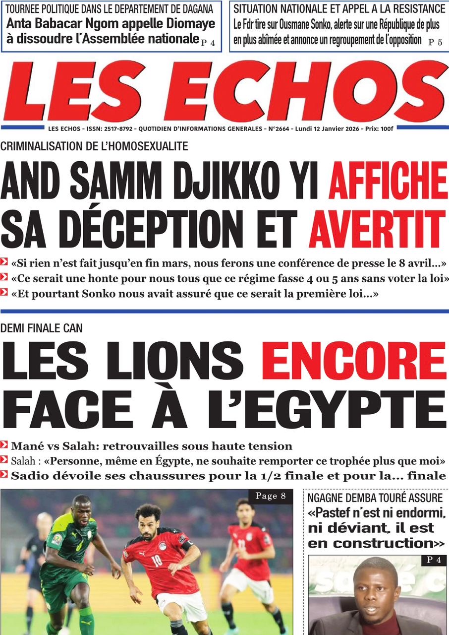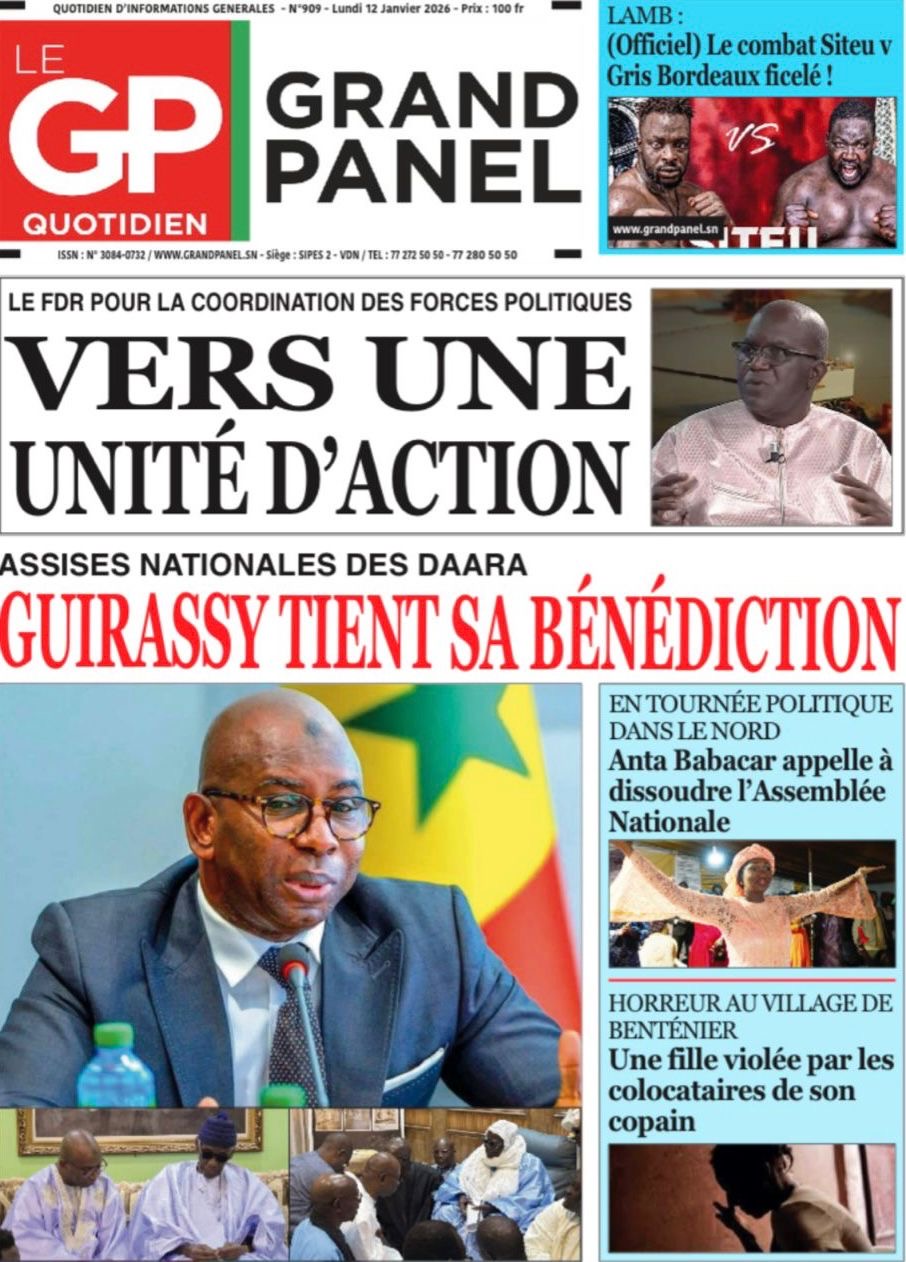 Les journaux sénégalais du lundi 10 janvier 2026 évoquent la médiation à Bissau menée par le Président Bassirou Diomaye Faye aux côtés de son homologue de Sierra Leone Julius Maado Bio, également président en exercice de la CEDEAO, et la qualification des Lions en 1/2 finales de la CAN 2025, avec le match à disputer contre l’Egypte.