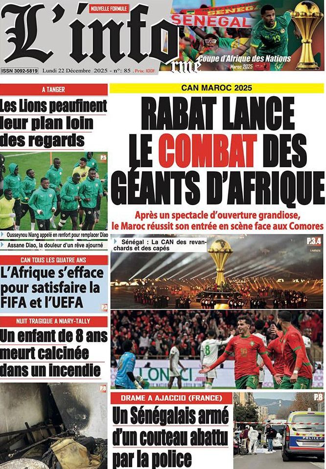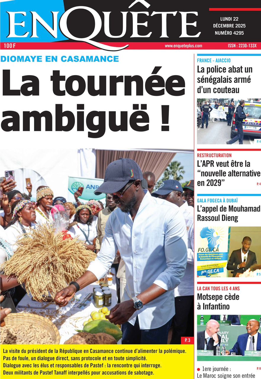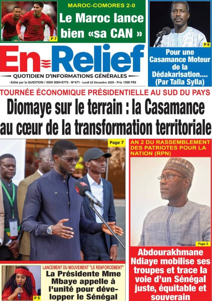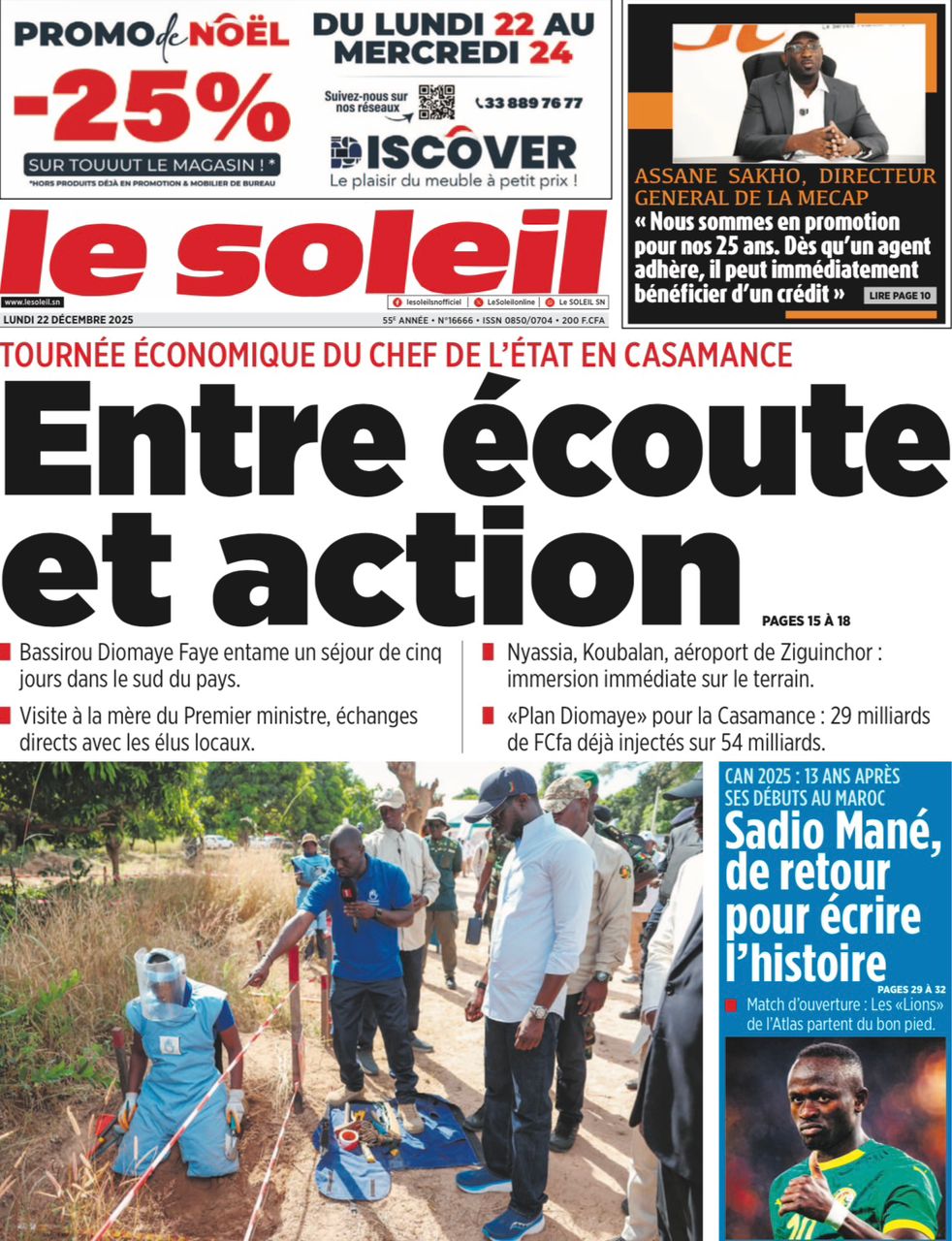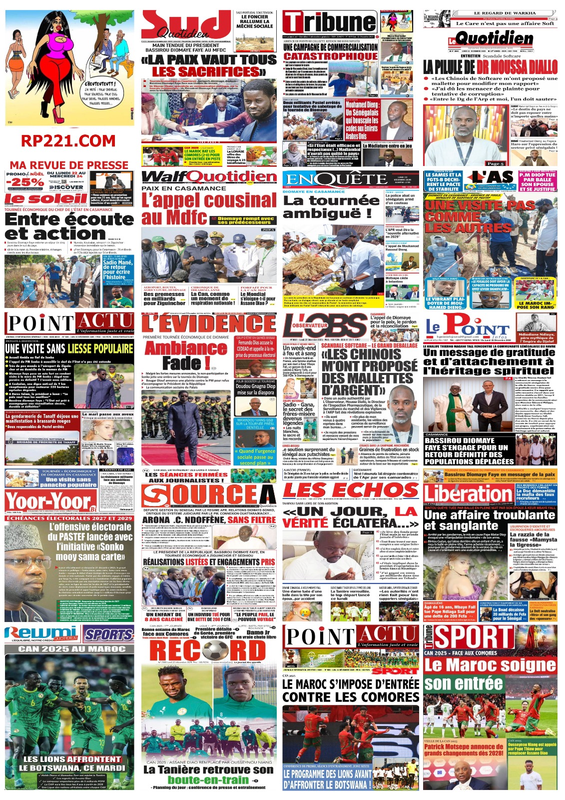 Les journaux sénégalais du lundi 22 décembre 2025 : les sujets phares sont la tournée économique du Président Bassirou Diomaye Faye en Casamance, le début de la CAN 2025 et des drames survenus, dans le pays et en France.