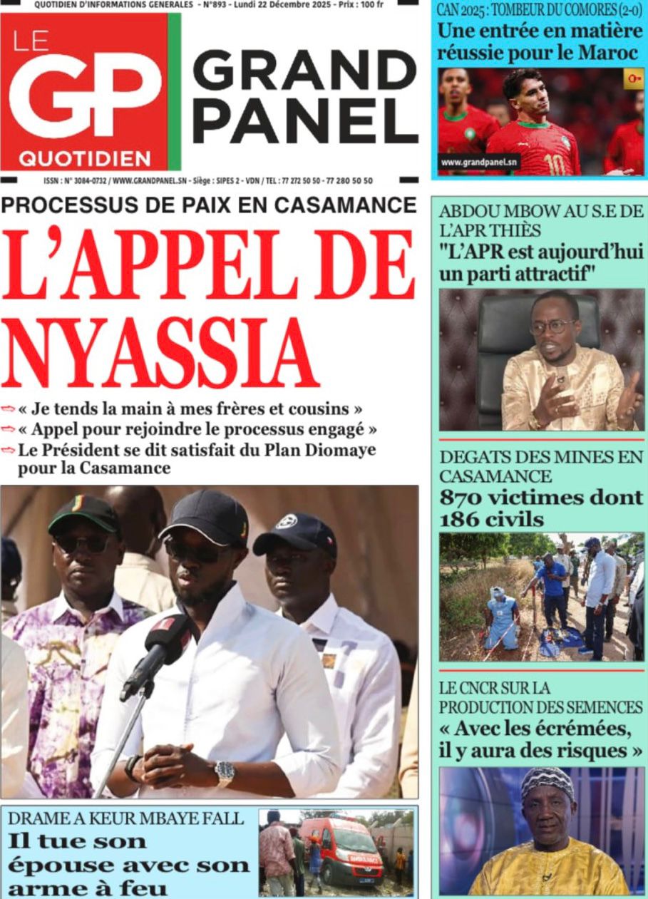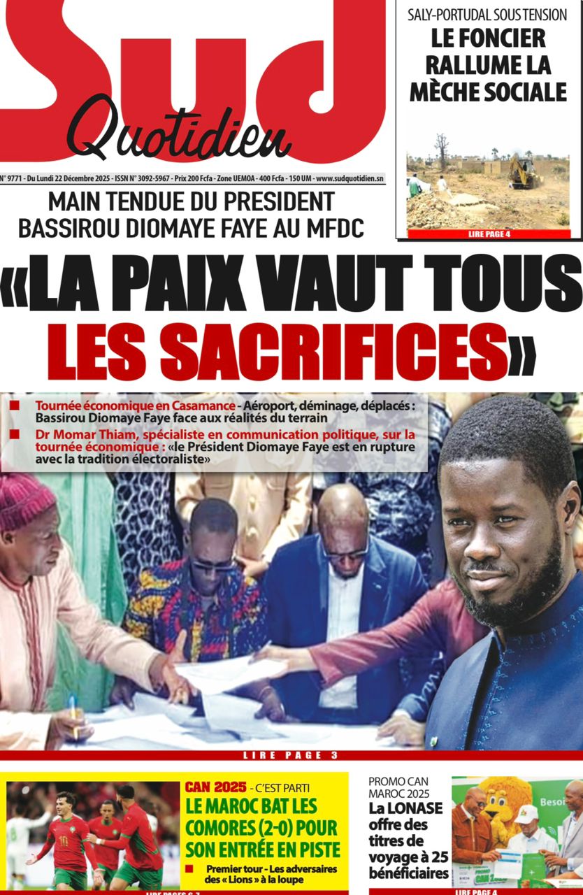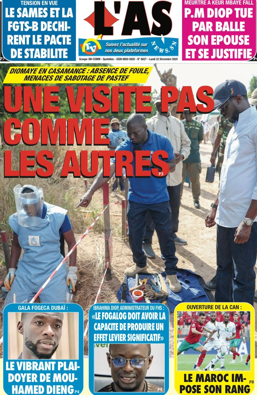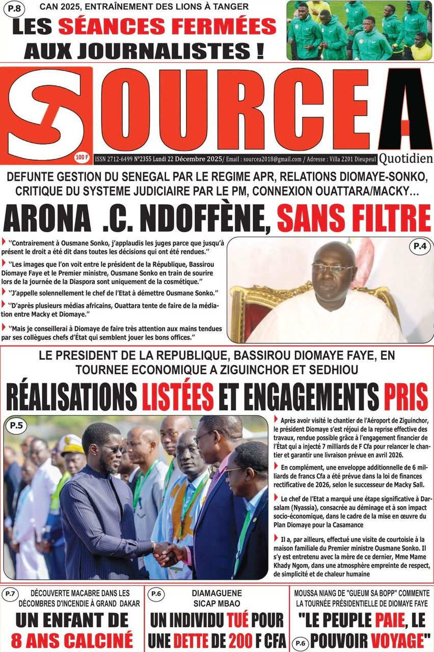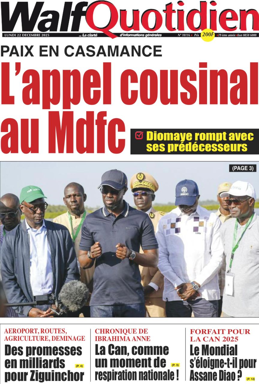 Les journaux sénégalais du lundi 22 décembre 2025 : les sujets phares sont la tournée économique du Président Bassirou Diomaye Faye en Casamance, le début de la CAN 2025 et des drames survenus, dans le pays et en France.