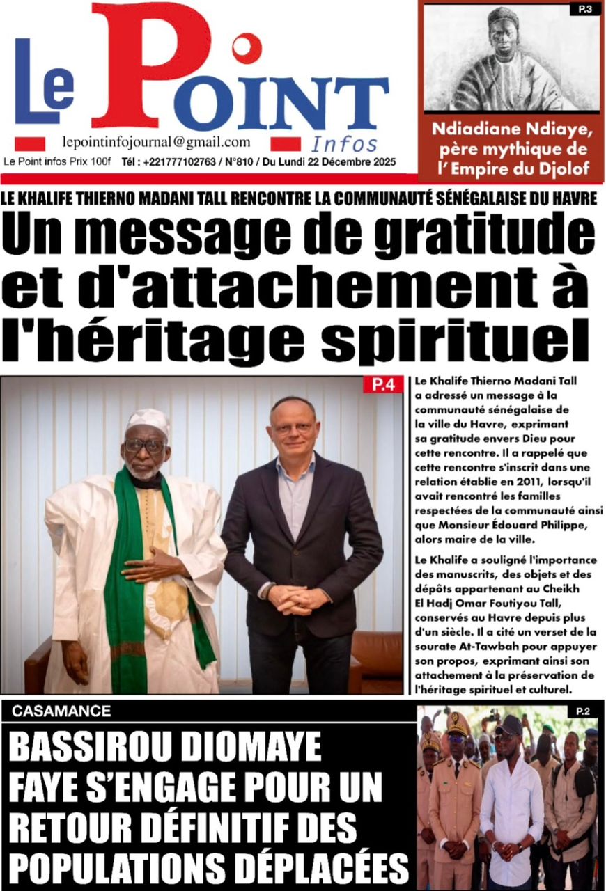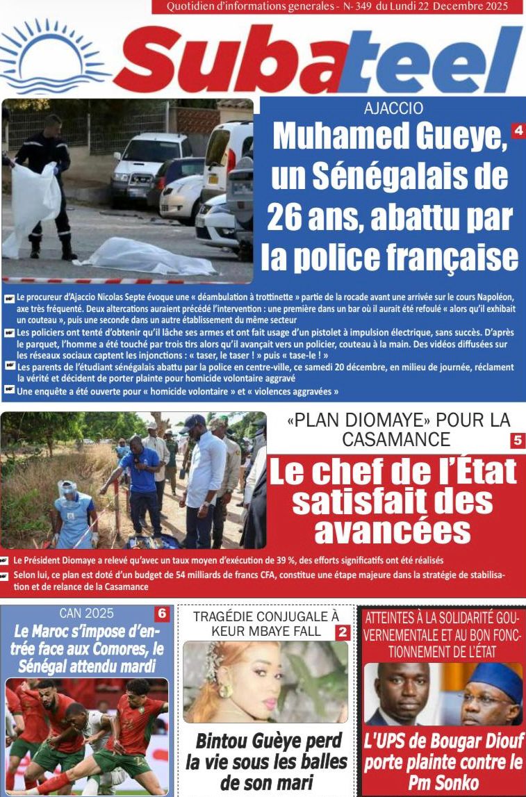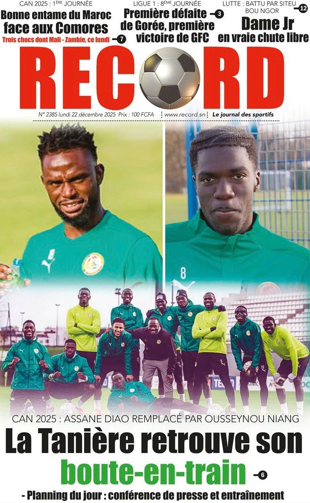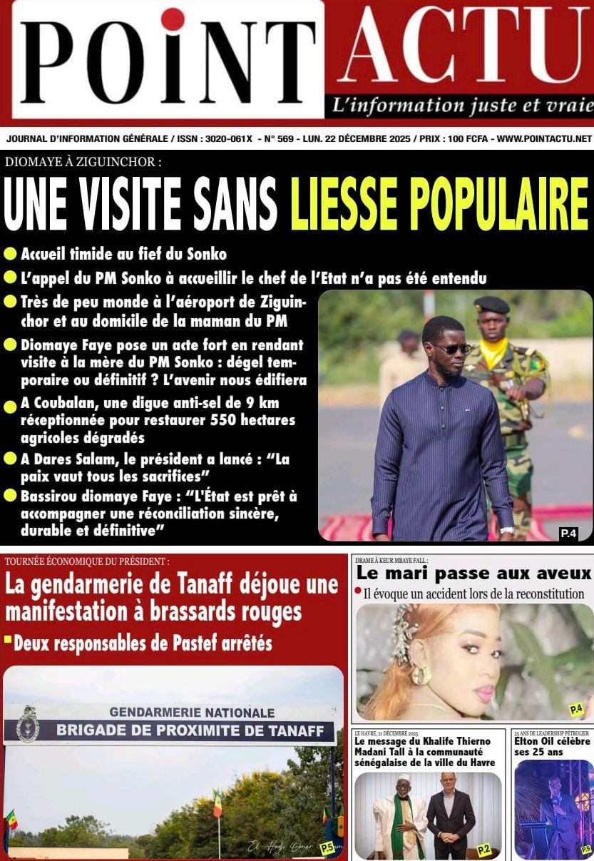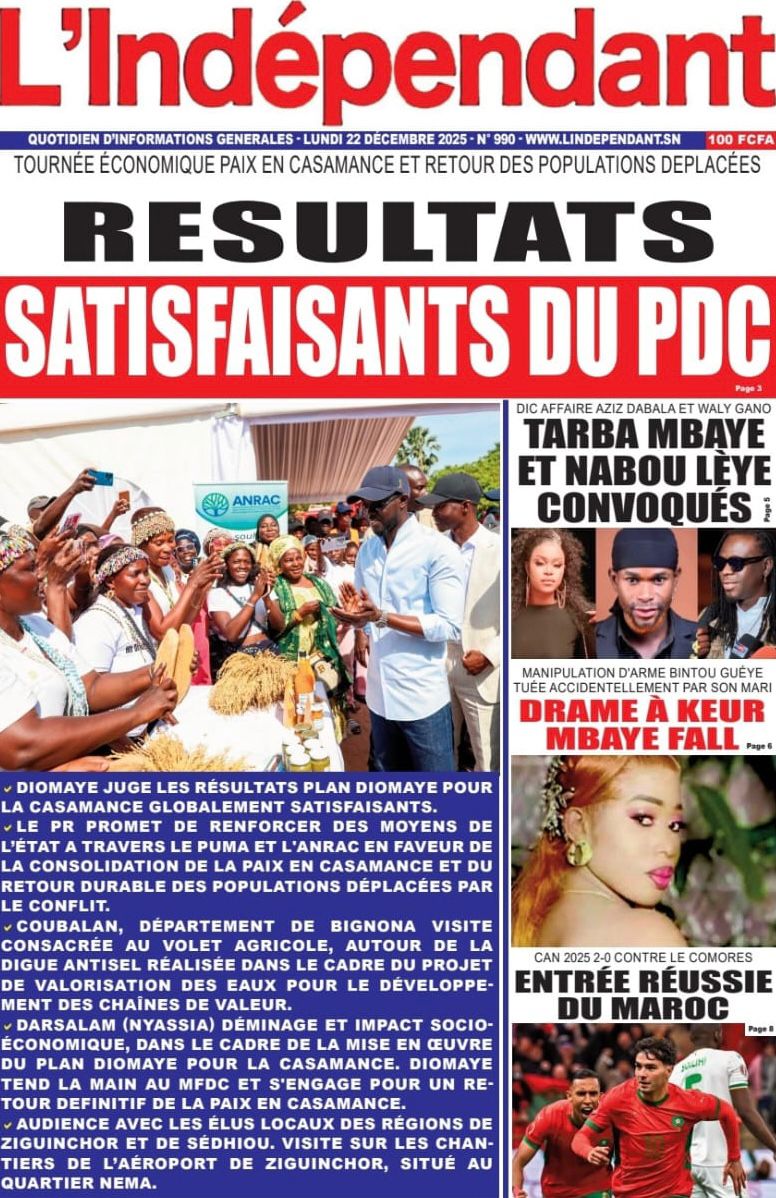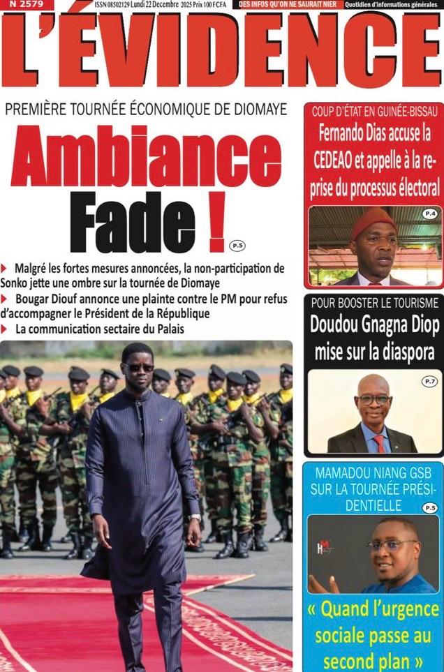 Les journaux sénégalais du lundi 22 décembre 2025 : les sujets phares sont la tournée économique du Président Bassirou Diomaye Faye en Casamance, le début de la CAN 2025 et des drames survenus, dans le pays et en France.