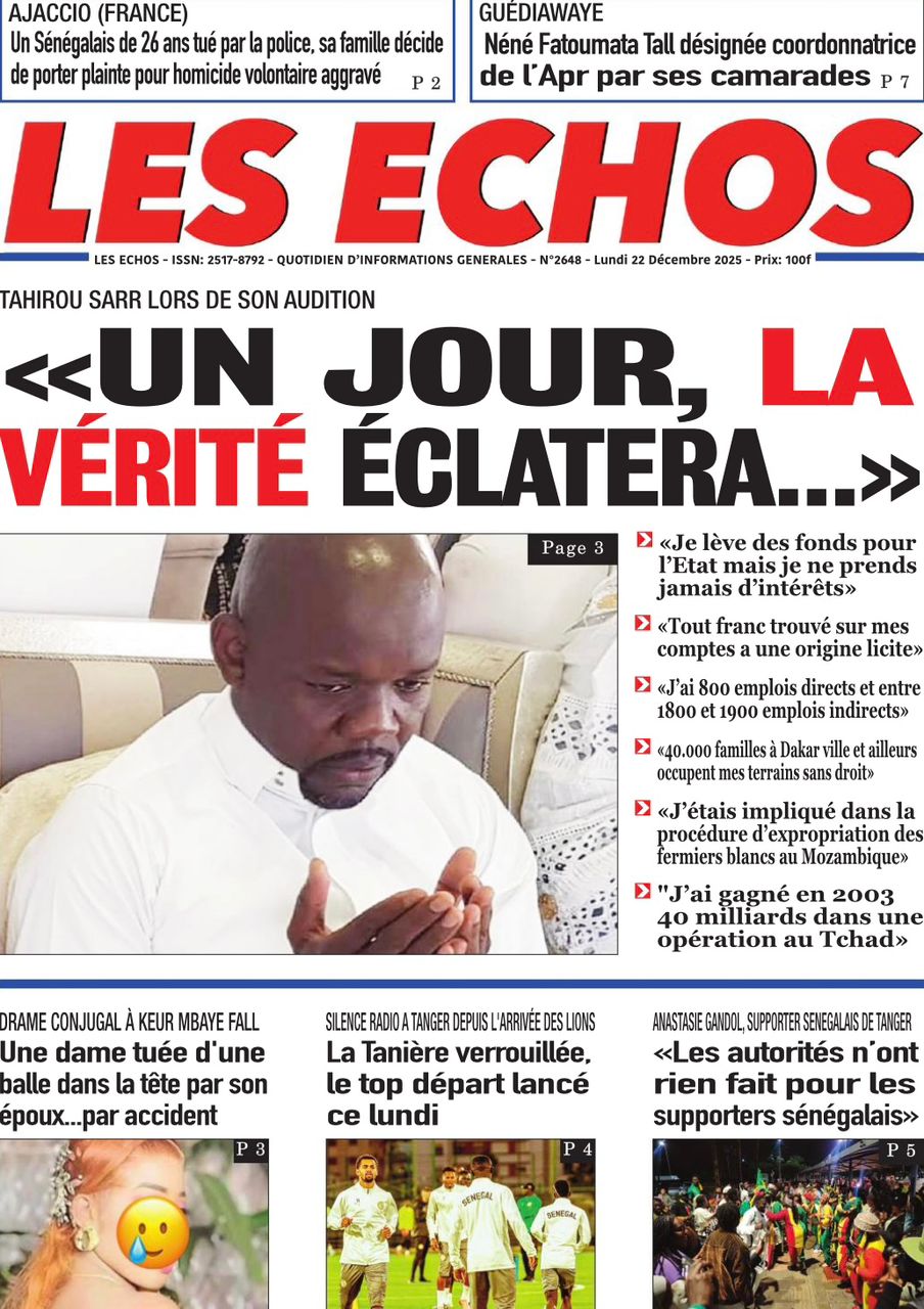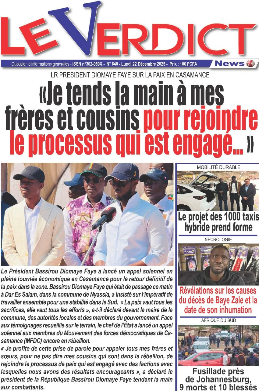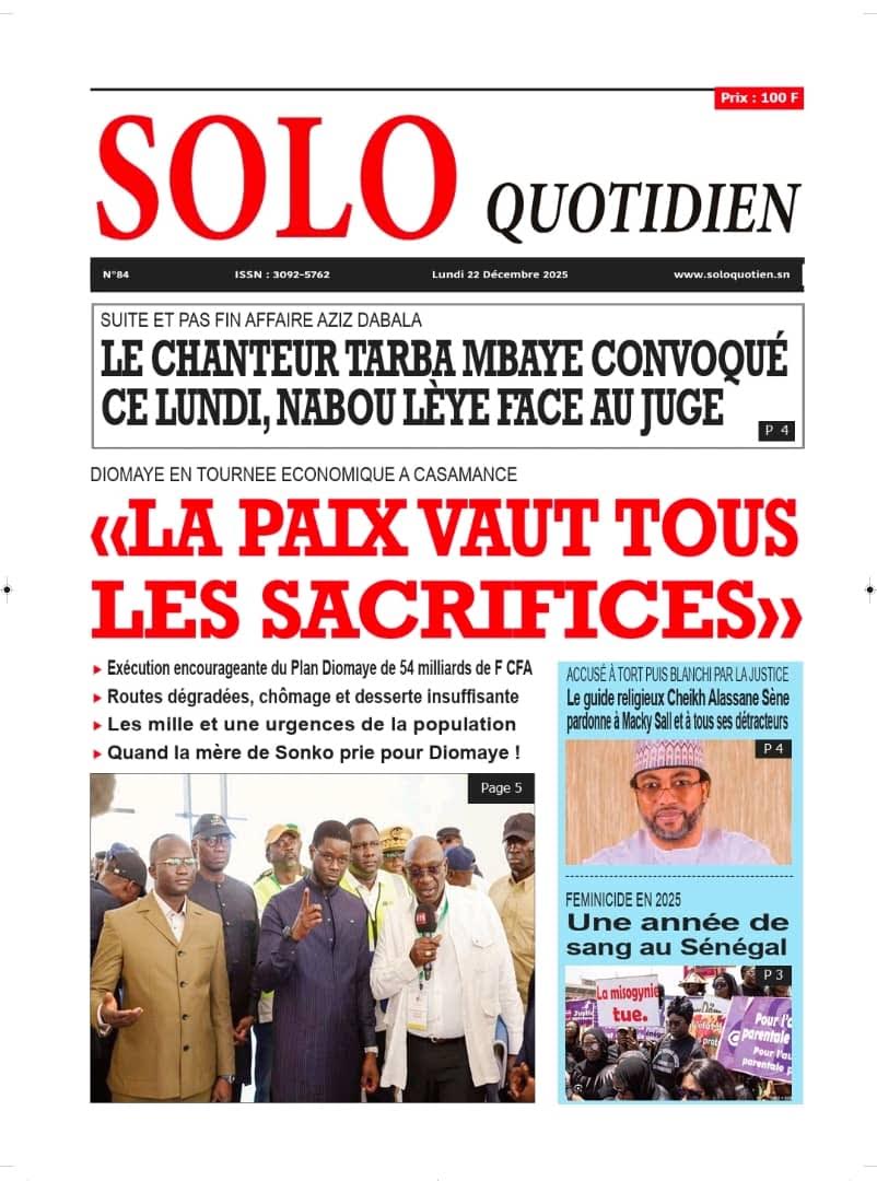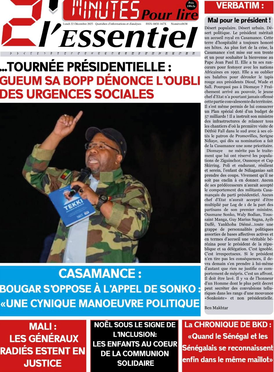 Les journaux sénégalais du lundi 22 décembre 2025 : les sujets phares sont la tournée économique du Président Bassirou Diomaye Faye en Casamance, le début de la CAN 2025 et des drames survenus, dans le pays et en France.