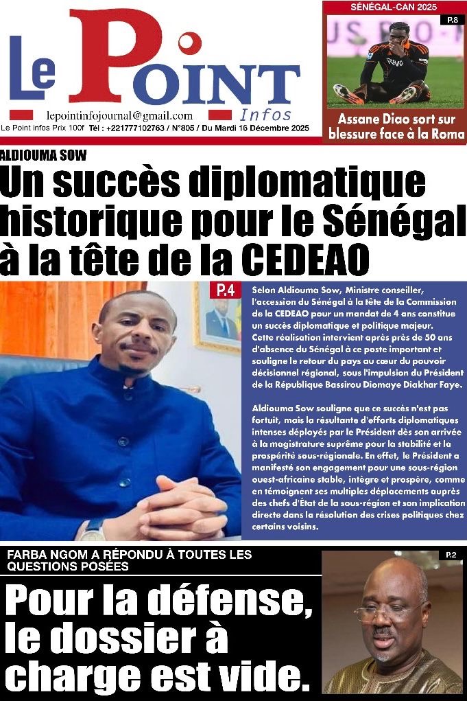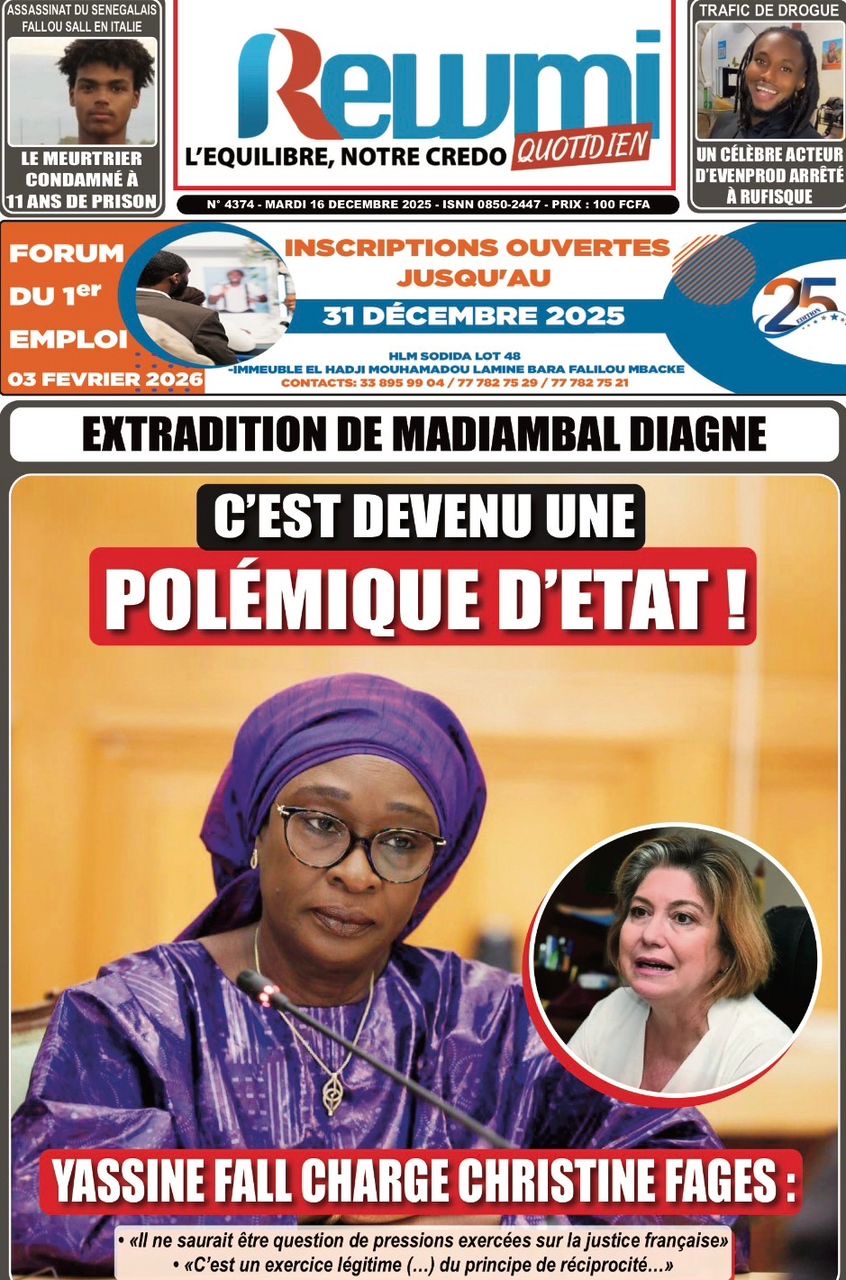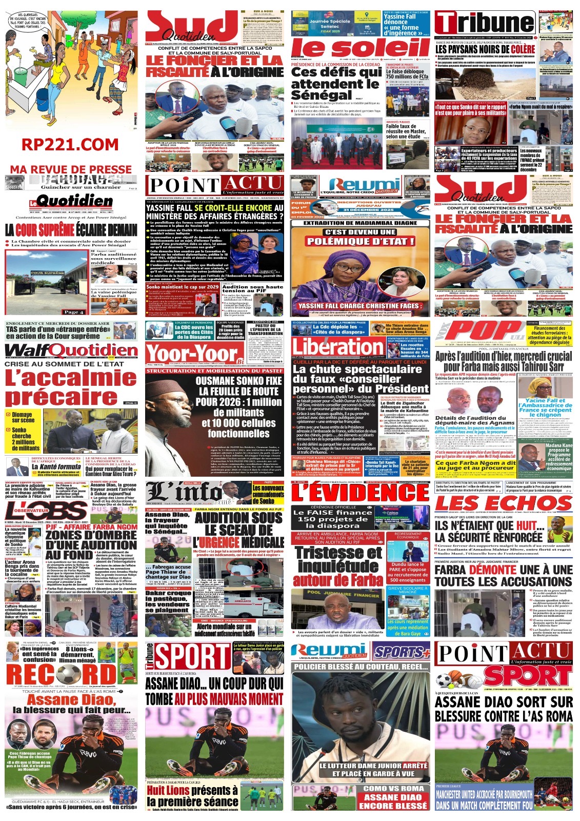 Entre autres sujets, les publications mettent en exergue la passe d’armes autour de l’affaire de l’extradition de Madiambal Diagne entre l’Ambassadrice de France et le ministère de la Justice, la volonté d’Ousmane Sonko de réorganiser son parti le Pastef les Patriotes et le début du regroupement des Lions en direction de la CAN 2025, prévue au Maroc à partit du 21 décembre.