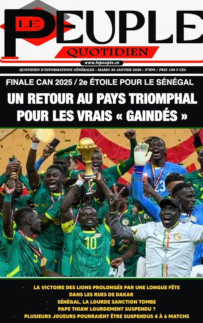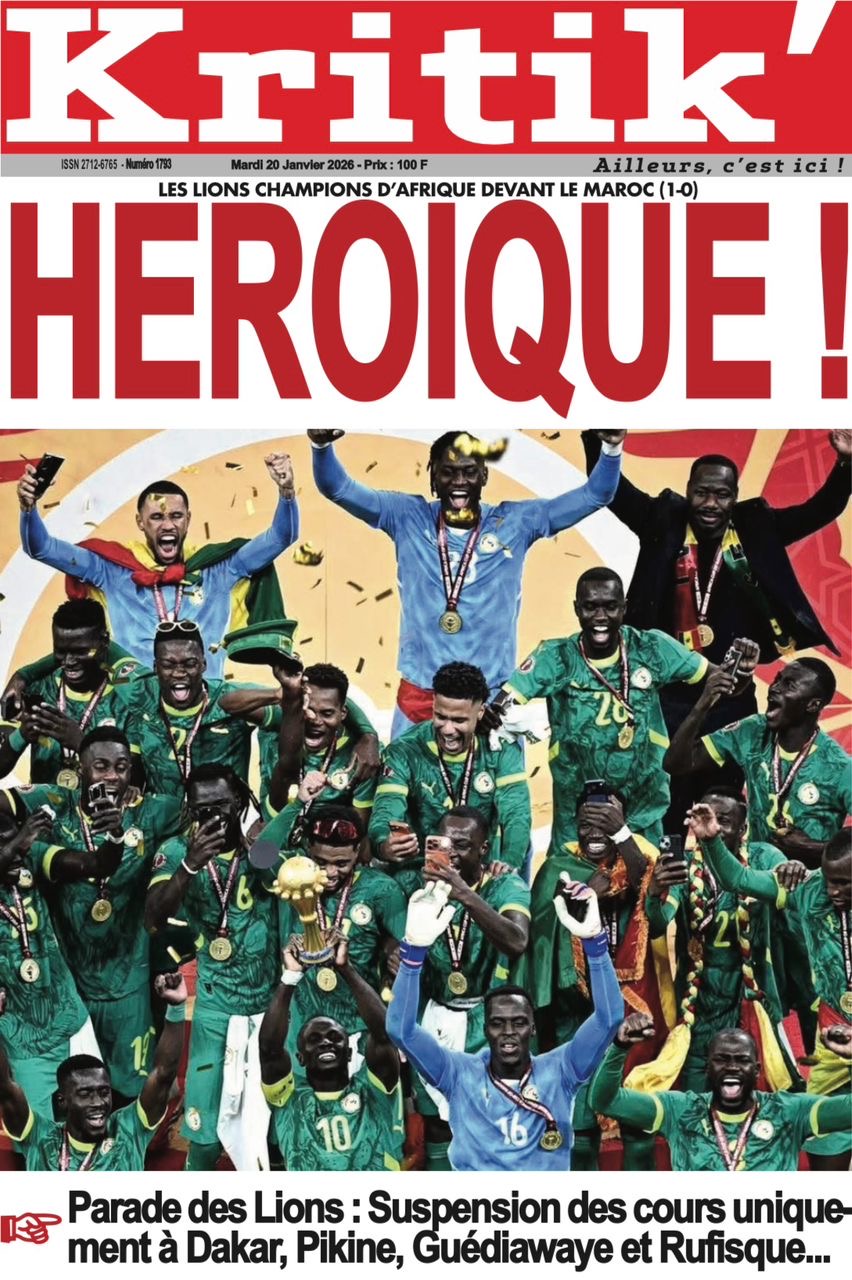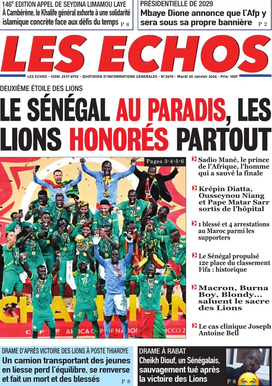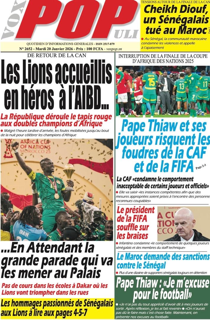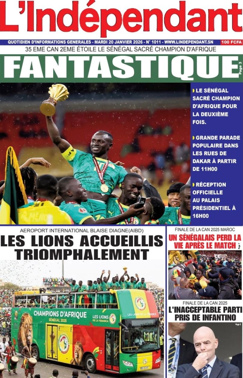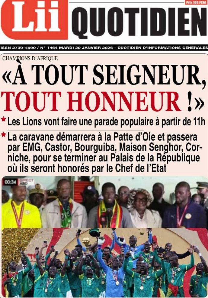Les journaux sénégalais du mardi 20 janvier 2026 est toujours aux couleurs du sacre des Lions à la CAN 2025 et l’accueil triomphal à eux réservé lors de leur retour au bercail.