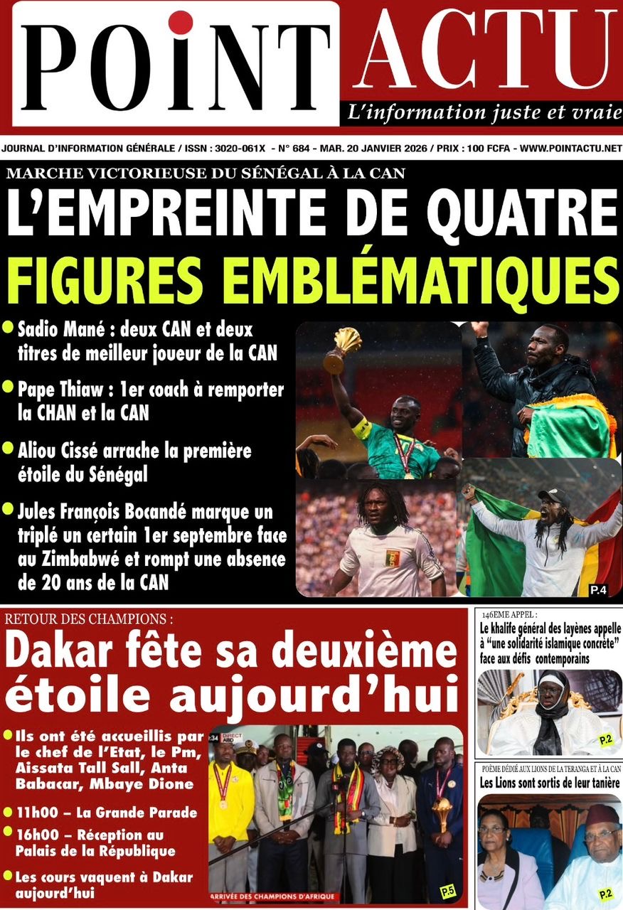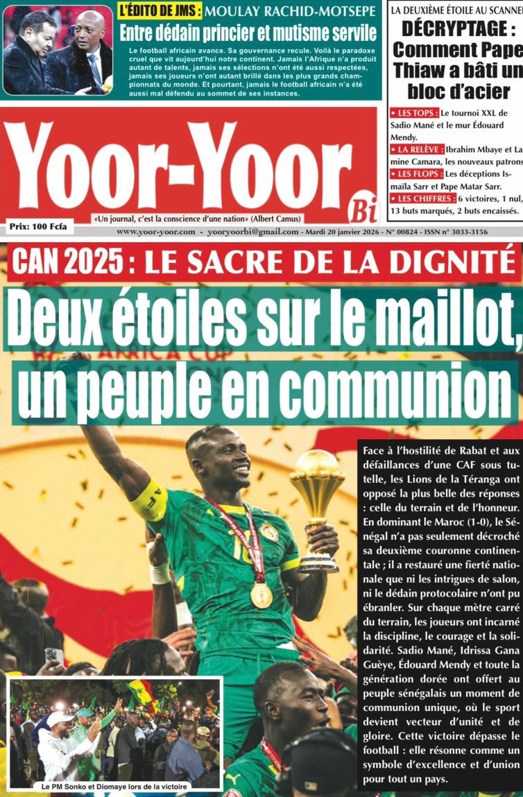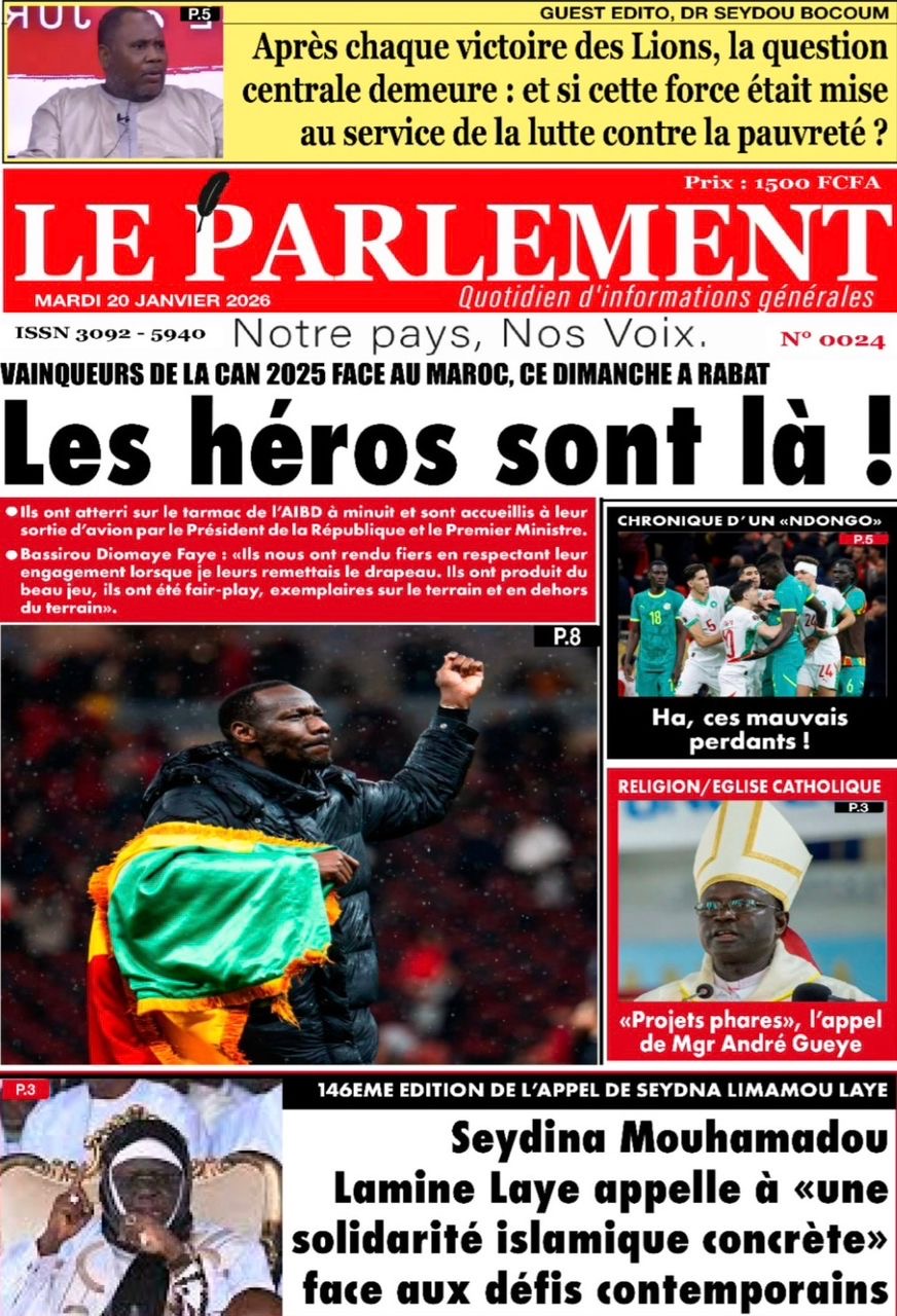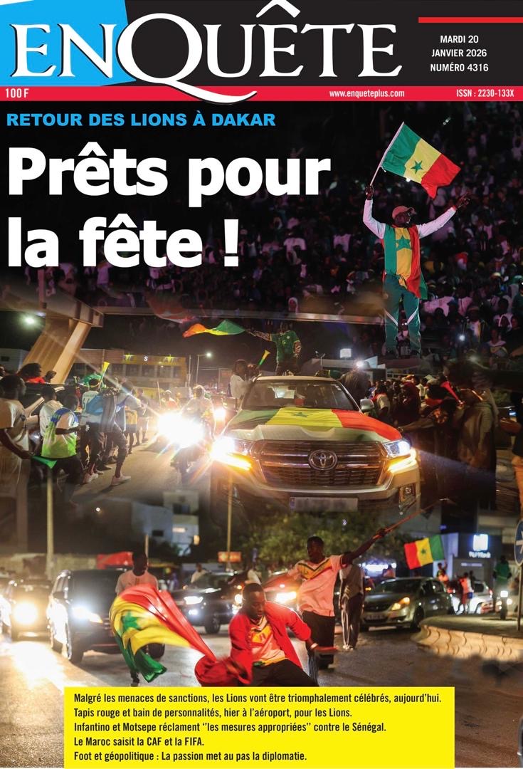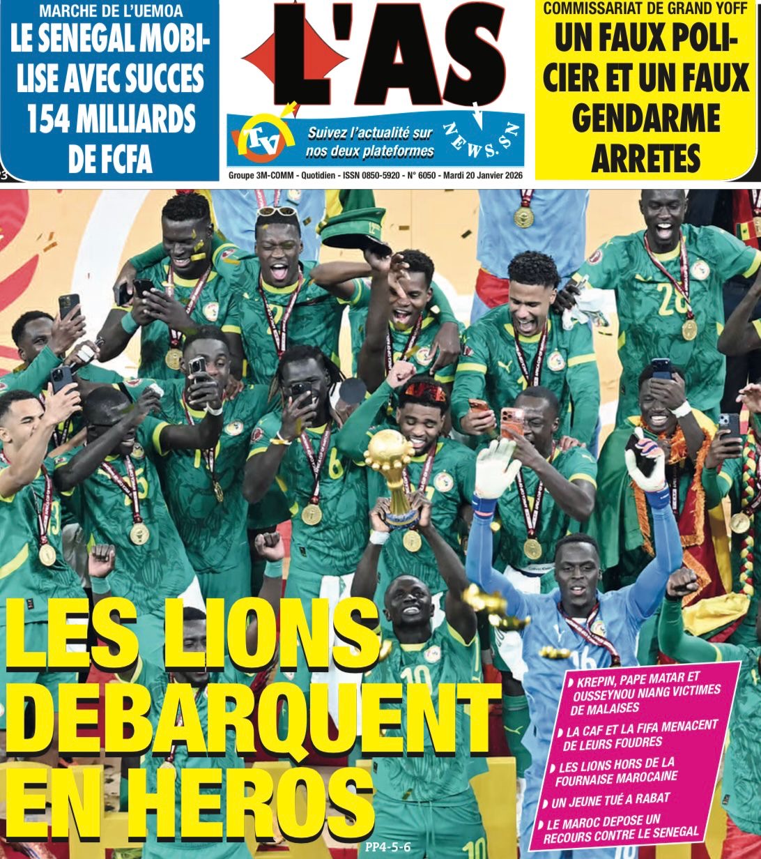 Les journaux sénégalais du mardi 20 janvier 2026 est toujours aux couleurs du sacre des Lions à la CAN 2025 et l’accueil triomphal à eux réservé lors de leur retour au bercail.