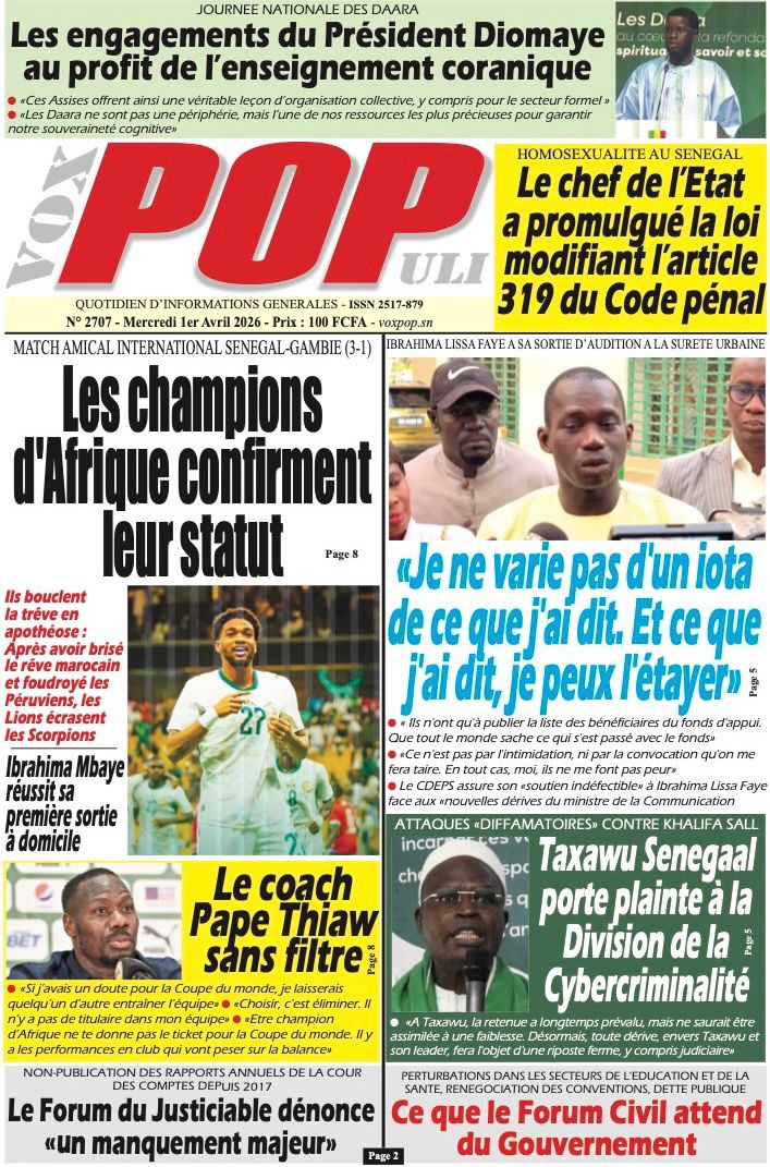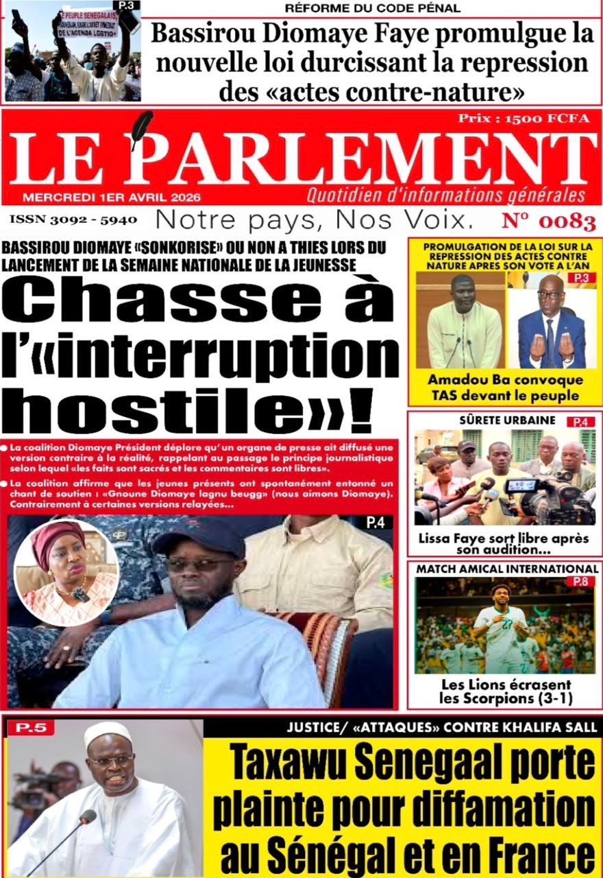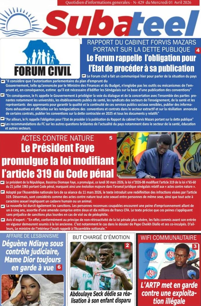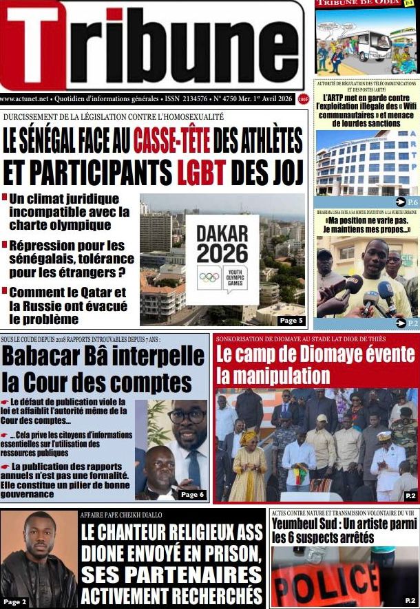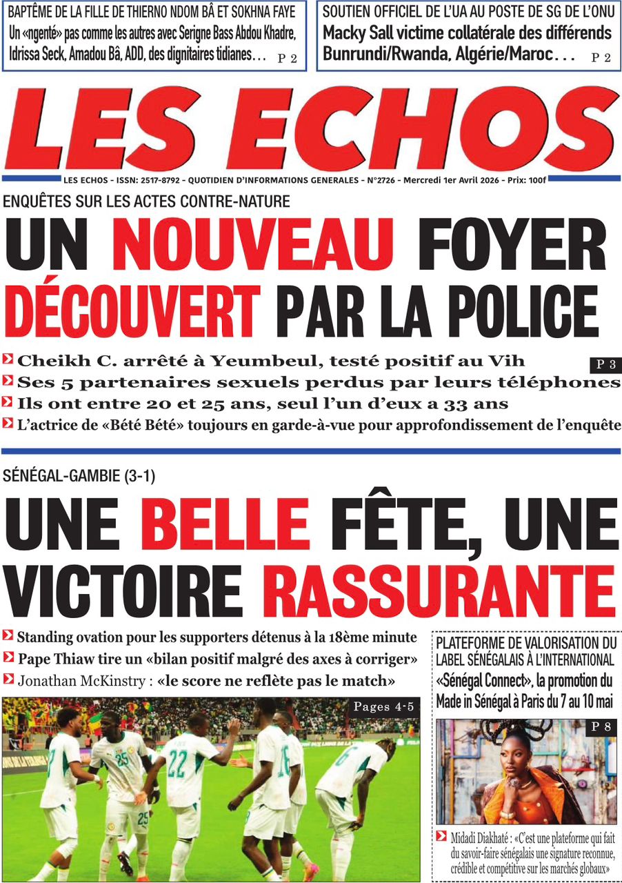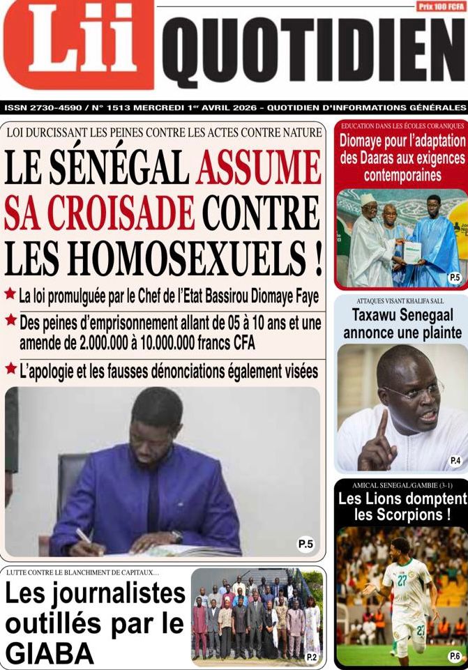 Les journaux sénégalais du mercredi 01 avril 2026 ont des UNES dominées par la promulgation par le Président de la République de la loi durcissant les peines contre les actes contre-nature, la victoire des Lions contre la Gambie et le dossier judiciaire entre la DER/FJ et la SERTEM autour de 74 milliards CFA.