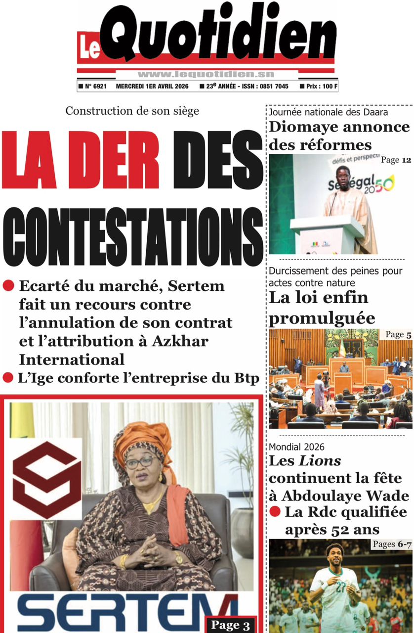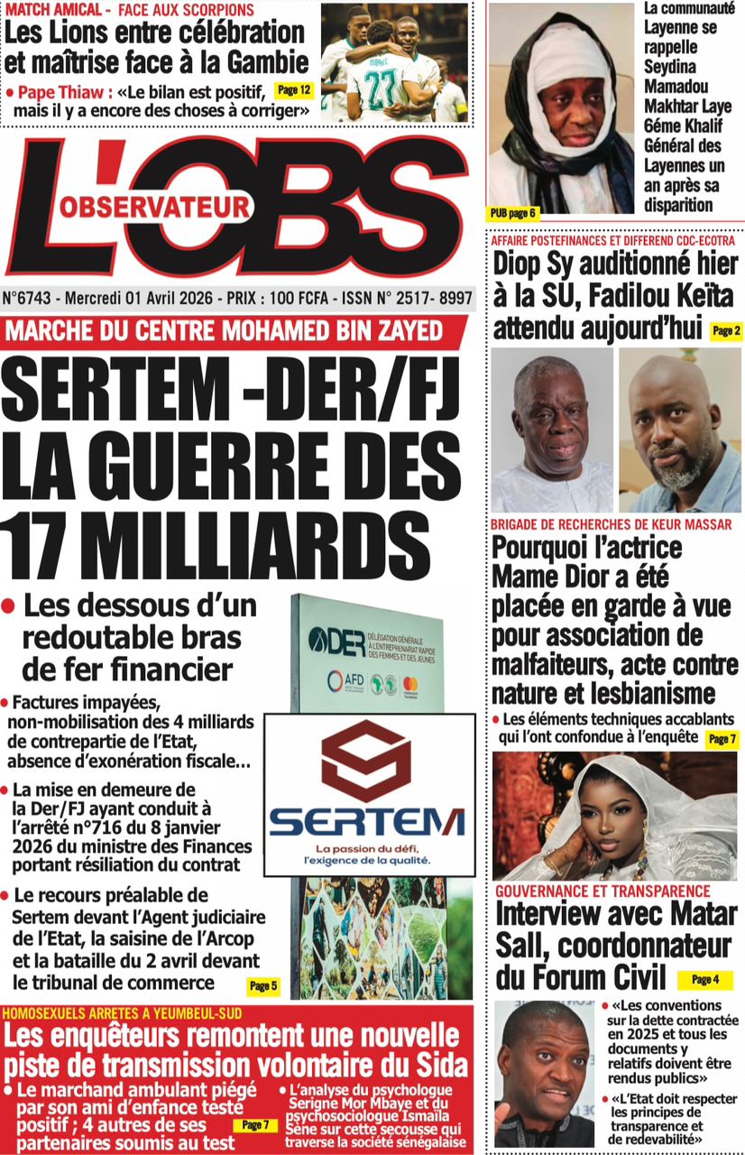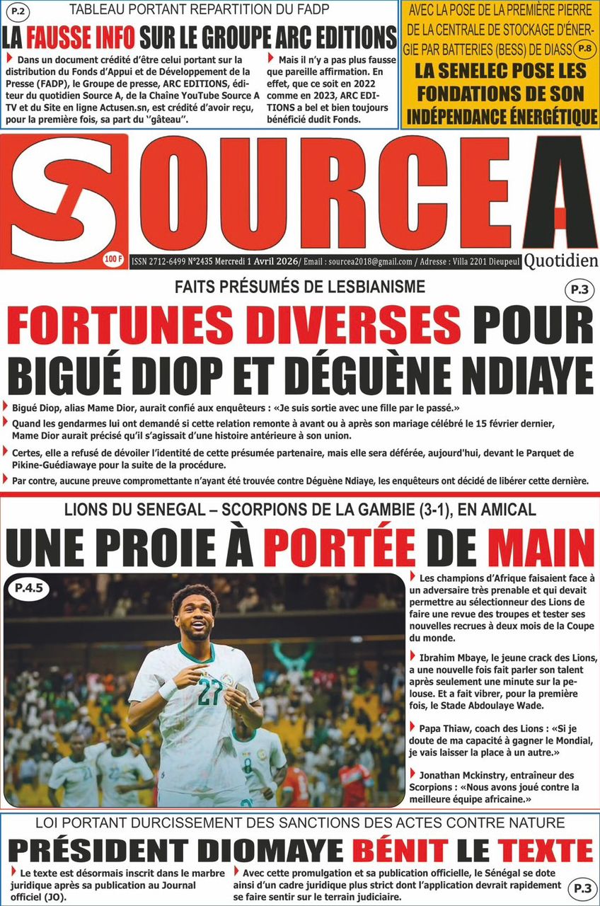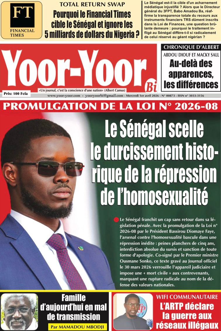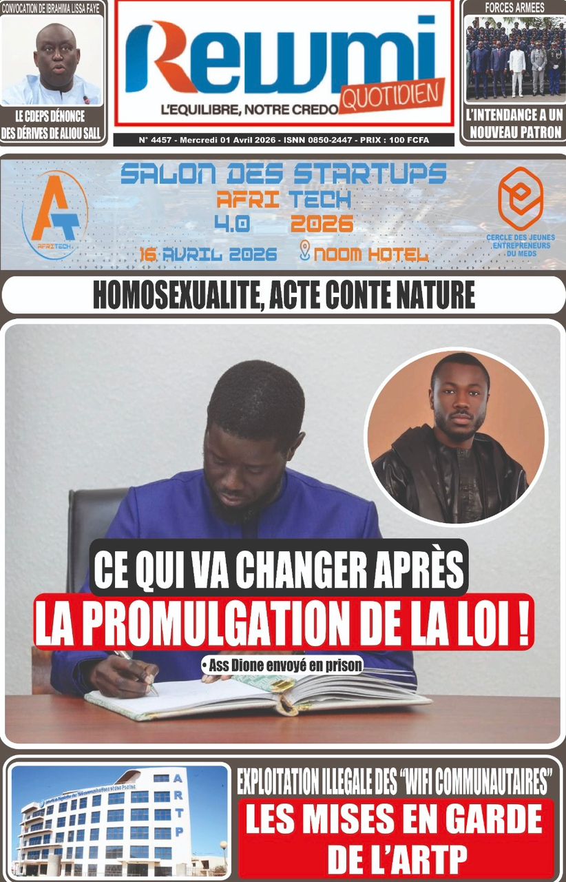 Les journaux sénégalais du mercredi 01 avril 2026 ont des UNES dominées par la promulgation par le Président de la République de la loi durcissant les peines contre les actes contre-nature, la victoire des Lions contre la Gambie et le dossier judiciaire entre la DER/FJ et la SERTEM autour de 74 milliards CFA.