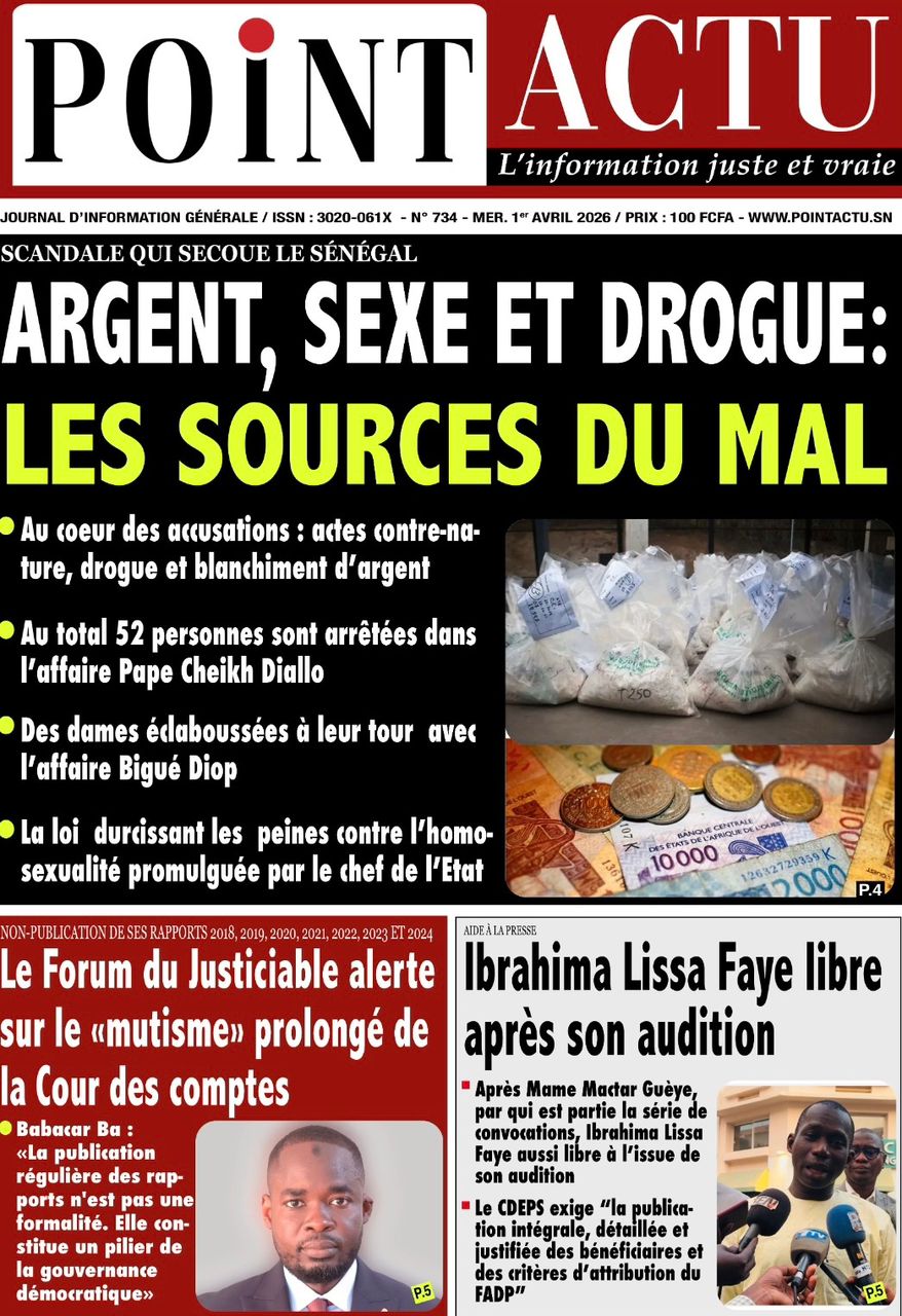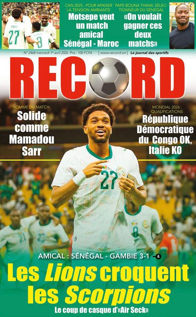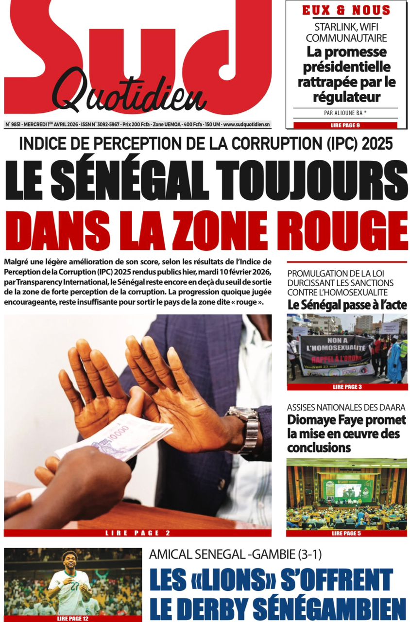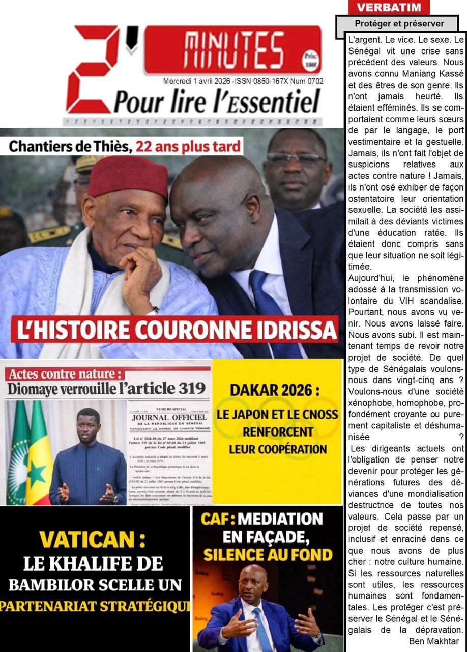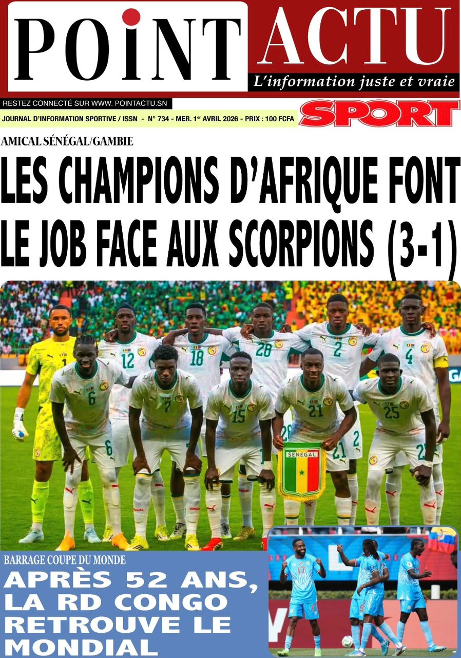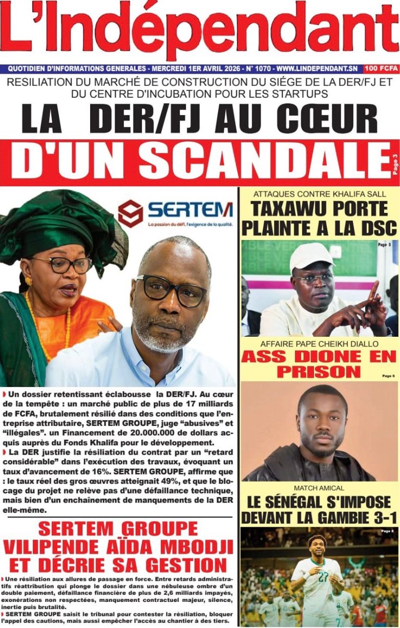 Les journaux sénégalais du mercredi 01 avril 2026 ont des UNES dominées par la promulgation par le Président de la République de la loi durcissant les peines contre les actes contre-nature, la victoire des Lions contre la Gambie et le dossier judiciaire entre la DER/FJ et la SERTEM autour de 74 milliards CFA.