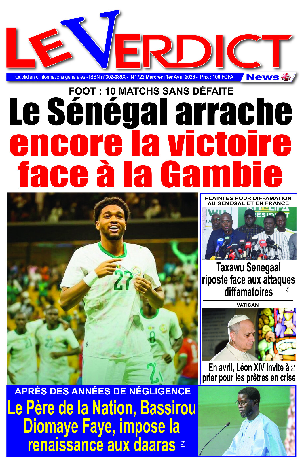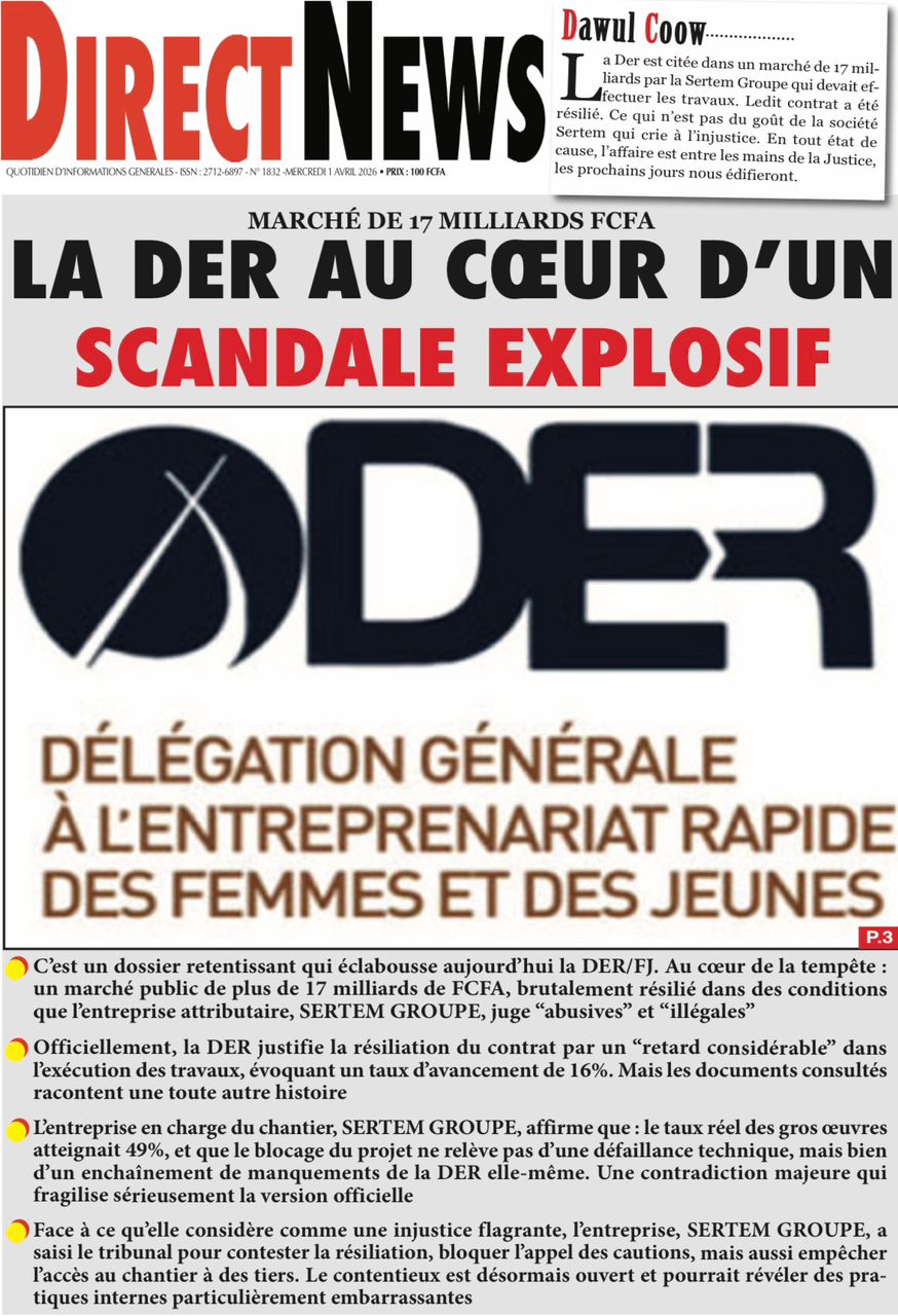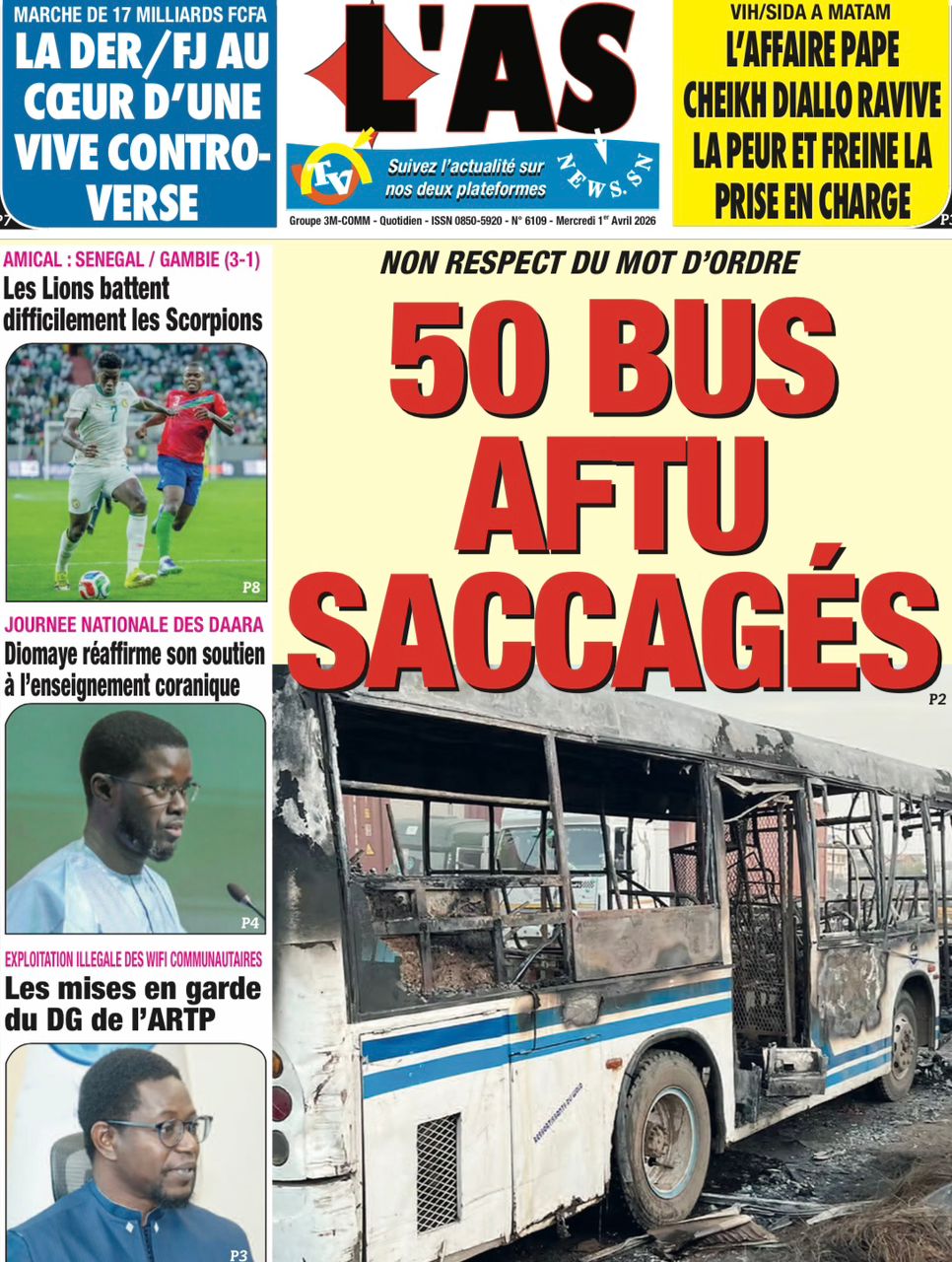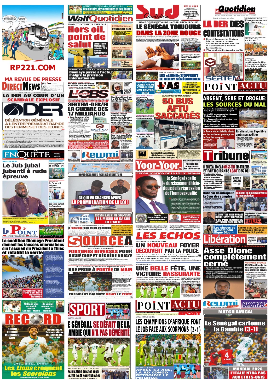 Les journaux sénégalais du mercredi 01 avril 2026 ont des UNES dominées par la promulgation par le Président de la République de la loi durcissant les peines contre les actes contre-nature, la victoire des Lions contre la Gambie et le dossier judiciaire entre la DER/FJ et la SERTEM autour de 74 milliards CFA.