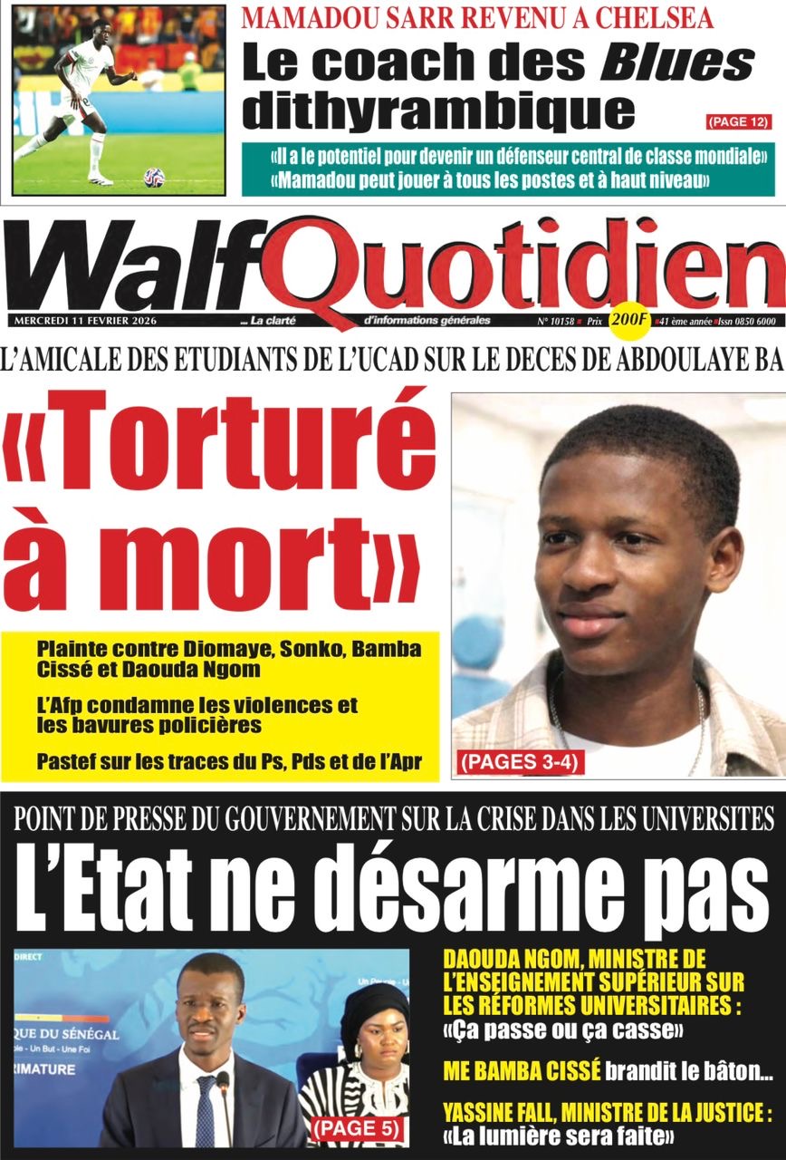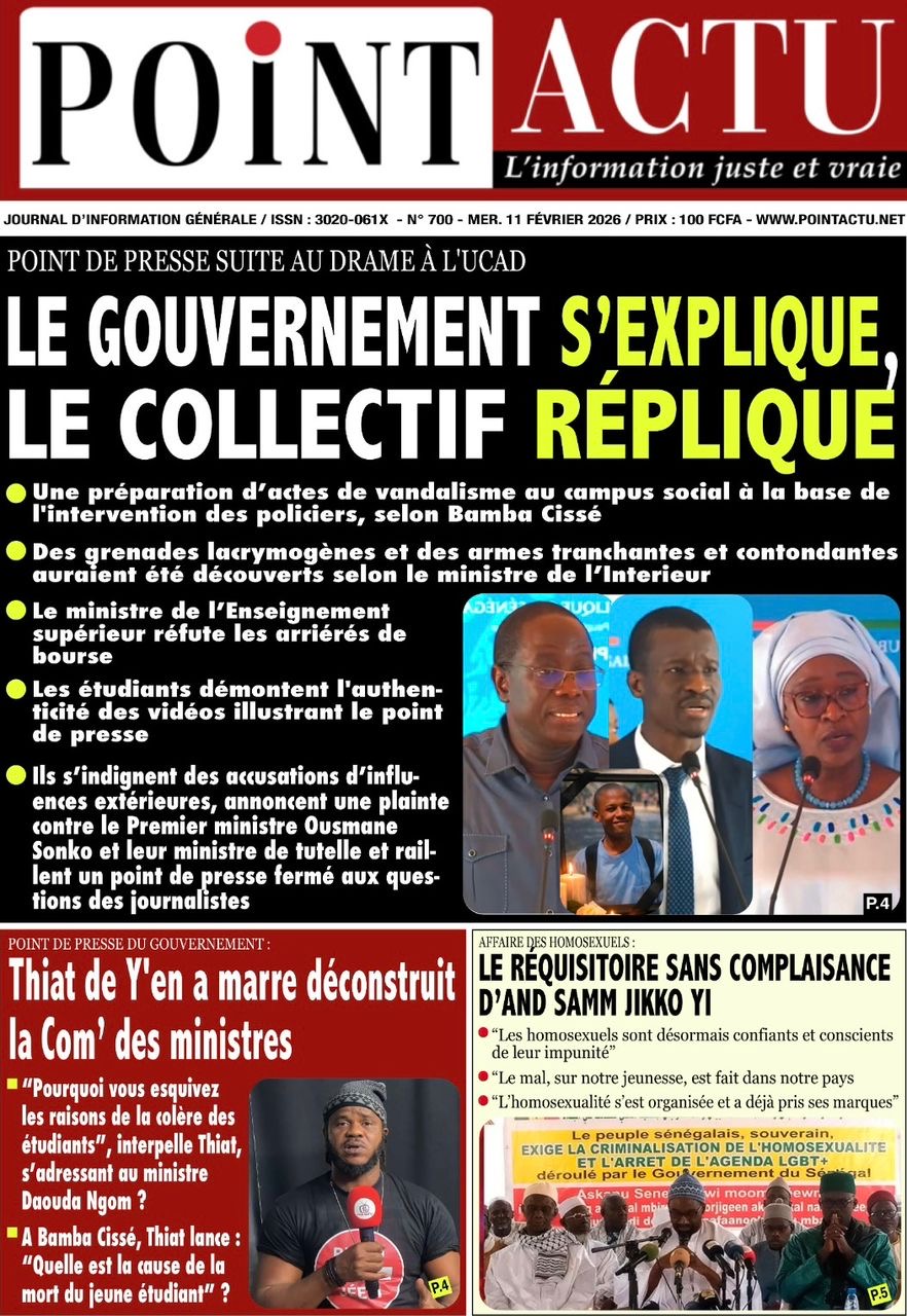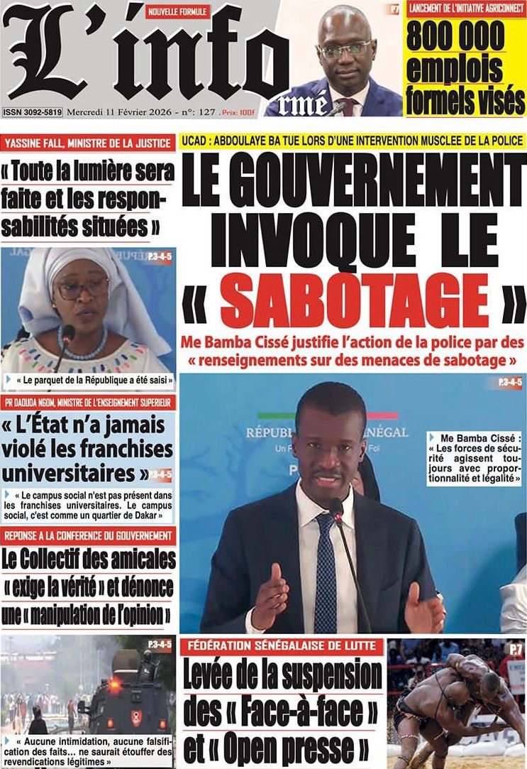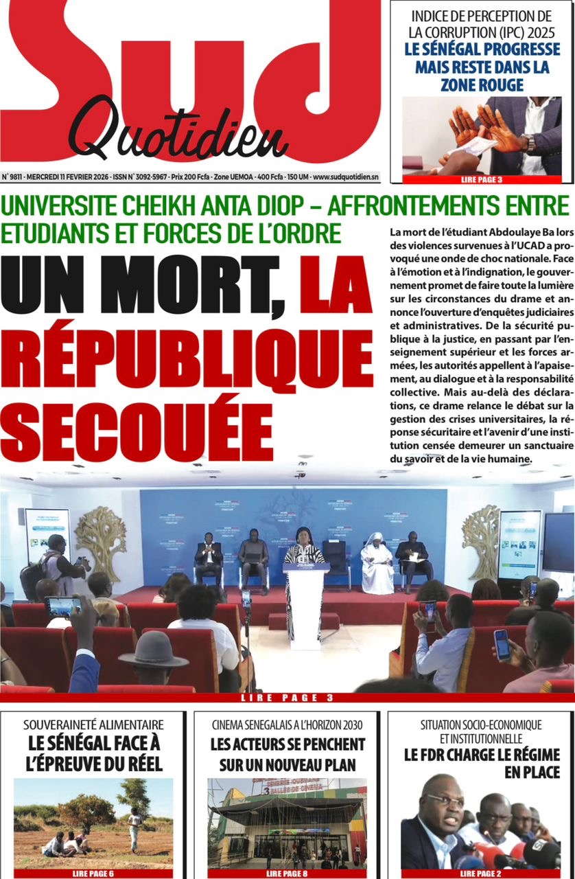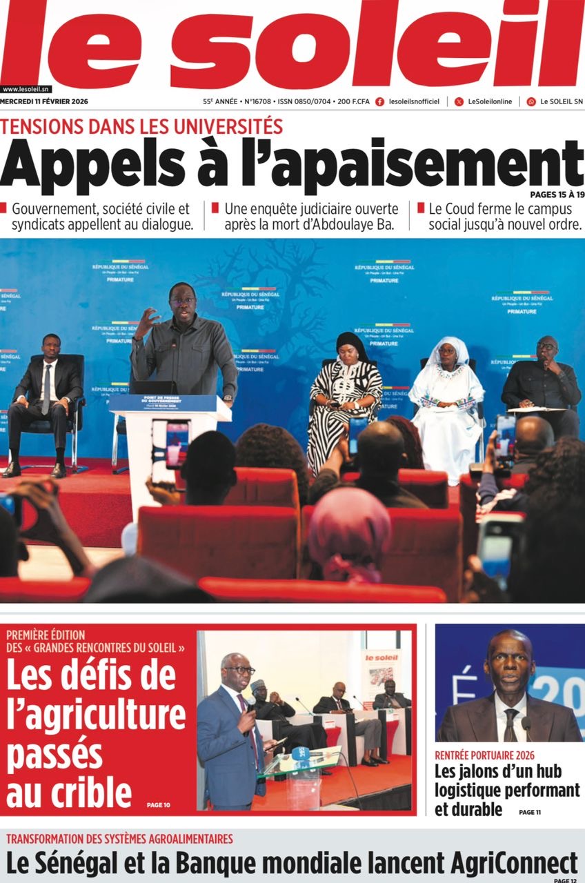 Sénégal : les journaux du mercredi 11 février 2026 sont toujours dans l’actualité de la situation dans les universités avec notamment le point de presse du Gouvernement sur la question, avec à l’animation 4 ministres.