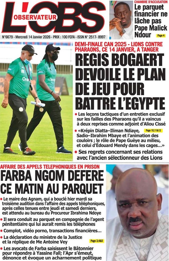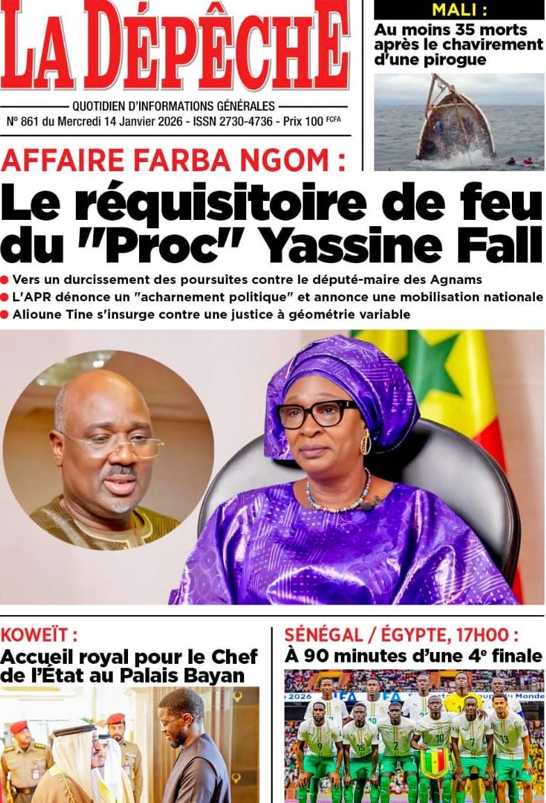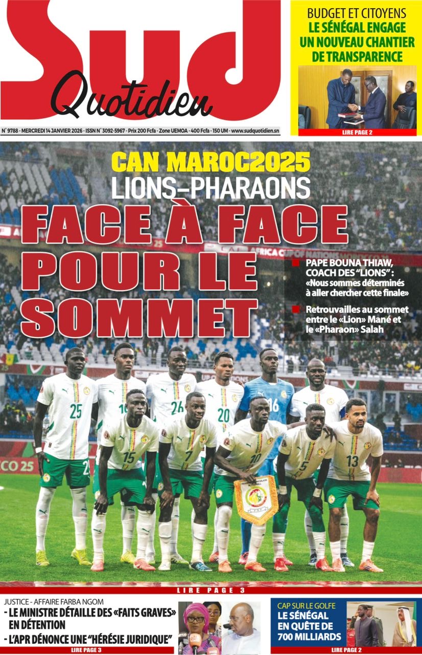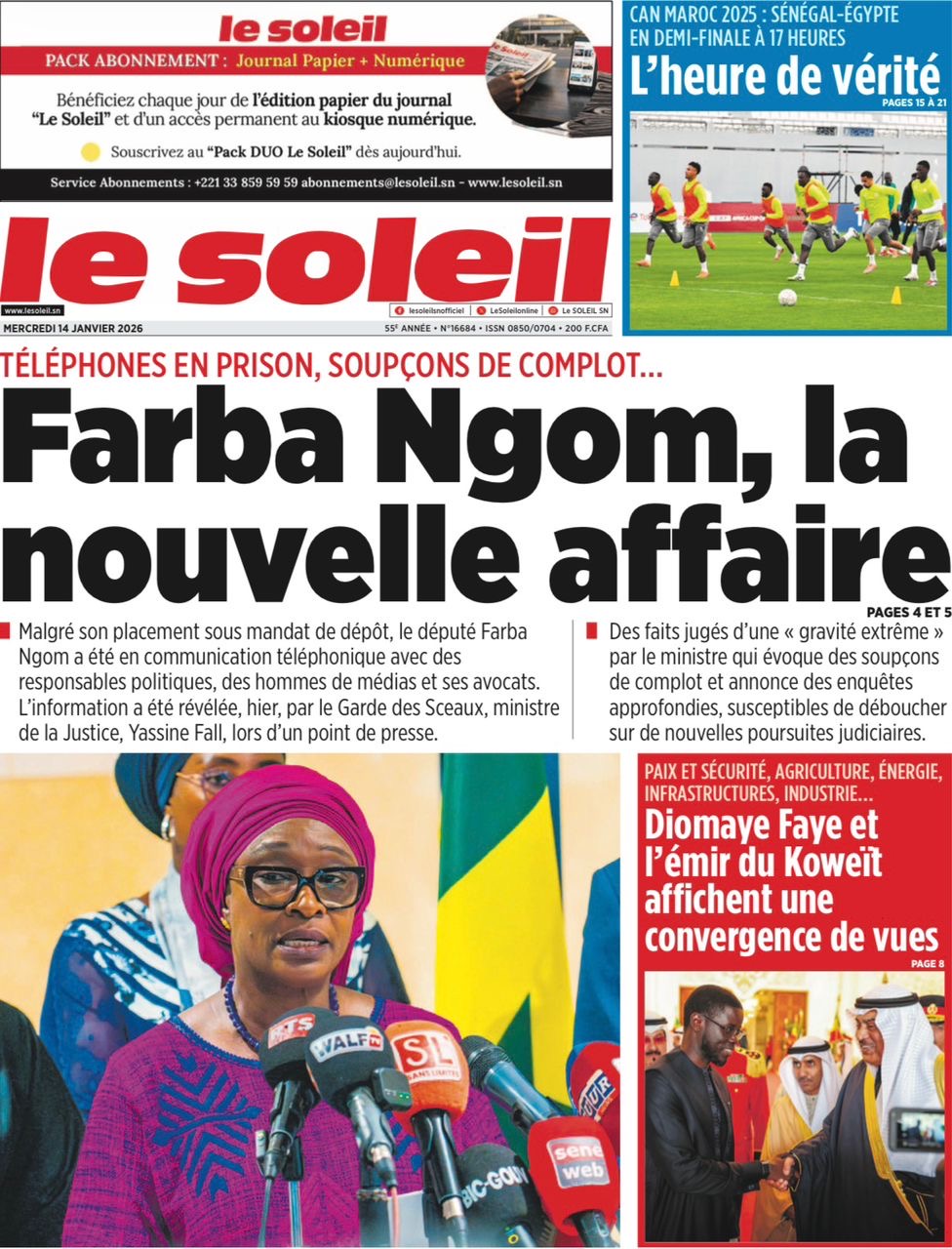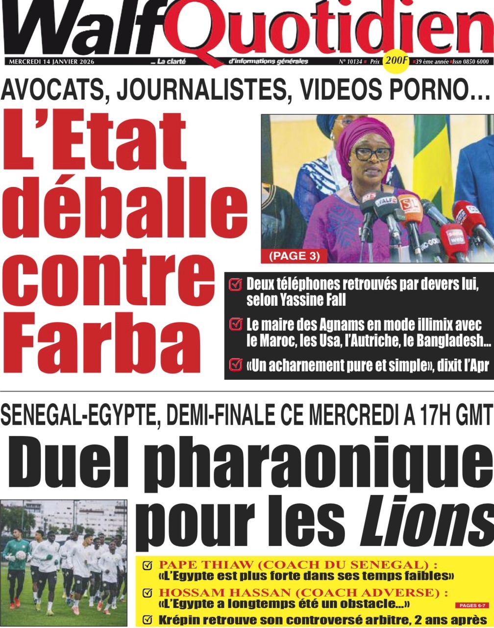 Les journaux sénégalais du mercredi 14 janvier 2026 ont deux sujets majeurs : la demi-finale de la CAN 2025 à disputer par les Lions cet après midi contre l’Egypte à Tanger au Maroc et les nouvelles accusations dans le dossier de Farba Ngom, le maire des Agnams en détention, brandies par la ministre de la Justice Yassine Fall.