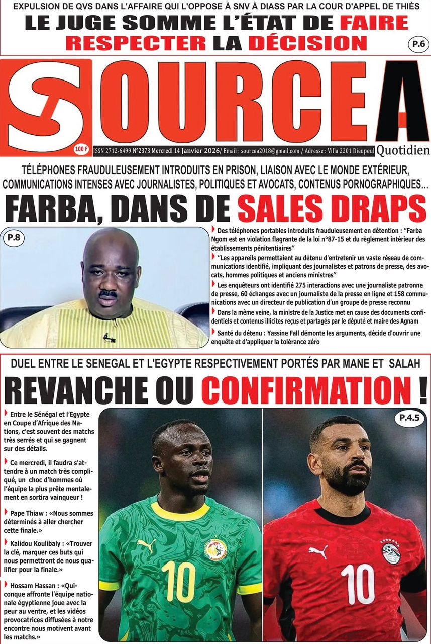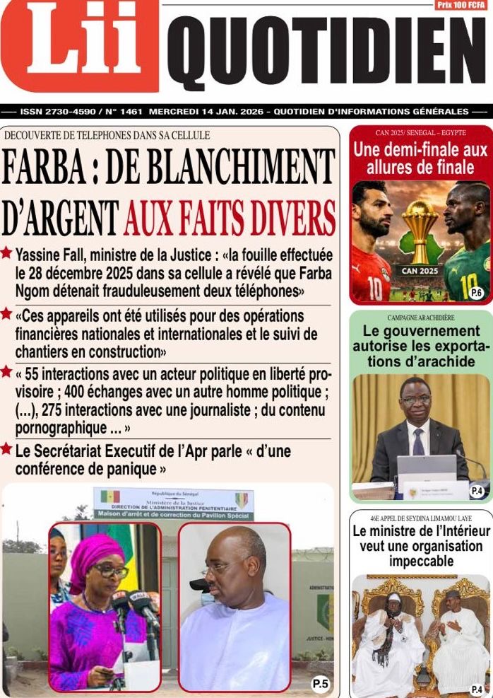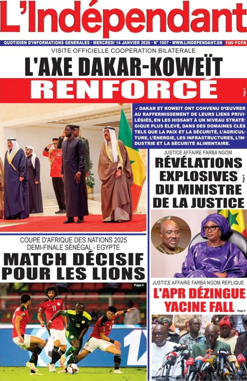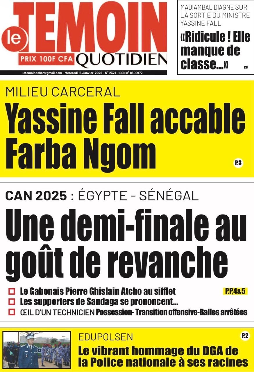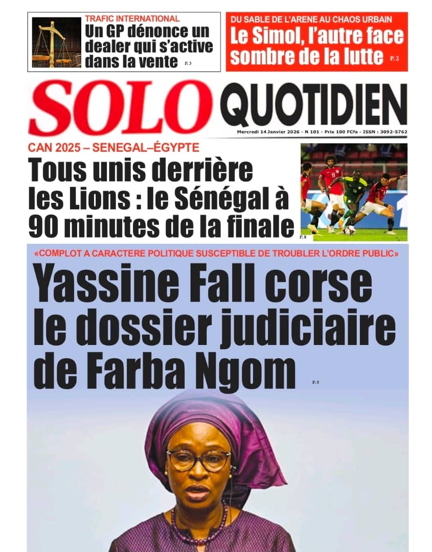 Les journaux sénégalais du mercredi 14 janvier 2026 ont deux sujets majeurs : la demi-finale de la CAN 2025 à disputer par les Lions cet après midi contre l’Egypte à Tanger au Maroc et les nouvelles accusations dans le dossier de Farba Ngom, le maire des Agnams en détention, brandies par la ministre de la Justice Yassine Fall.