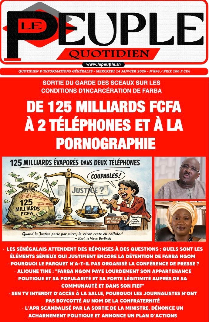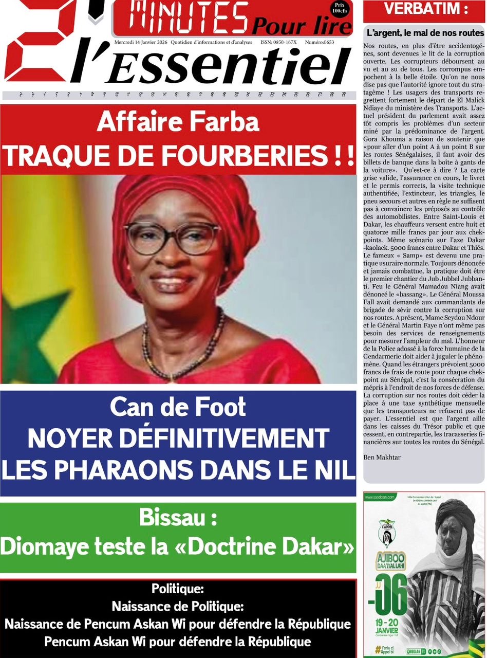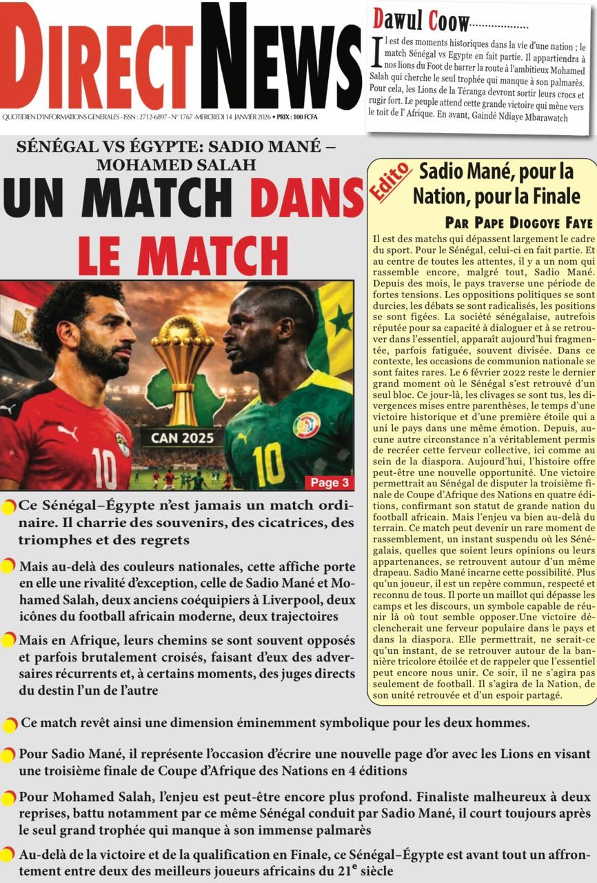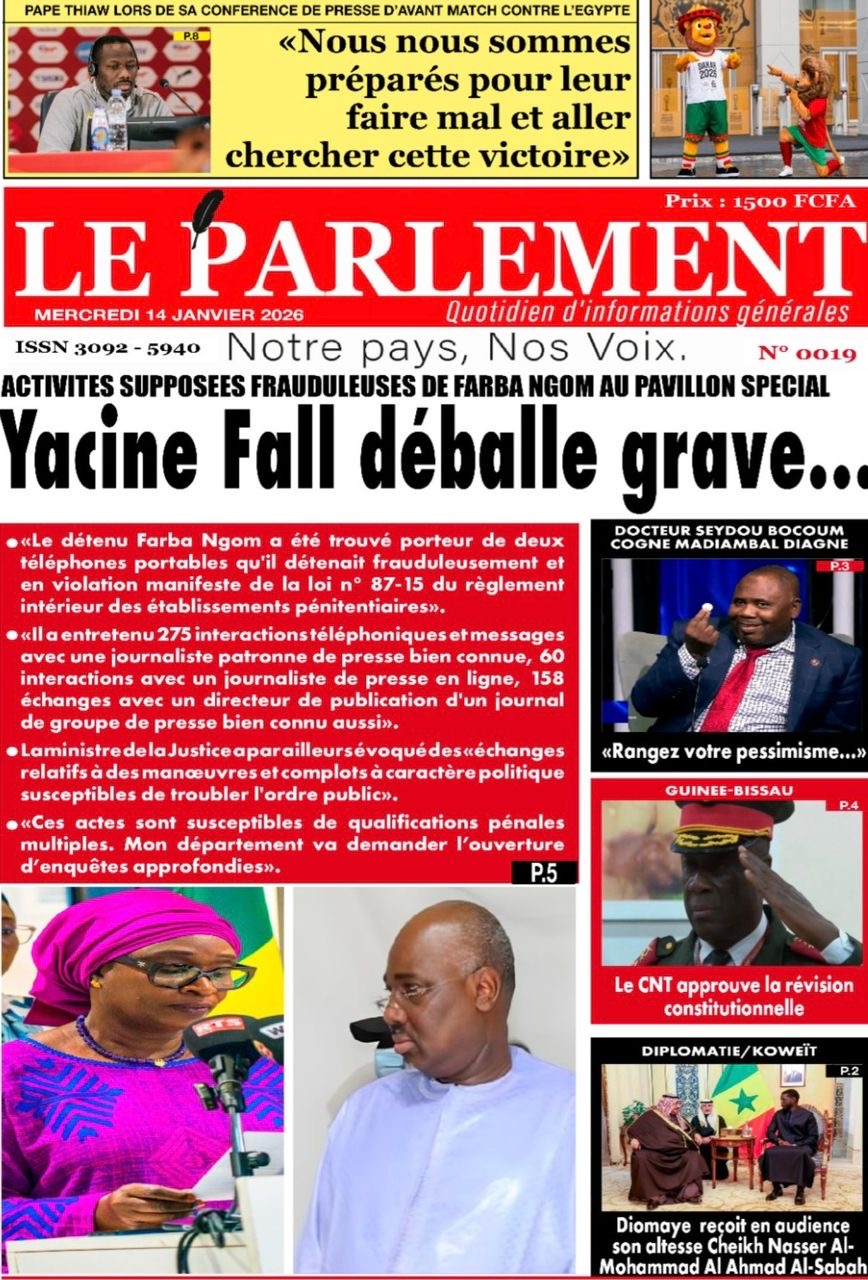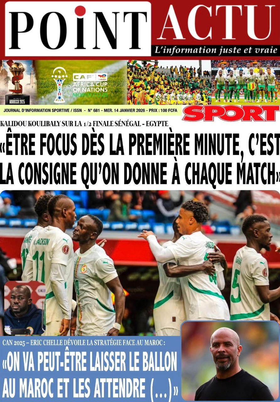 Les journaux sénégalais du mercredi 14 janvier 2026 ont deux sujets majeurs : la demi-finale de la CAN 2025 à disputer par les Lions cet après midi contre l’Egypte à Tanger au Maroc et les nouvelles accusations dans le dossier de Farba Ngom, le maire des Agnams en détention, brandies par la ministre de la Justice Yassine Fall.