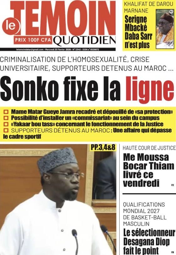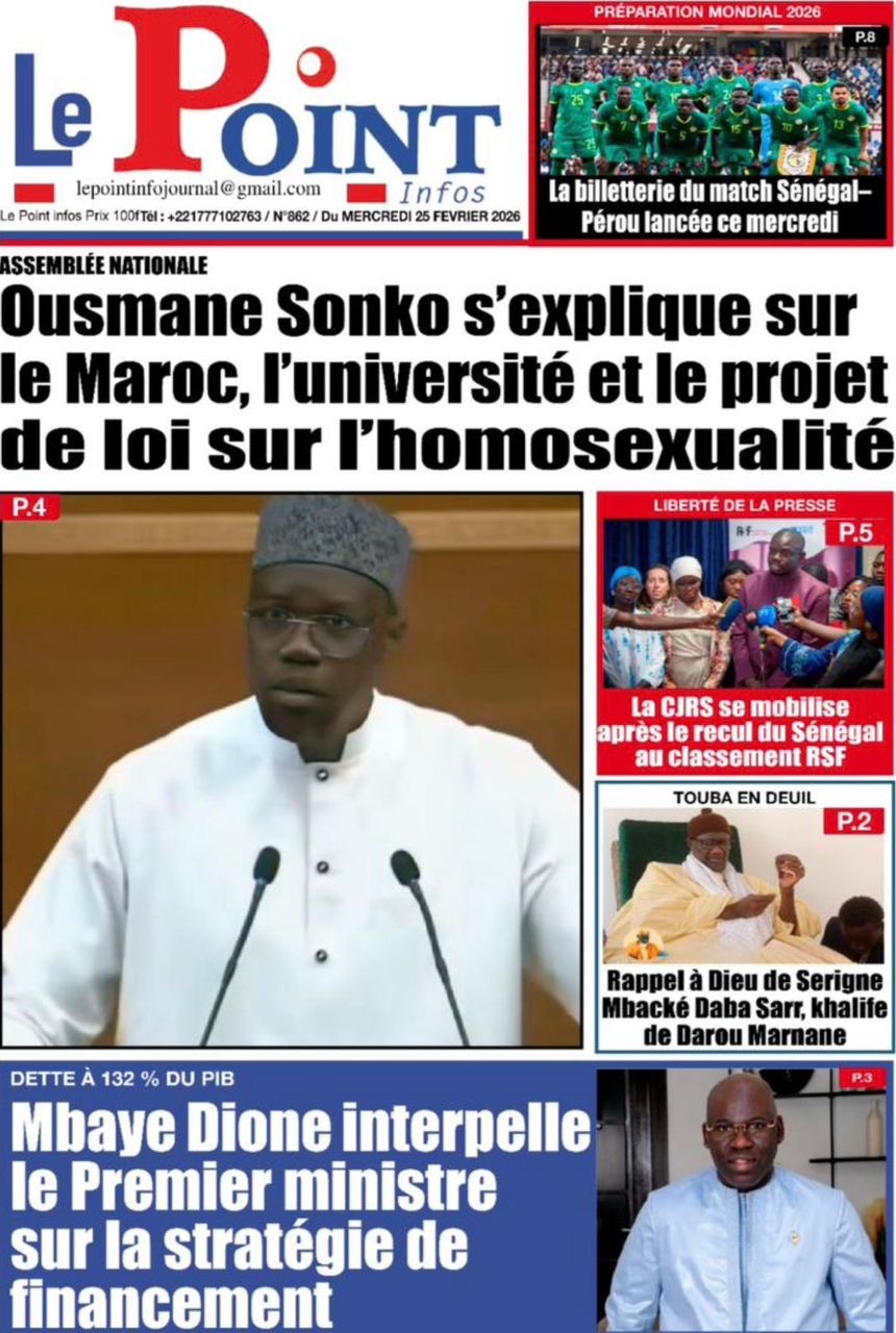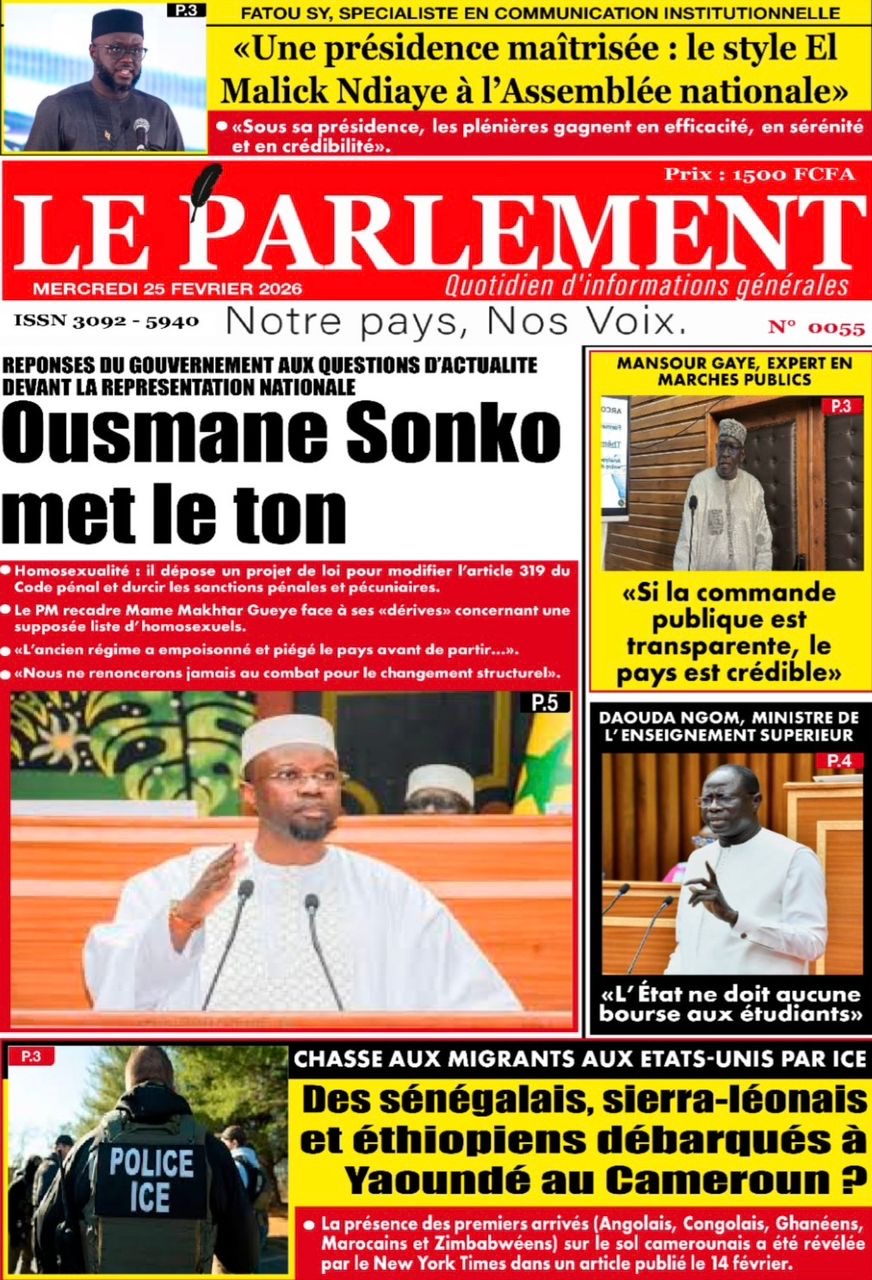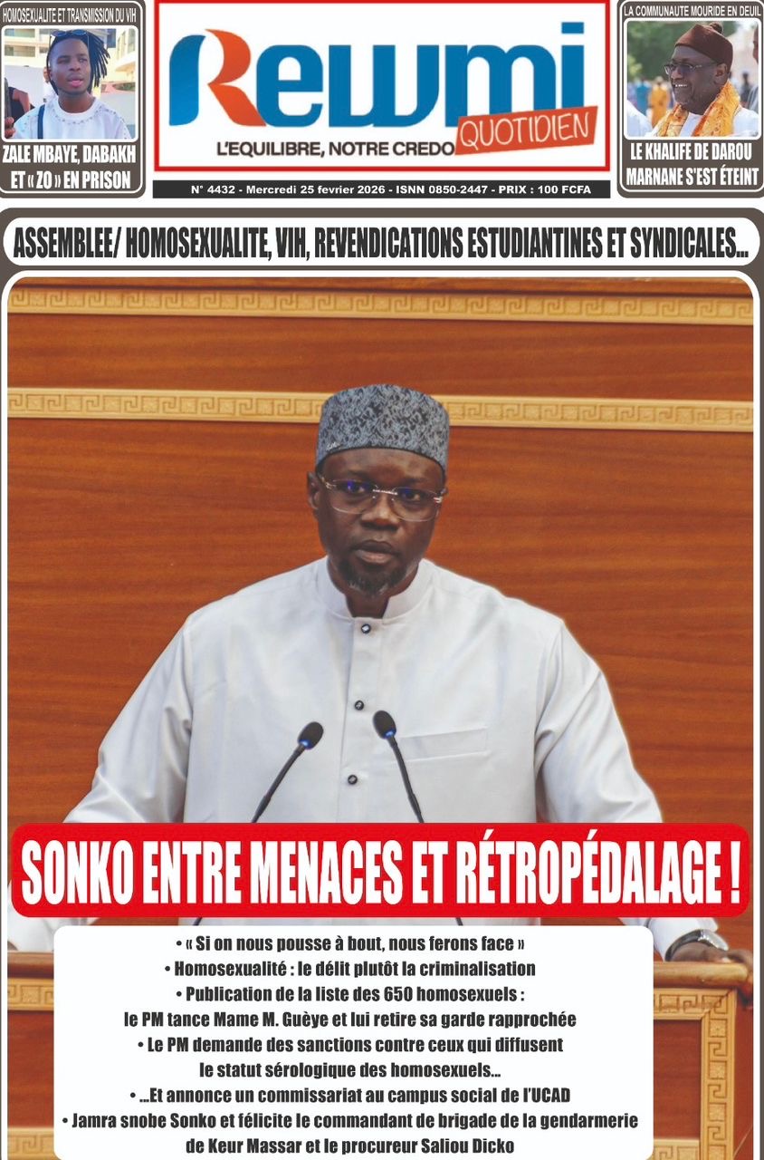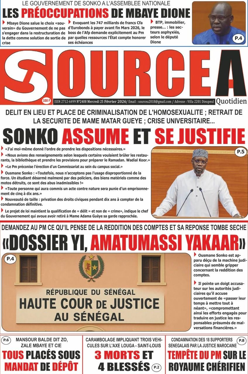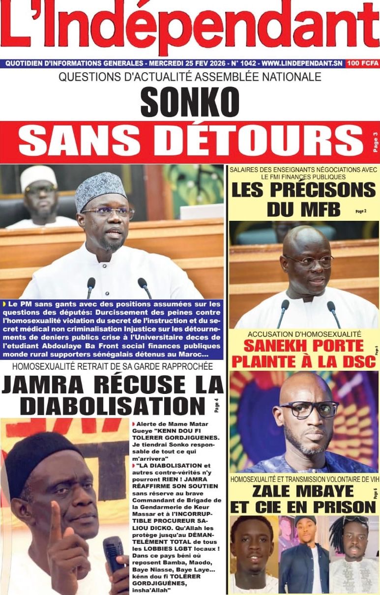 Les journaux sénégalais du mercredi 25 février 2026 ont un sujet principal en UNE, le passage du Premier ministre Ousmane Sonko à l’Assemblée Nationale, pour répondre à des questions d’actualité. Tout y est presque passé : la criminalisation de l’homosexualité, la condamnation des supports sénégalais au Maroc, la dette, la reddition des comptes…