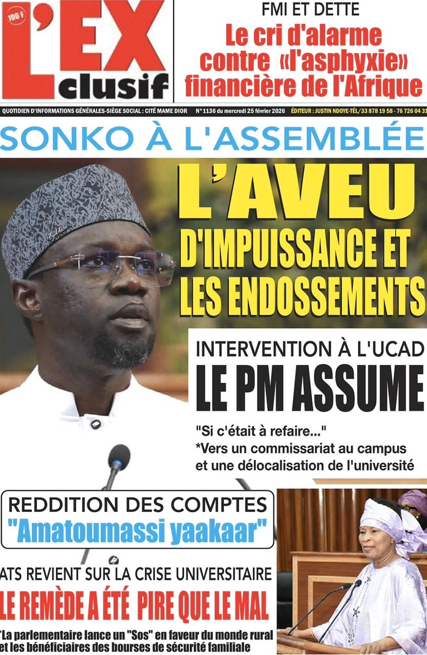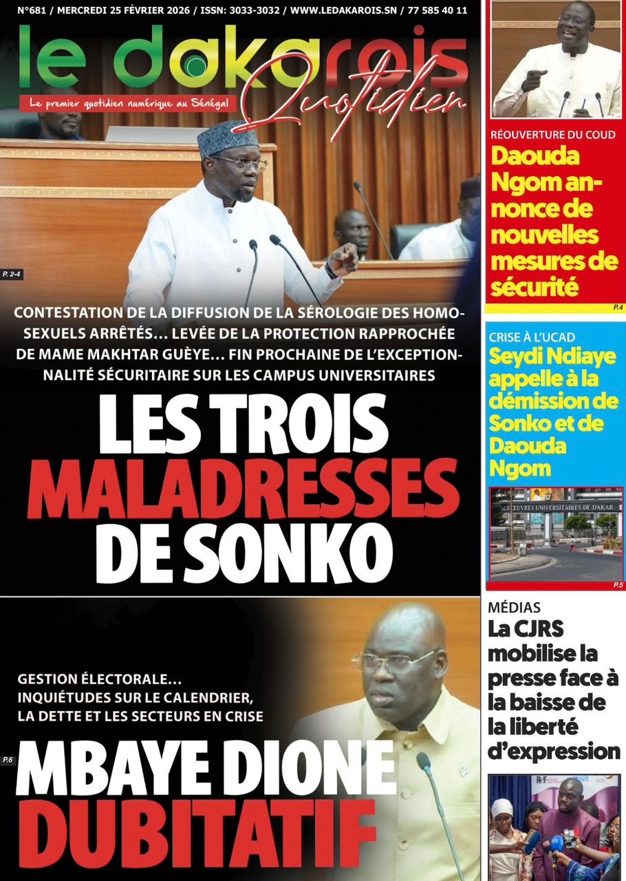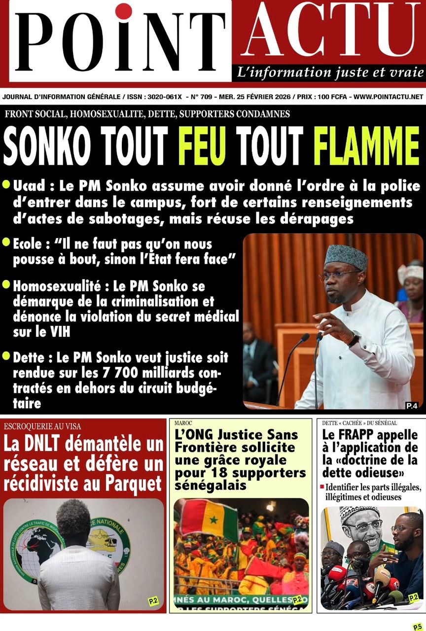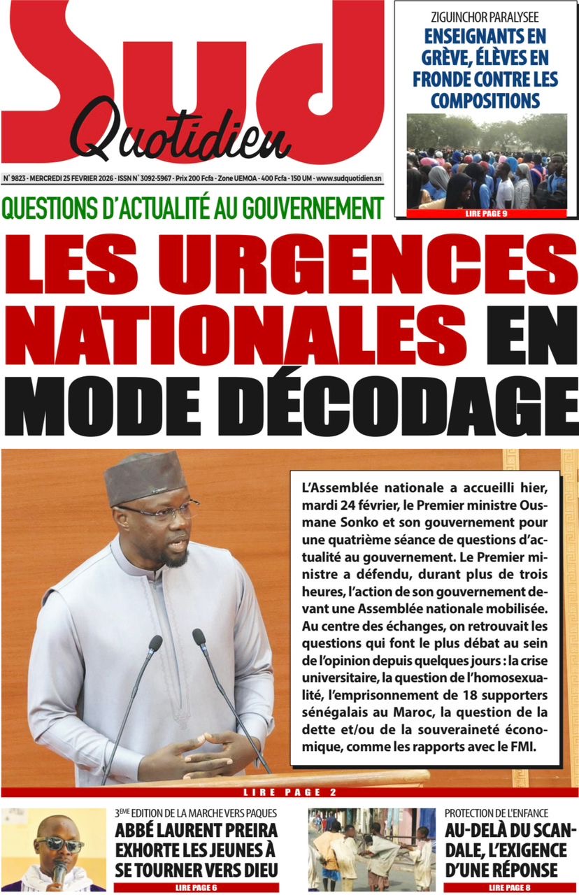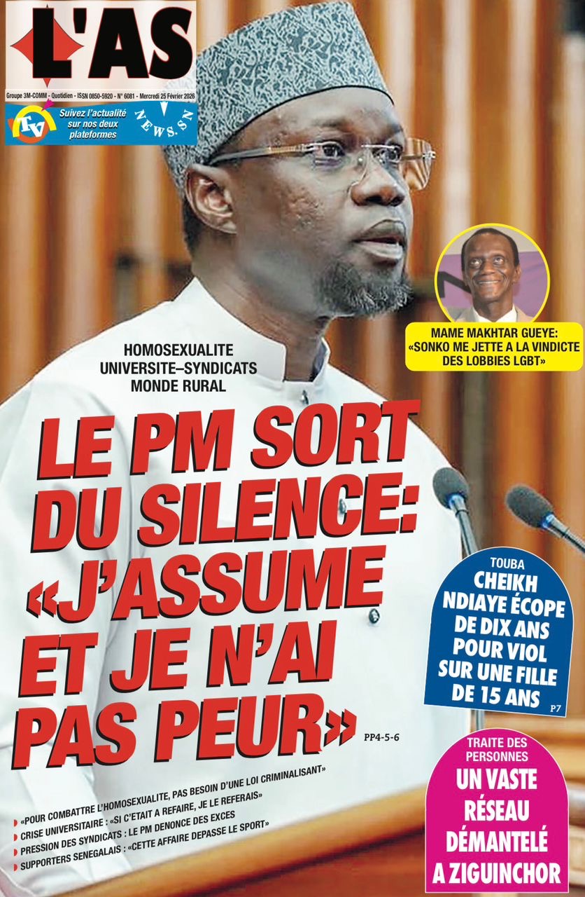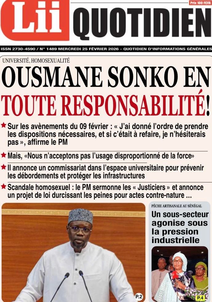 Les journaux sénégalais du mercredi 25 février 2026 ont un sujet principal en UNE, le passage du Premier ministre Ousmane Sonko à l’Assemblée Nationale, pour répondre à des questions d’actualité. Tout y est presque passé : la criminalisation de l’homosexualité, la condamnation des supports sénégalais au Maroc, la dette, la reddition des comptes…