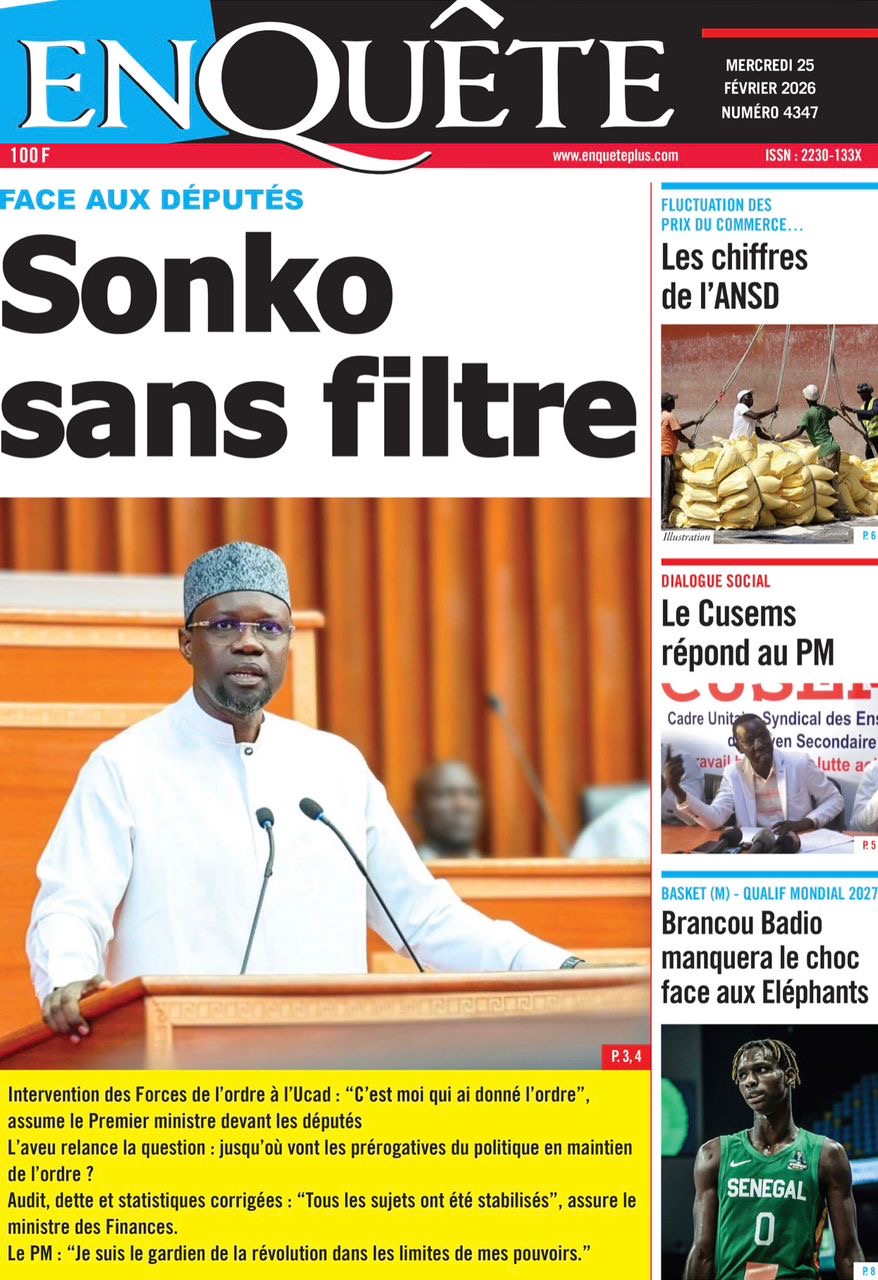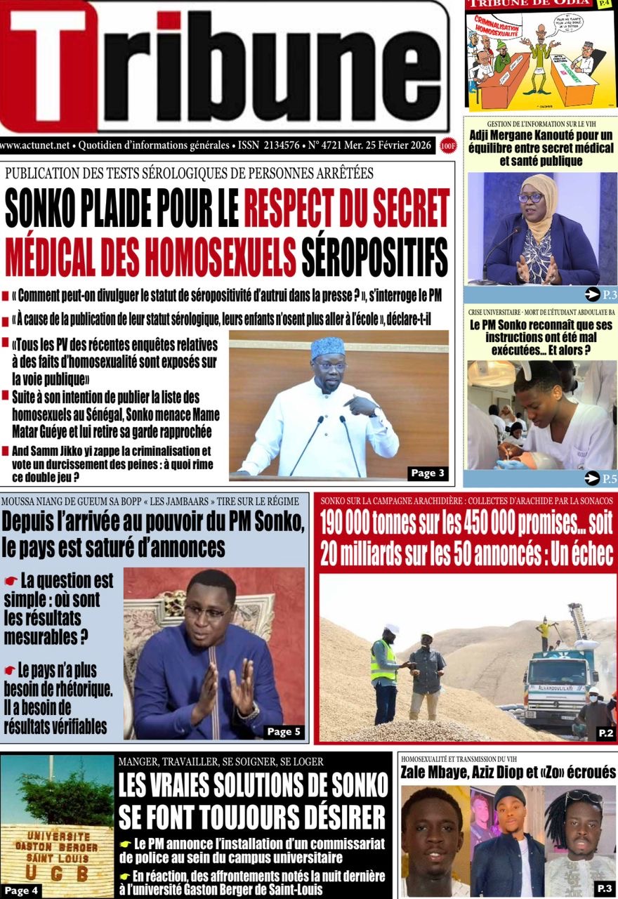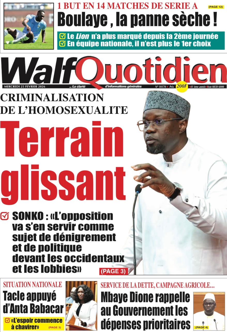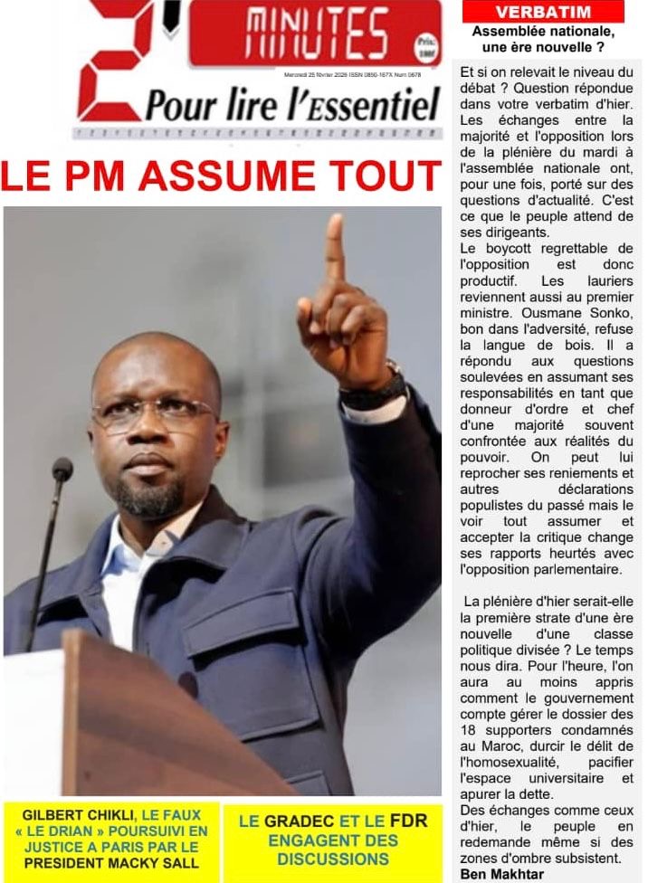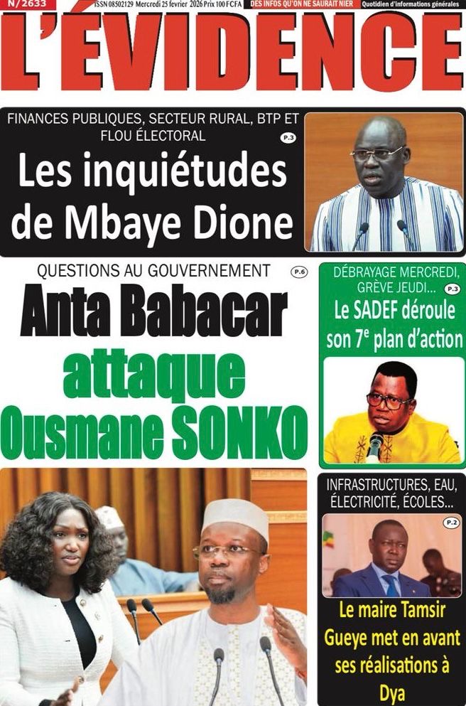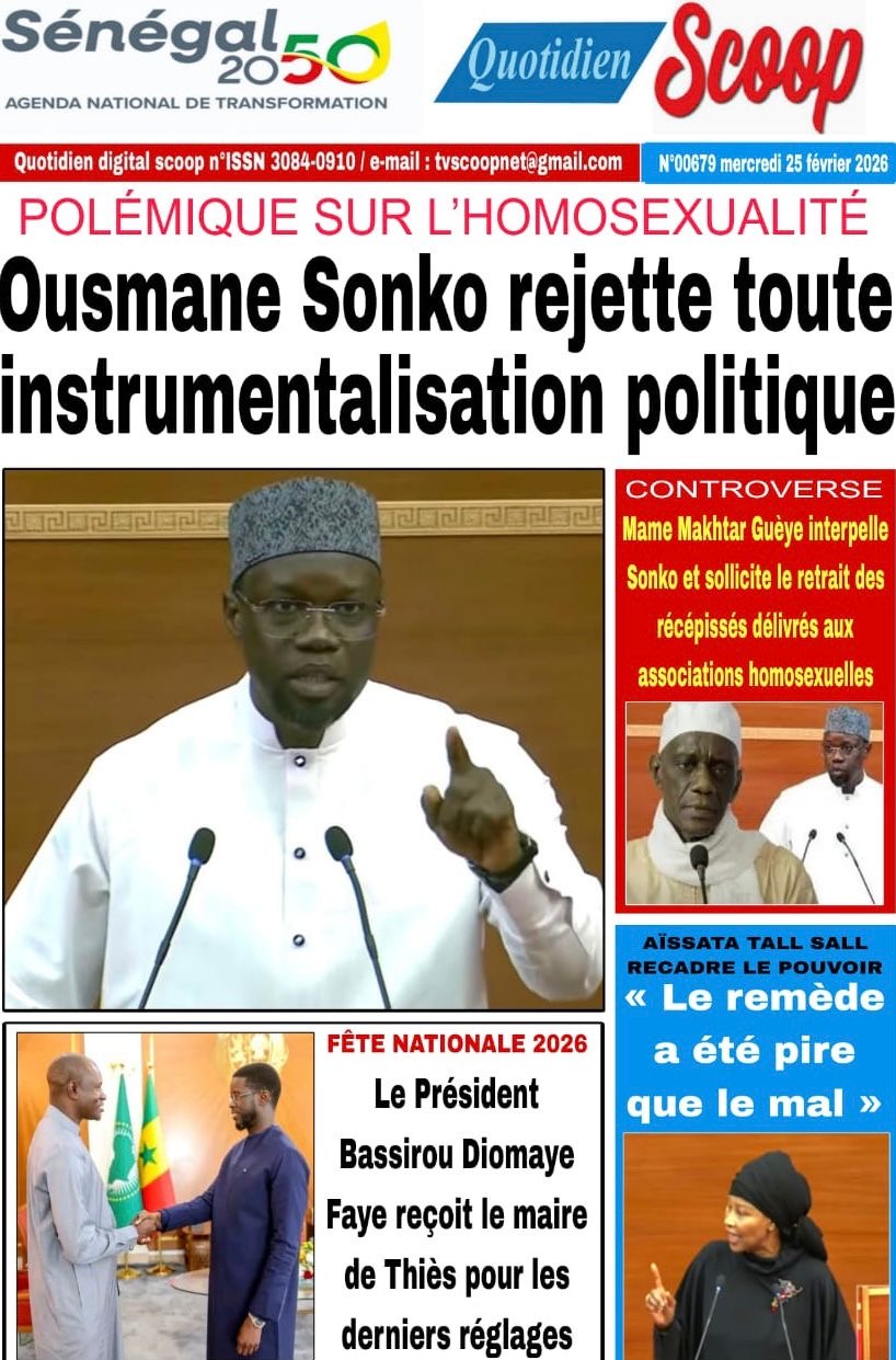 Les journaux sénégalais du mercredi 25 février 2026 ont un sujet principal en UNE, le passage du Premier ministre Ousmane Sonko à l’Assemblée Nationale, pour répondre à des questions d’actualité. Tout y est presque passé : la criminalisation de l’homosexualité, la condamnation des supports sénégalais au Maroc, la dette, la reddition des comptes…