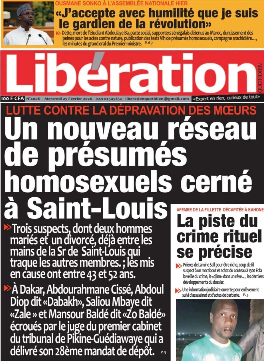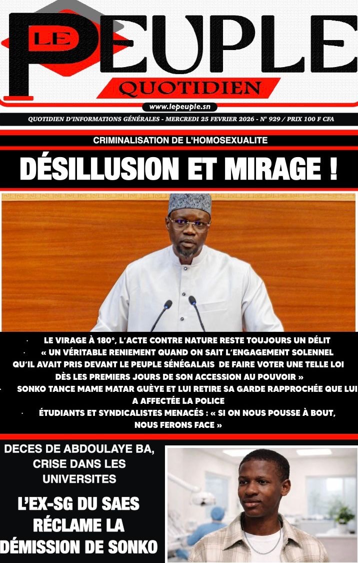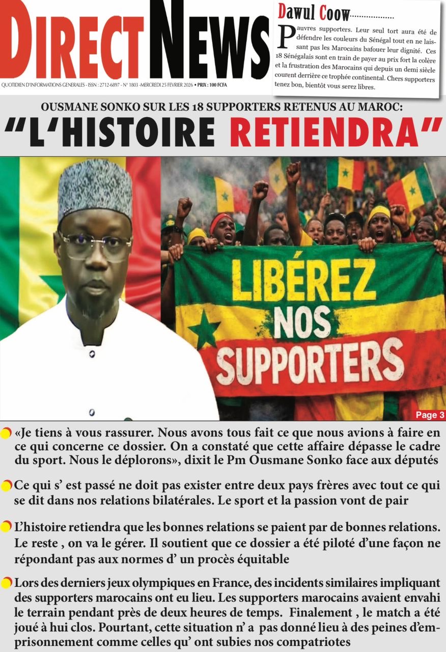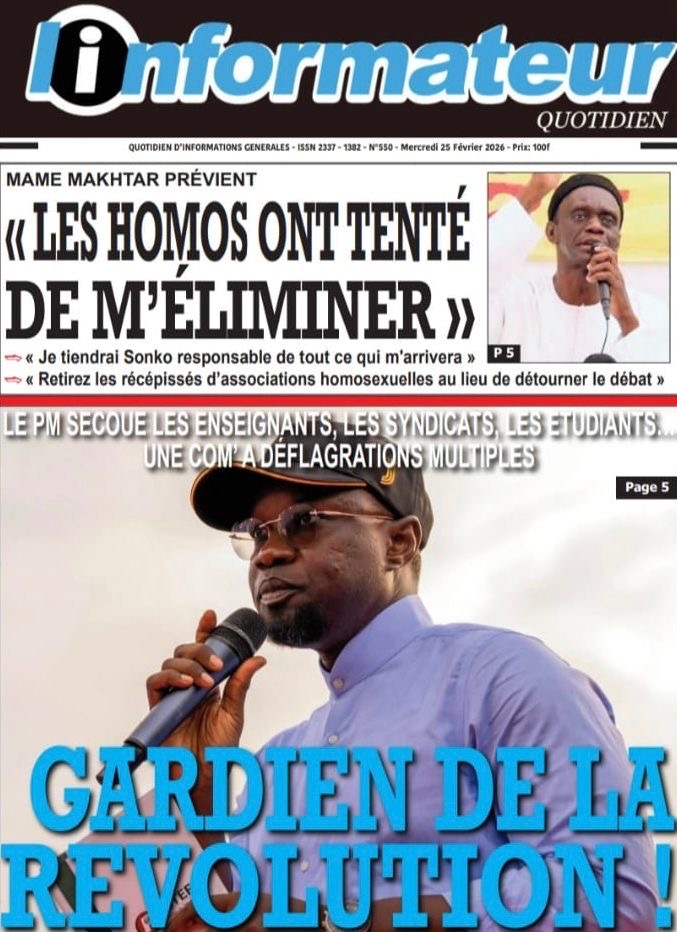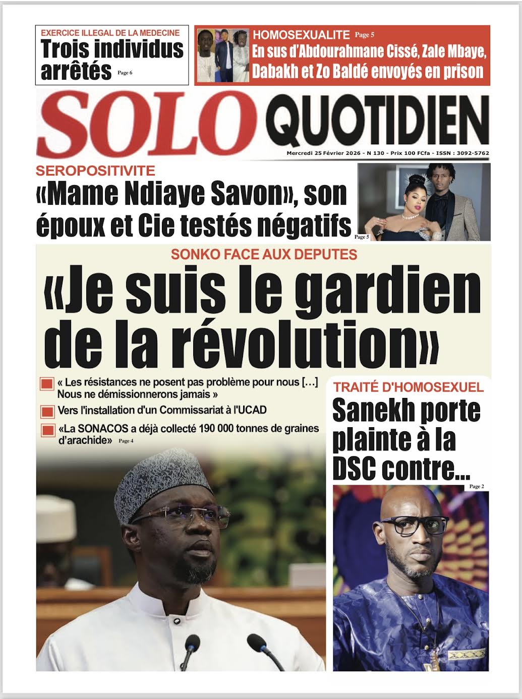 Les journaux sénégalais du mercredi 25 février 2026 ont un sujet principal en UNE, le passage du Premier ministre Ousmane Sonko à l’Assemblée Nationale, pour répondre à des questions d’actualité. Tout y est presque passé : la criminalisation de l’homosexualité, la condamnation des supports sénégalais au Maroc, la dette, la reddition des comptes…