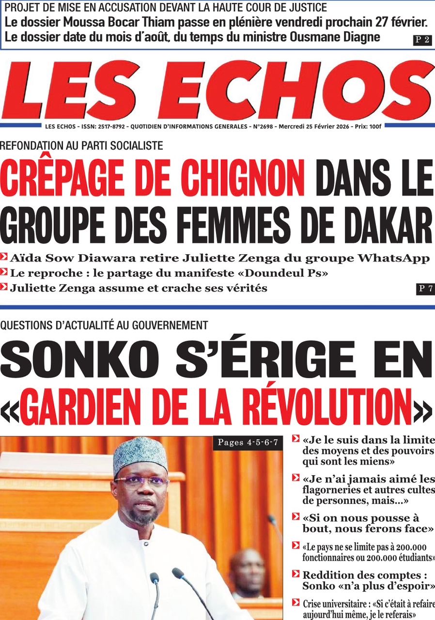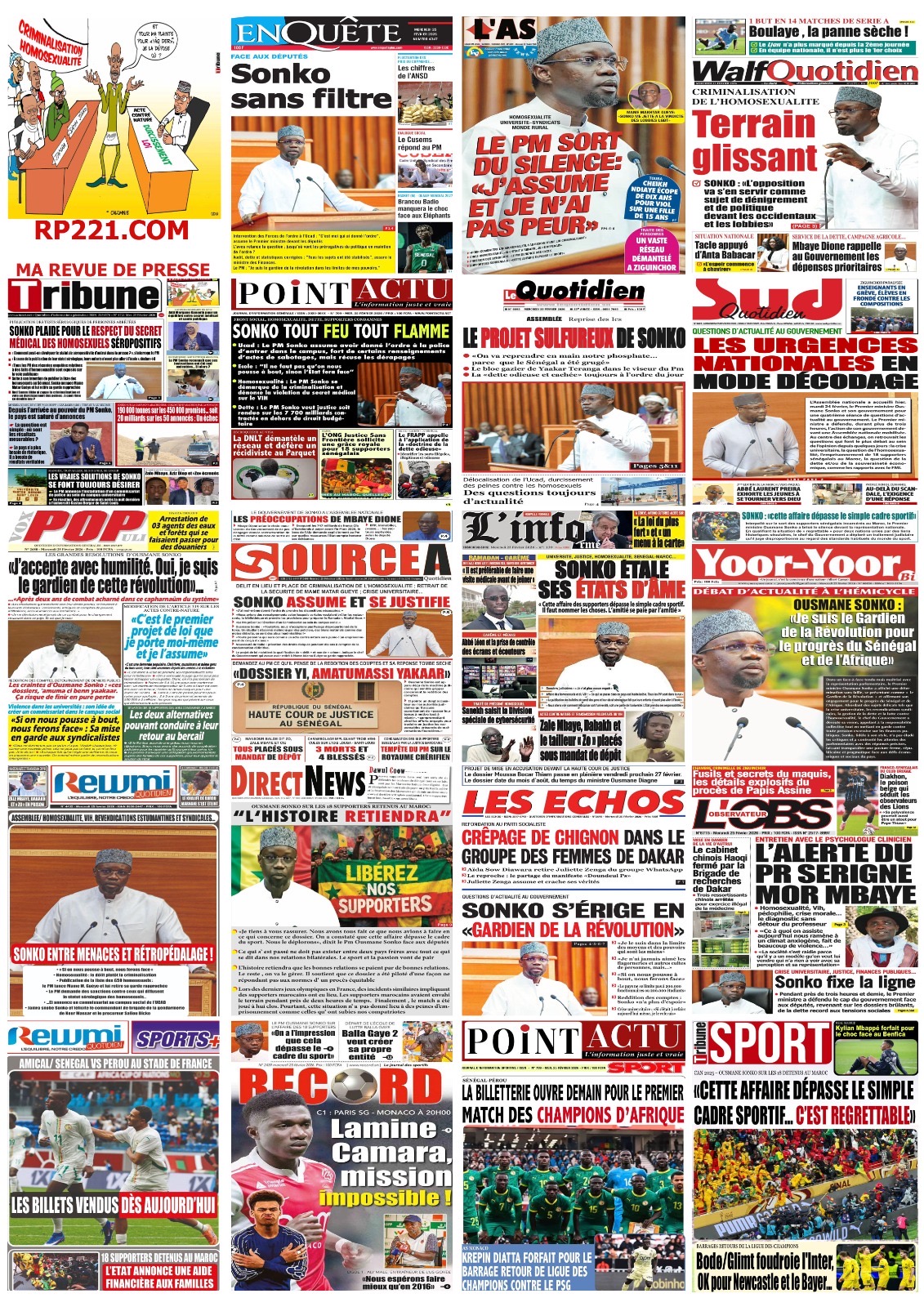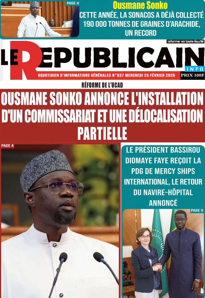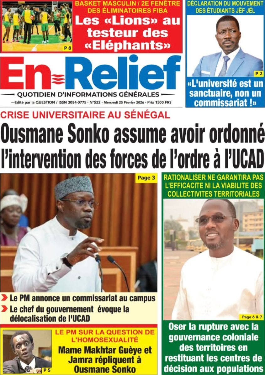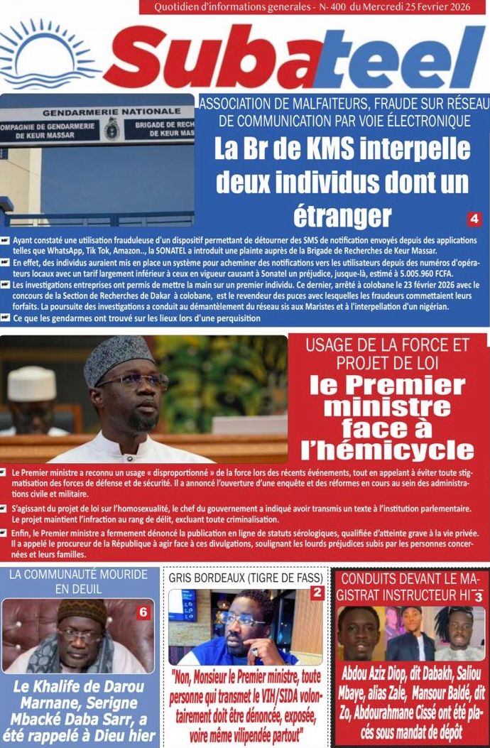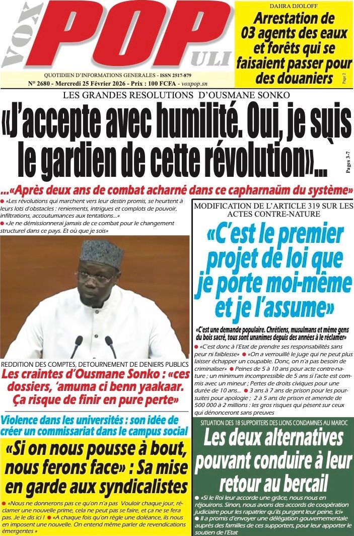 Les journaux sénégalais du mercredi 25 février 2026 ont un sujet principal en UNE, le passage du Premier ministre Ousmane Sonko à l’Assemblée Nationale, pour répondre à des questions d’actualité. Tout y est presque passé : la criminalisation de l’homosexualité, la condamnation des supports sénégalais au Maroc, la dette, la reddition des comptes…