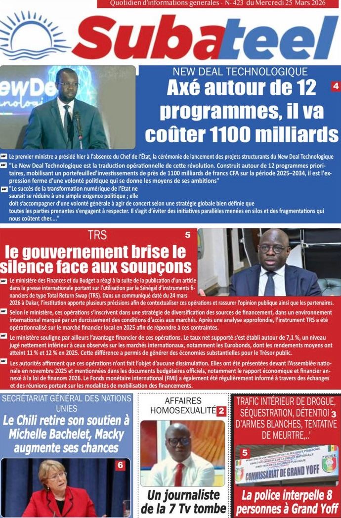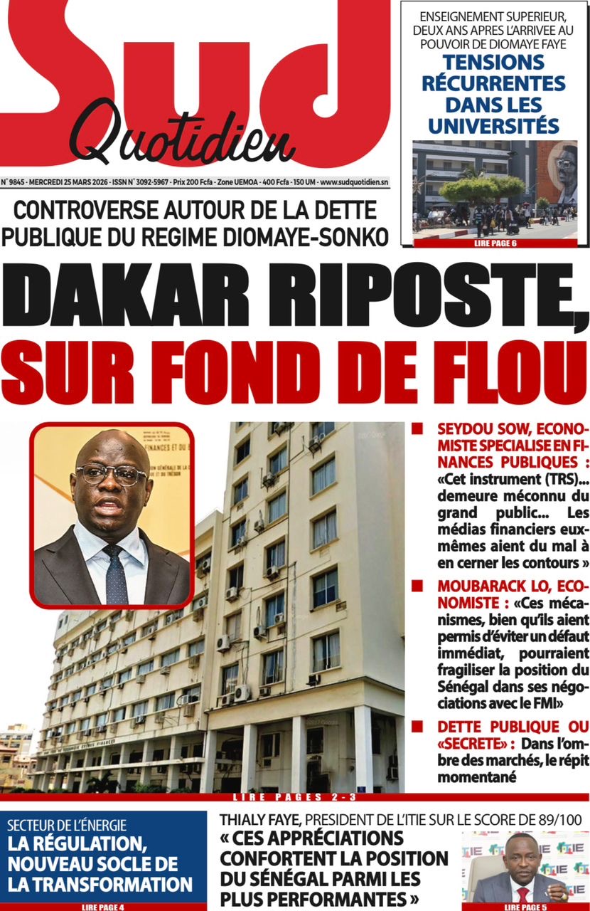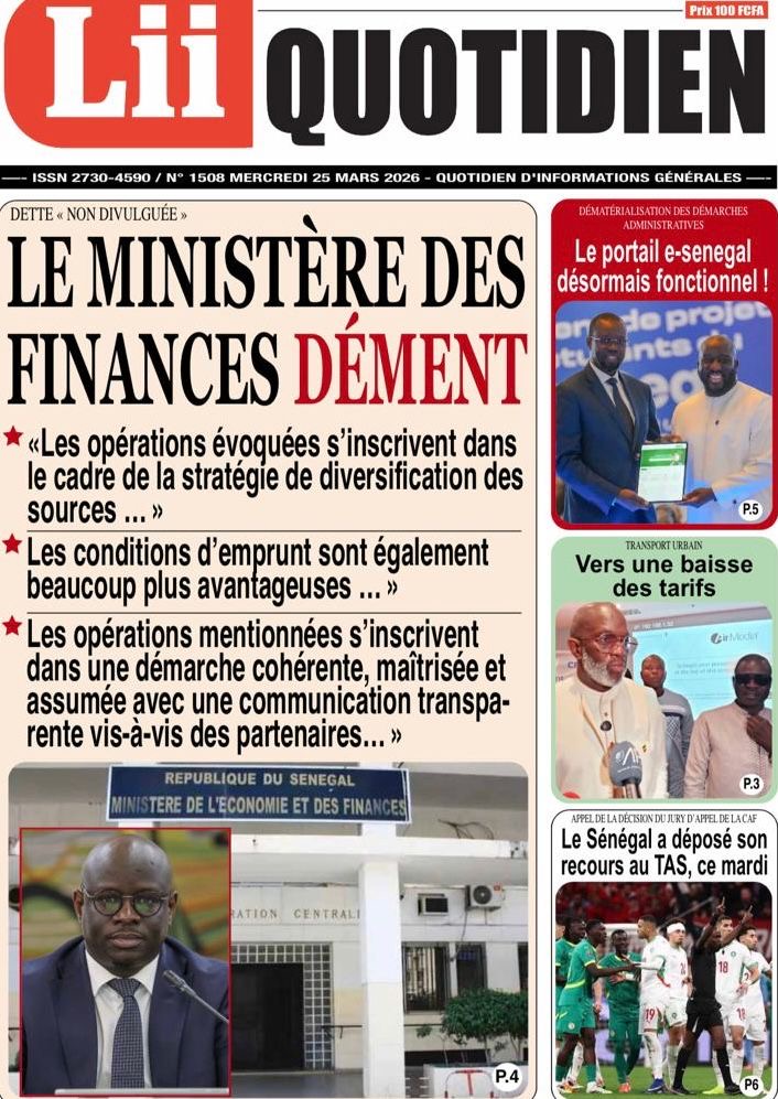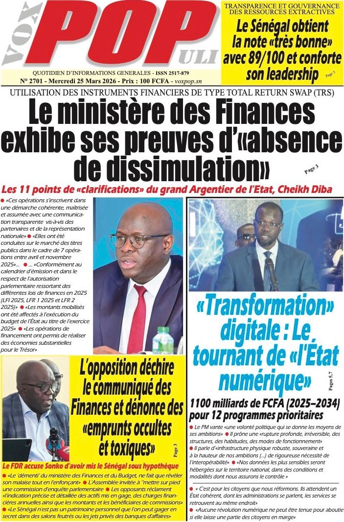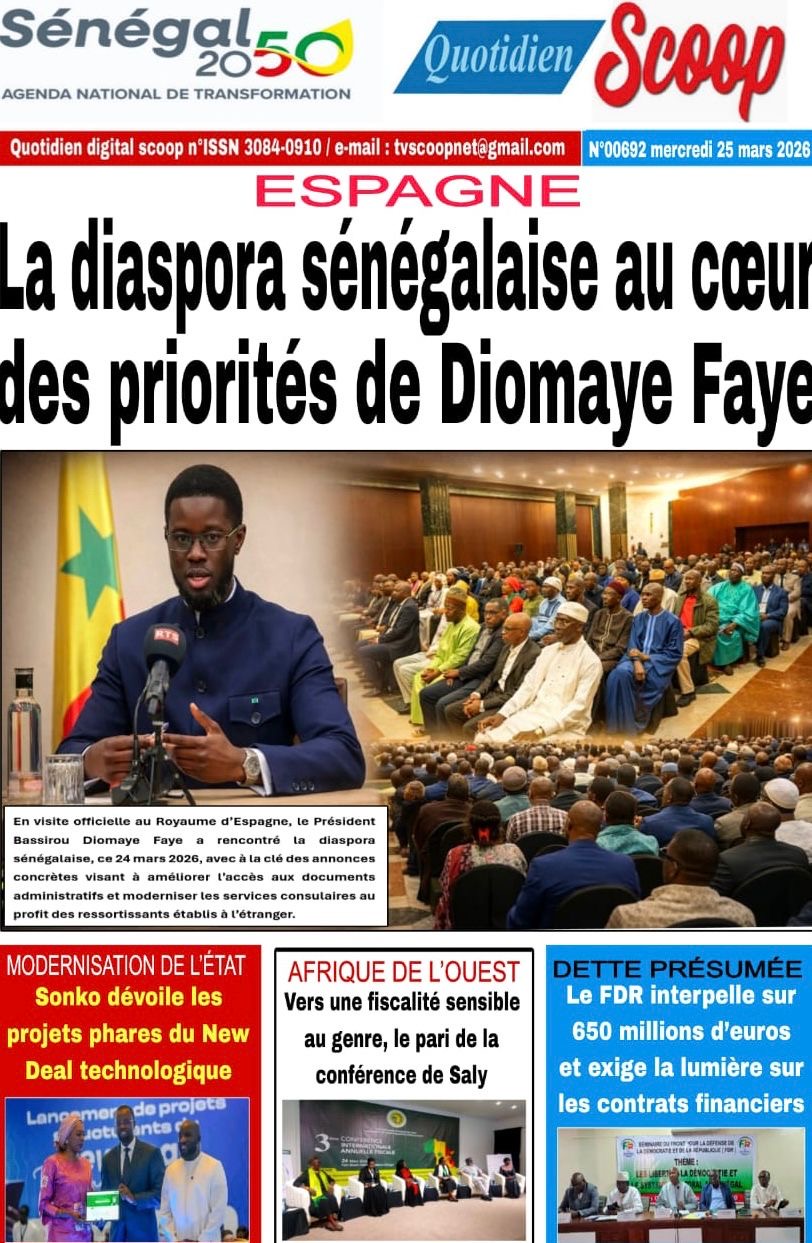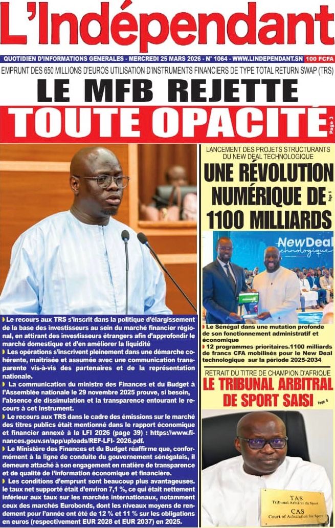 Les journaux sénégalais du mercredi 25 mars 2026 reviennent sur les précisions du ministère des Finances et du Budget sur l’affaire de dette cachée évoquée par le journal Financial Times, le voyage du Président Diomaye en Espagne et le point sur le New Deal Technologique.
