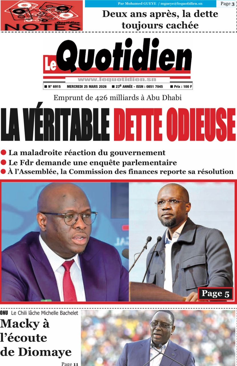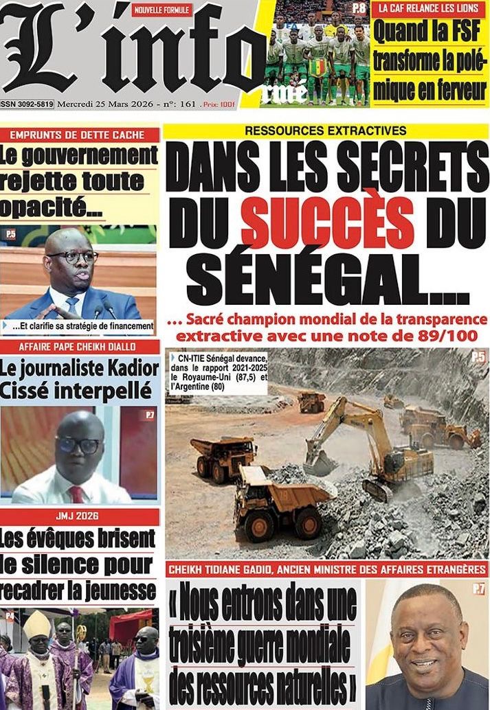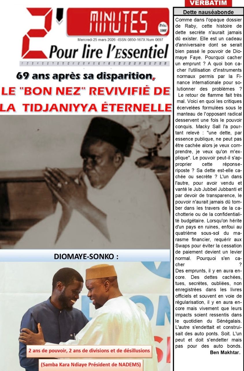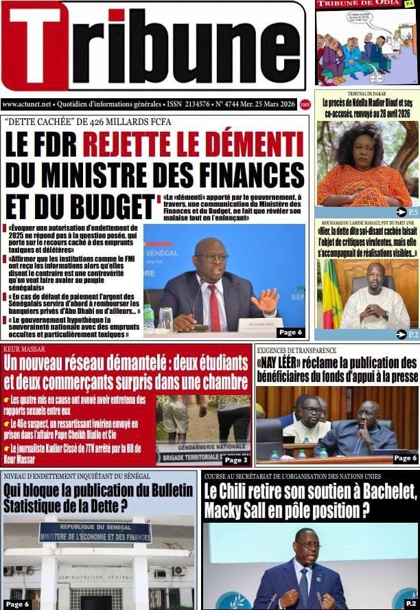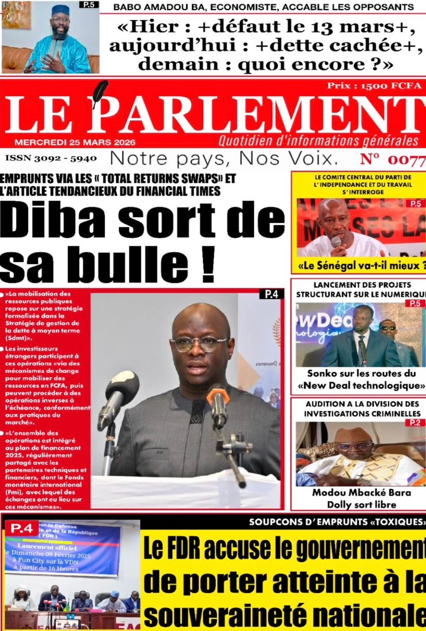 Les journaux sénégalais du mercredi 25 mars 2026 reviennent sur les précisions du ministère des Finances et du Budget sur l’affaire de dette cachée évoquée par le journal Financial Times, le voyage du Président Diomaye en Espagne et le point sur le New Deal Technologique.