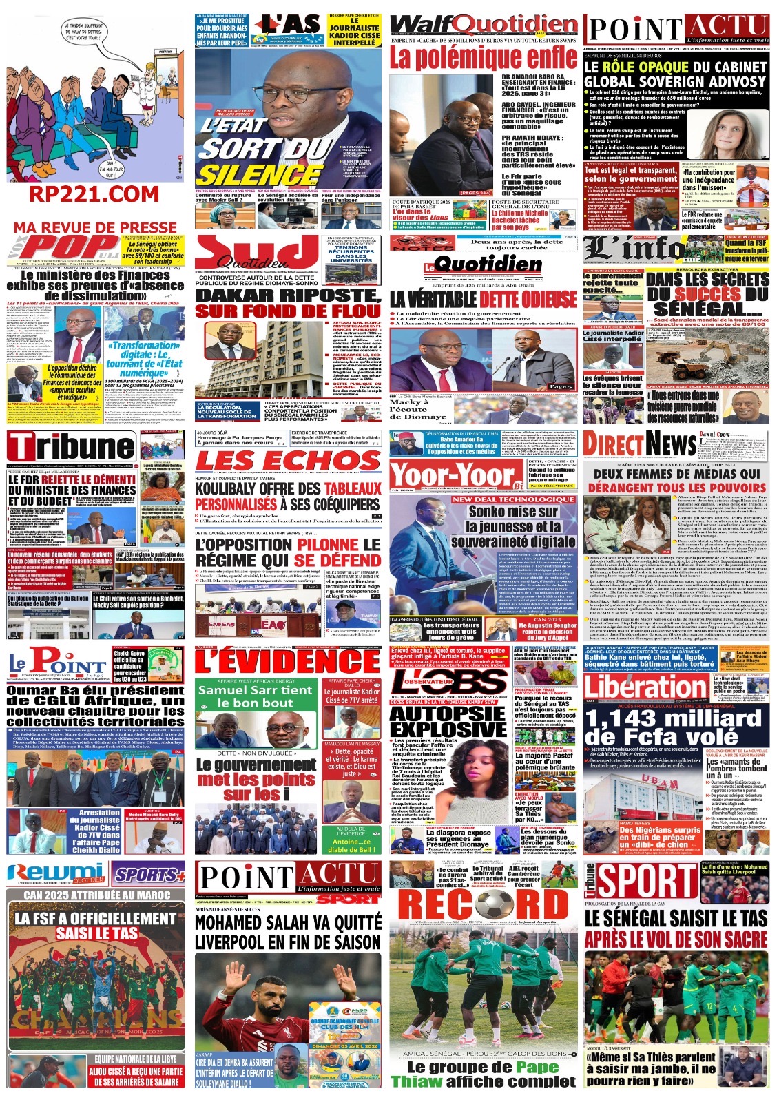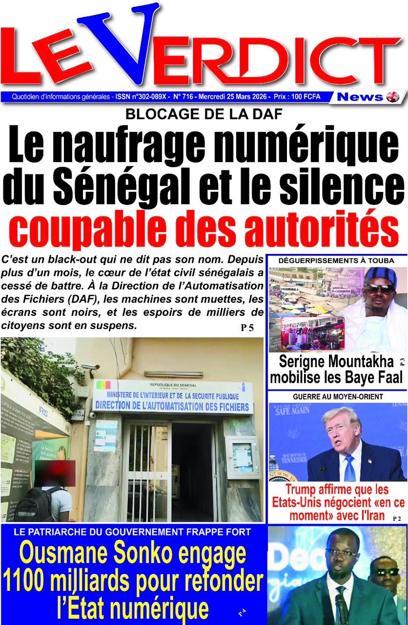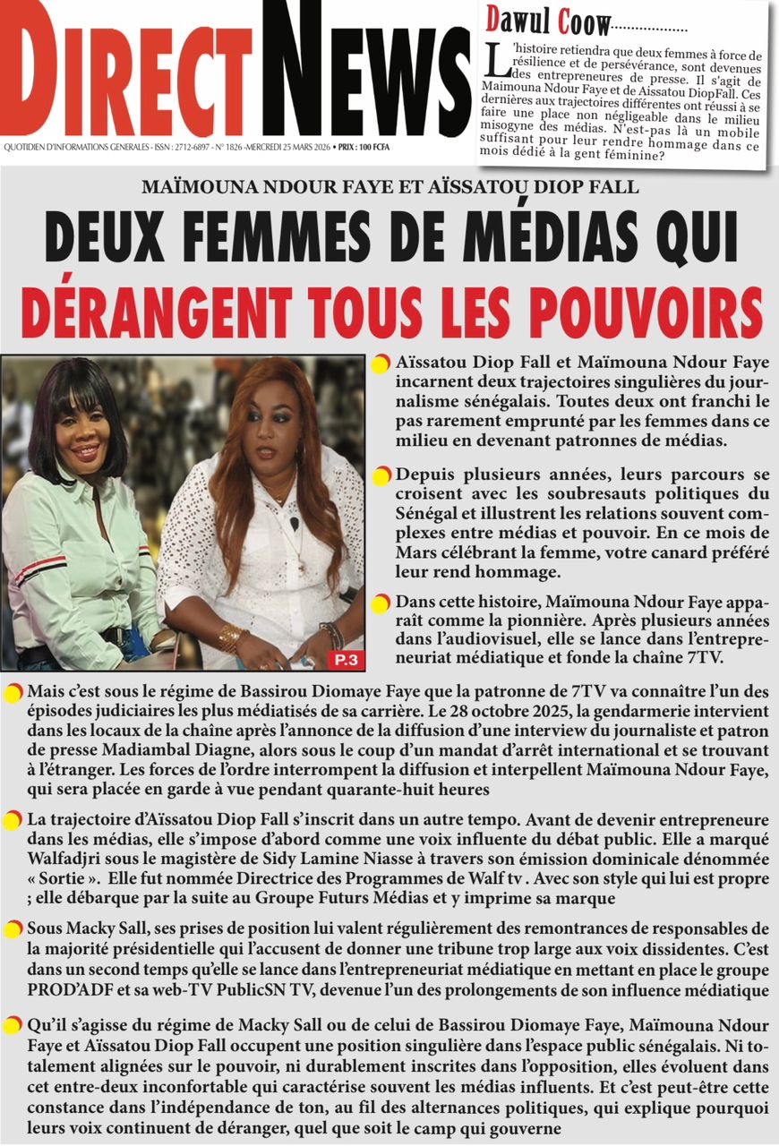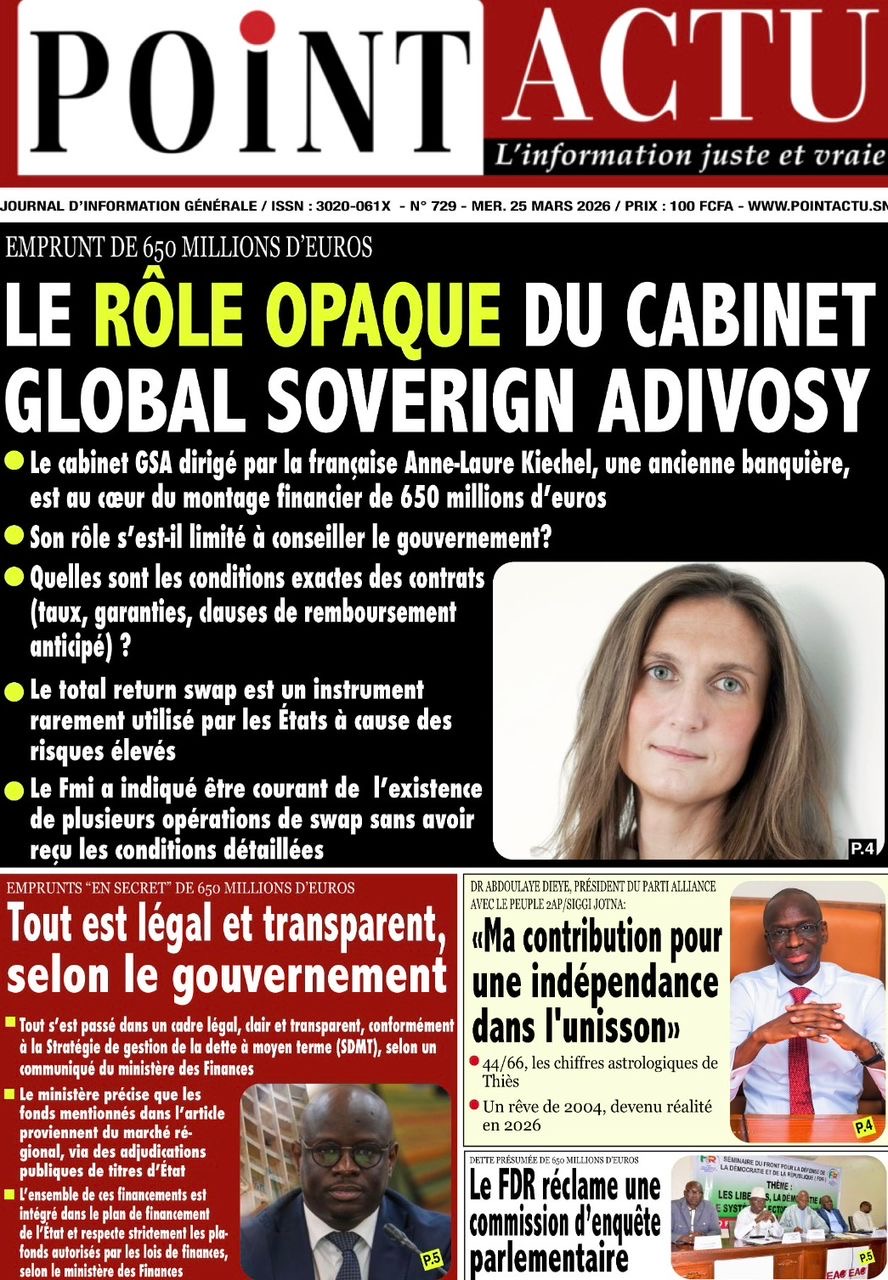 Les journaux sénégalais du mercredi 25 mars 2026 reviennent sur les précisions du ministère des Finances et du Budget sur l’affaire de dette cachée évoquée par le journal Financial Times, le voyage du Président Diomaye en Espagne et le point sur le New Deal Technologique.