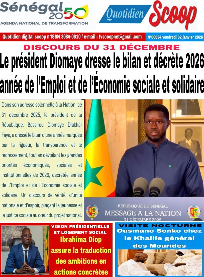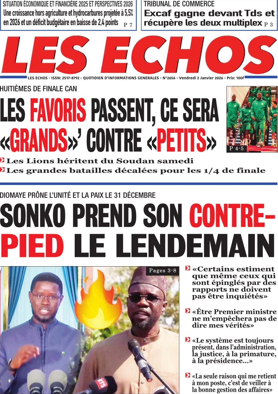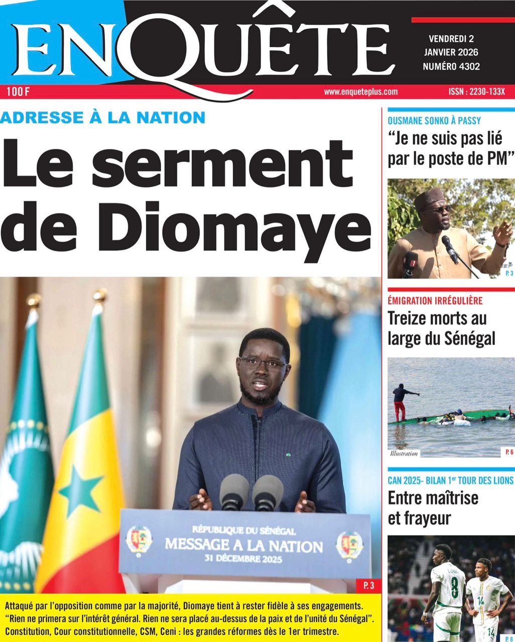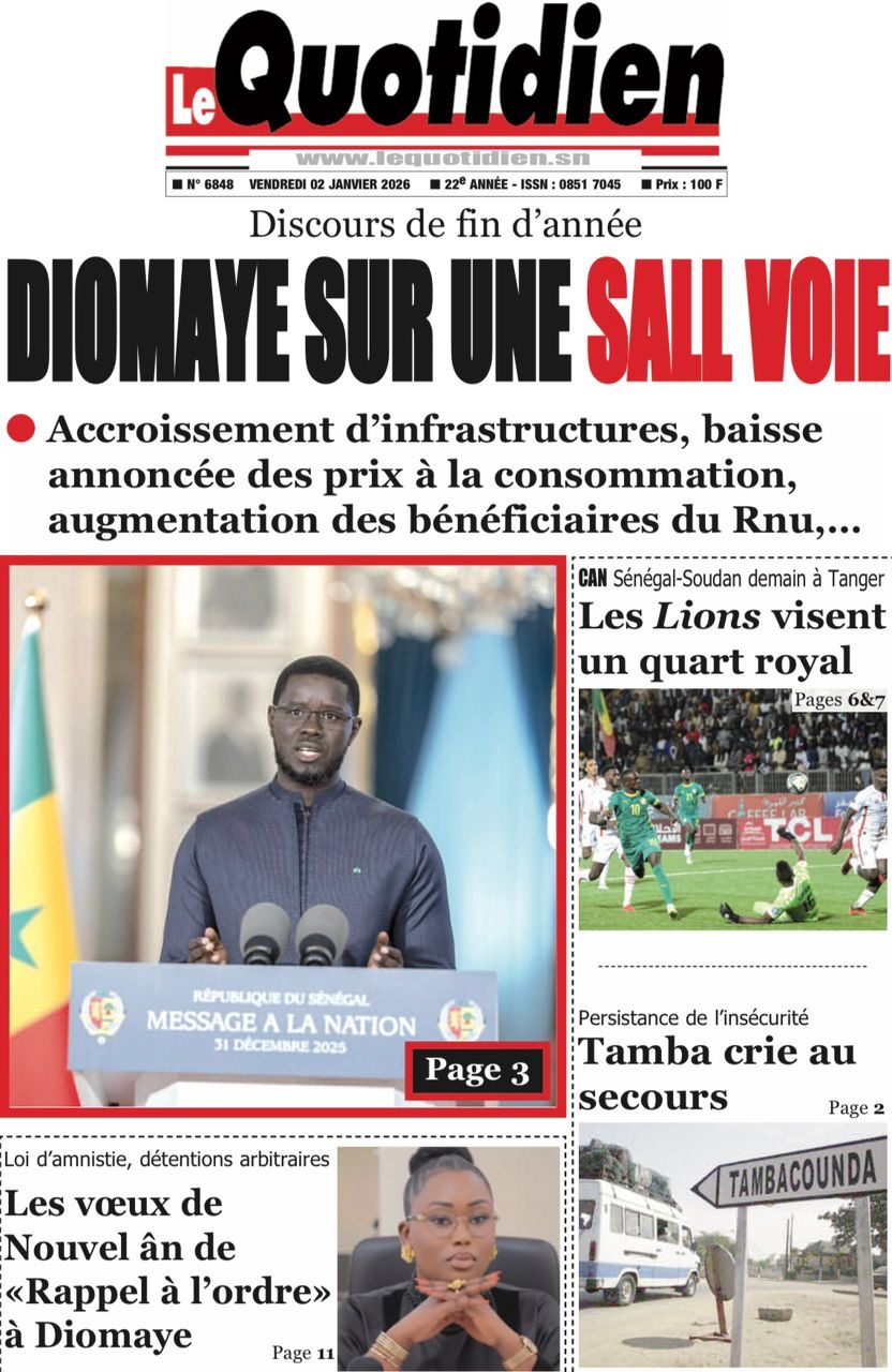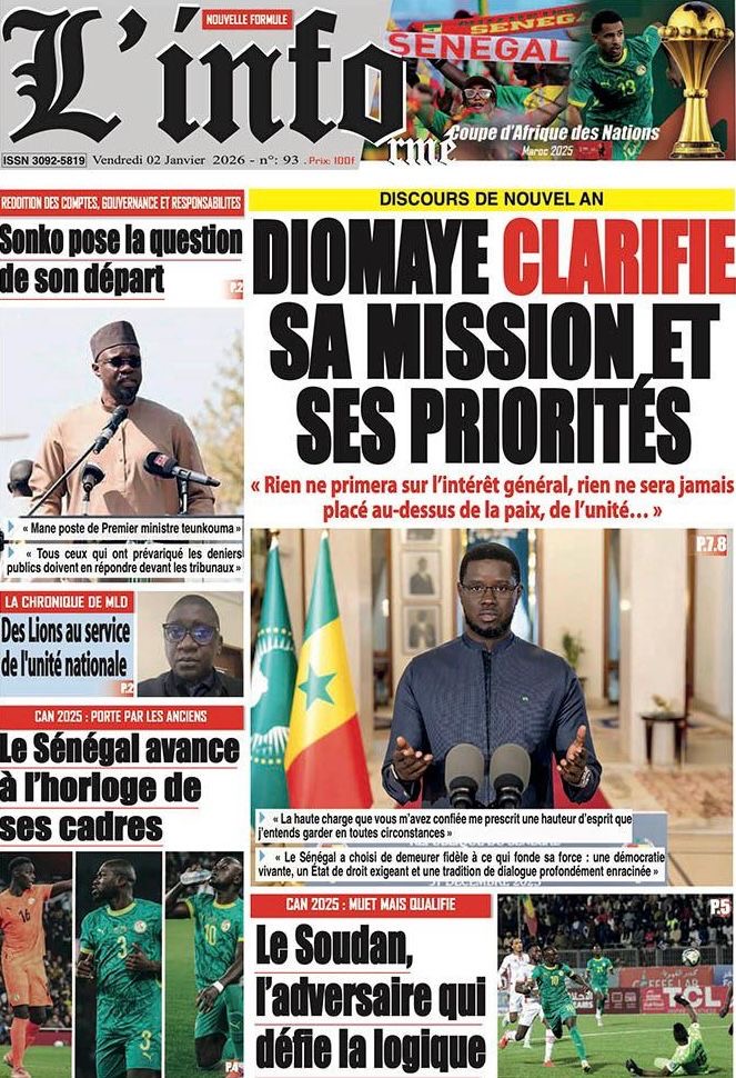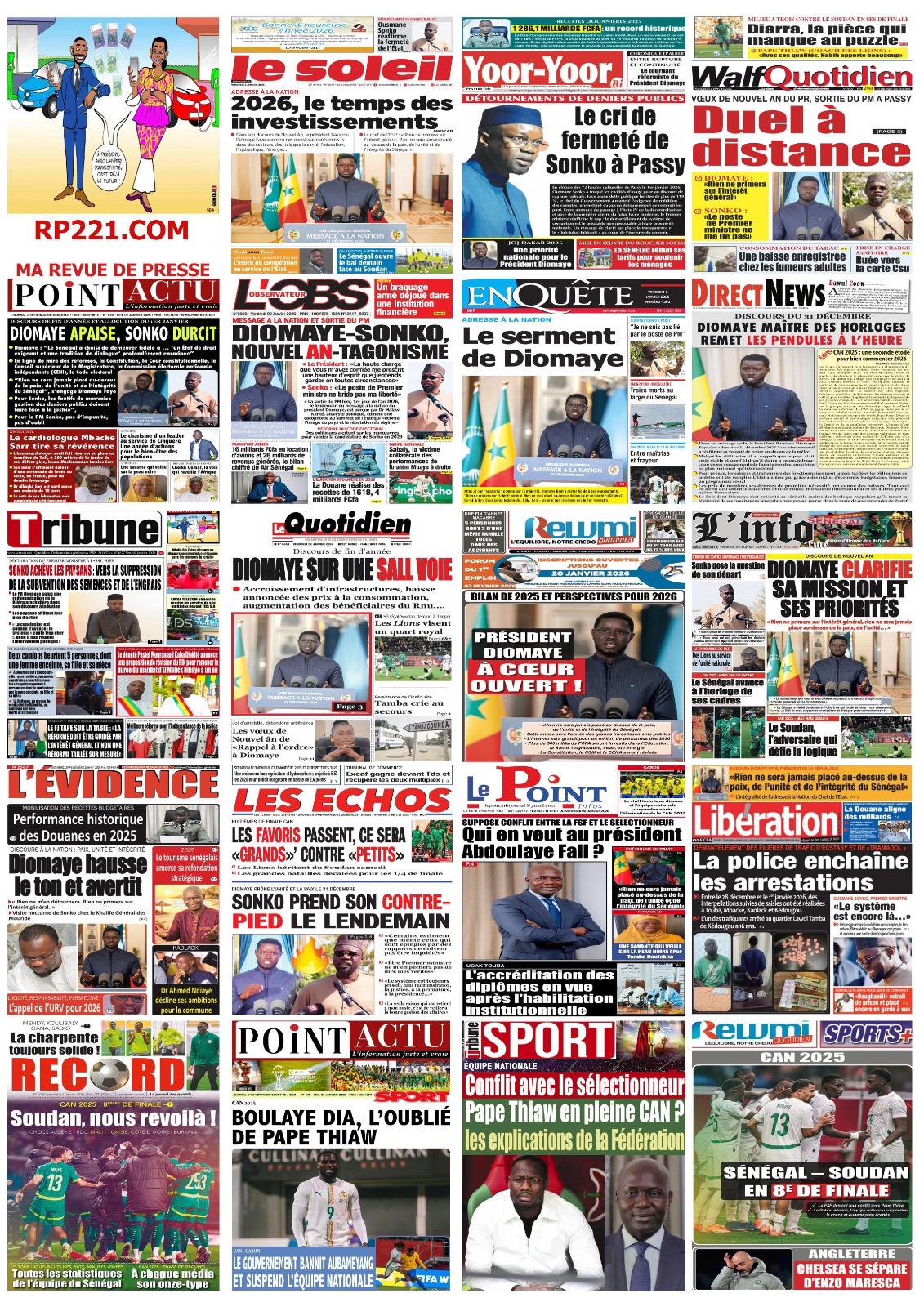 Les journaux sénégalais du vendredi 02 janvier 2026 sont largement dominés par le discours de fin d’année du Président Bassirou Diomaye à la Nation, la sortie virulente du Premier ministre Ousmane Sonko à Passy et la CAN 2025 avec le 1/8e de finale des Lions contre le Soudan.