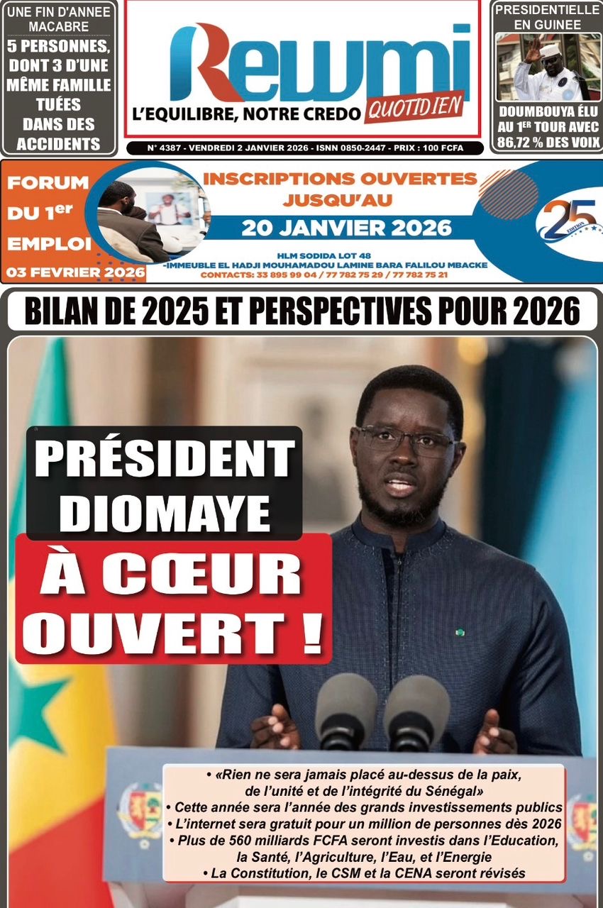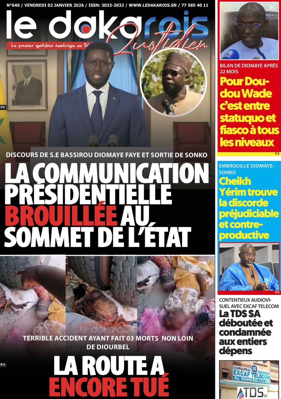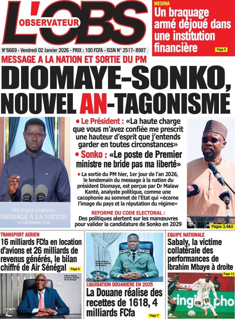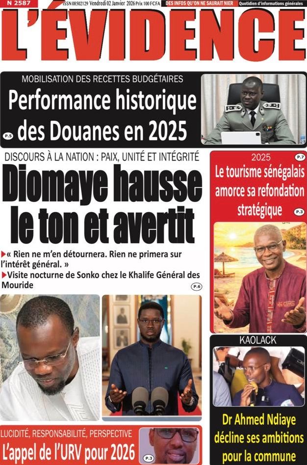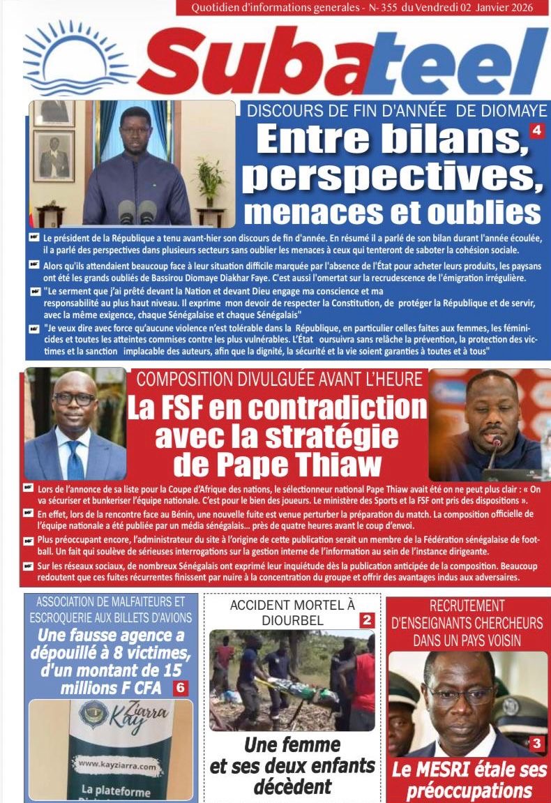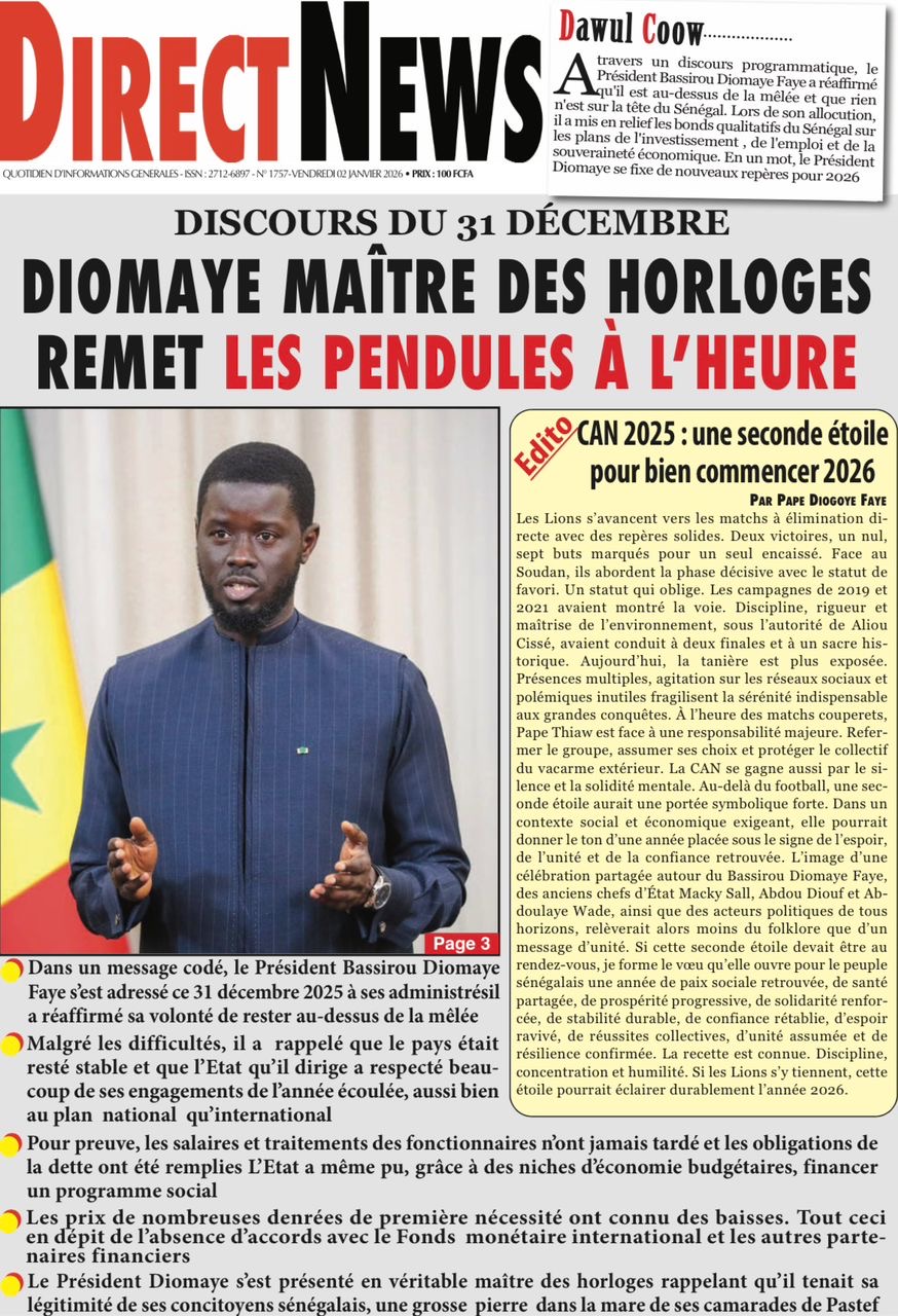 Les journaux sénégalais du vendredi 02 janvier 2026 sont largement dominés par le discours de fin d’année du Président Bassirou Diomaye à la Nation, la sortie virulente du Premier ministre Ousmane Sonko à Passy et la CAN 2025 avec le 1/8e de finale des Lions contre le Soudan.
