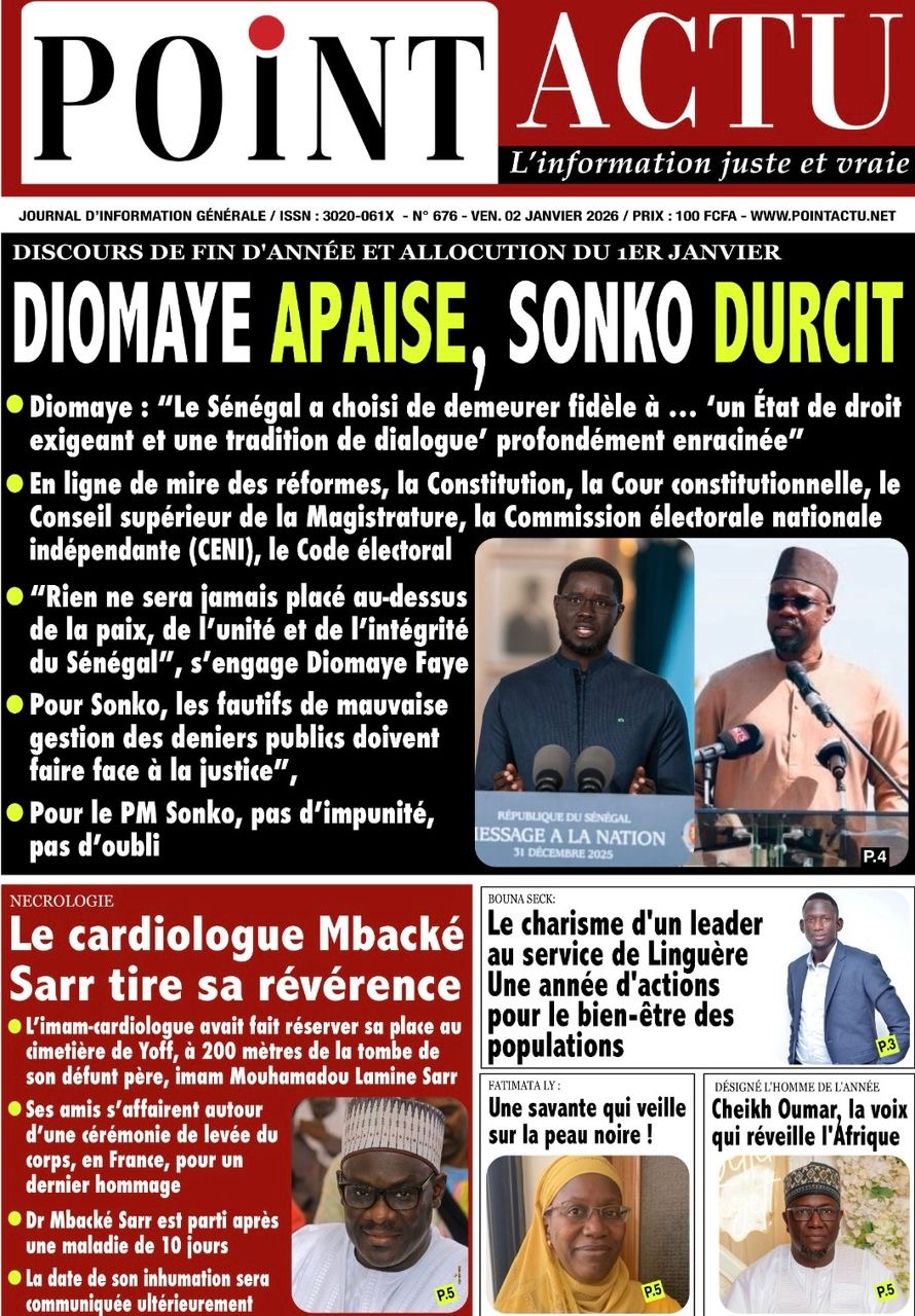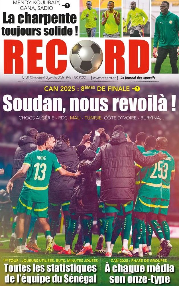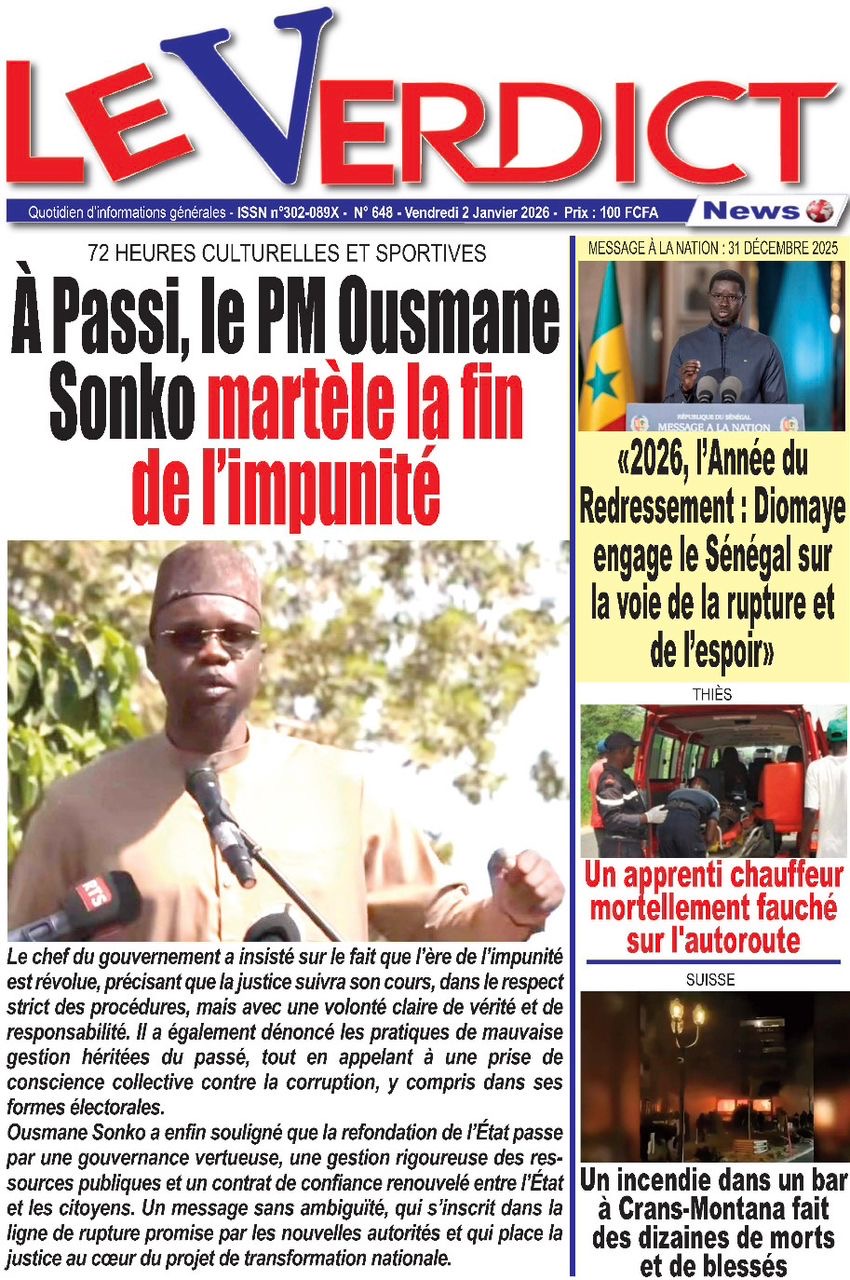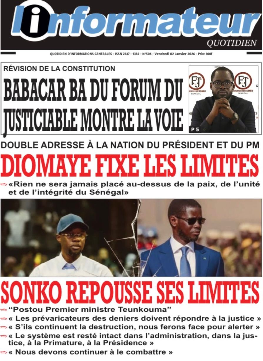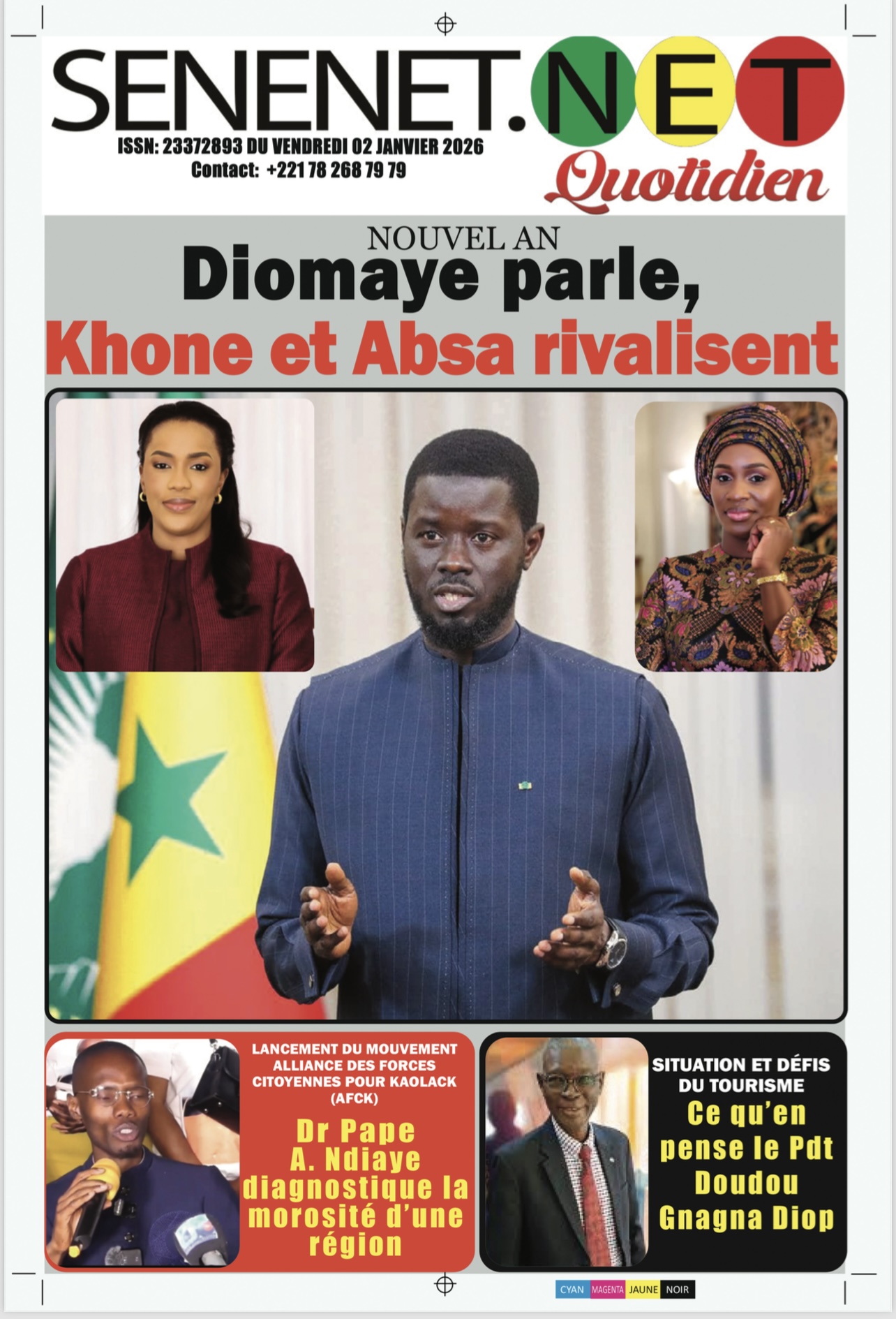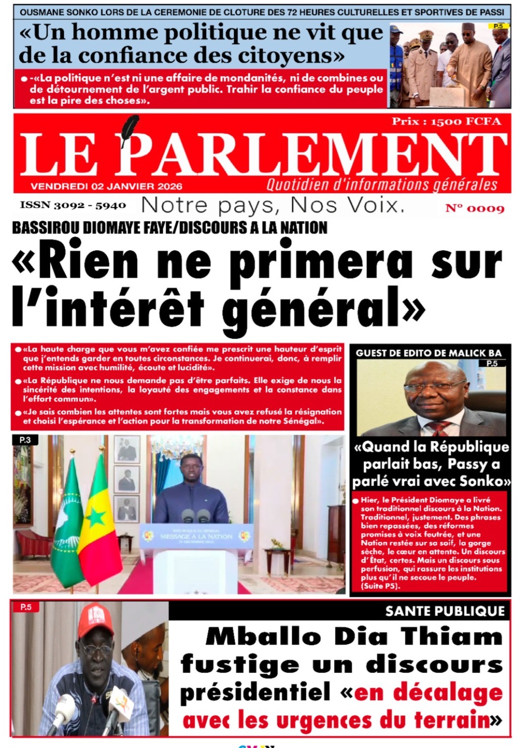 Les journaux sénégalais du vendredi 02 janvier 2026 sont largement dominés par le discours de fin d’année du Président Bassirou Diomaye à la Nation, la sortie virulente du Premier ministre Ousmane Sonko à Passy et la CAN 2025 avec le 1/8e de finale des Lions contre le Soudan.