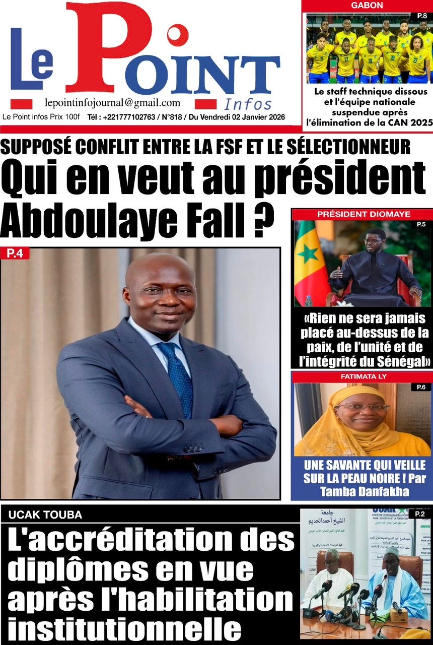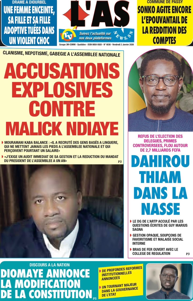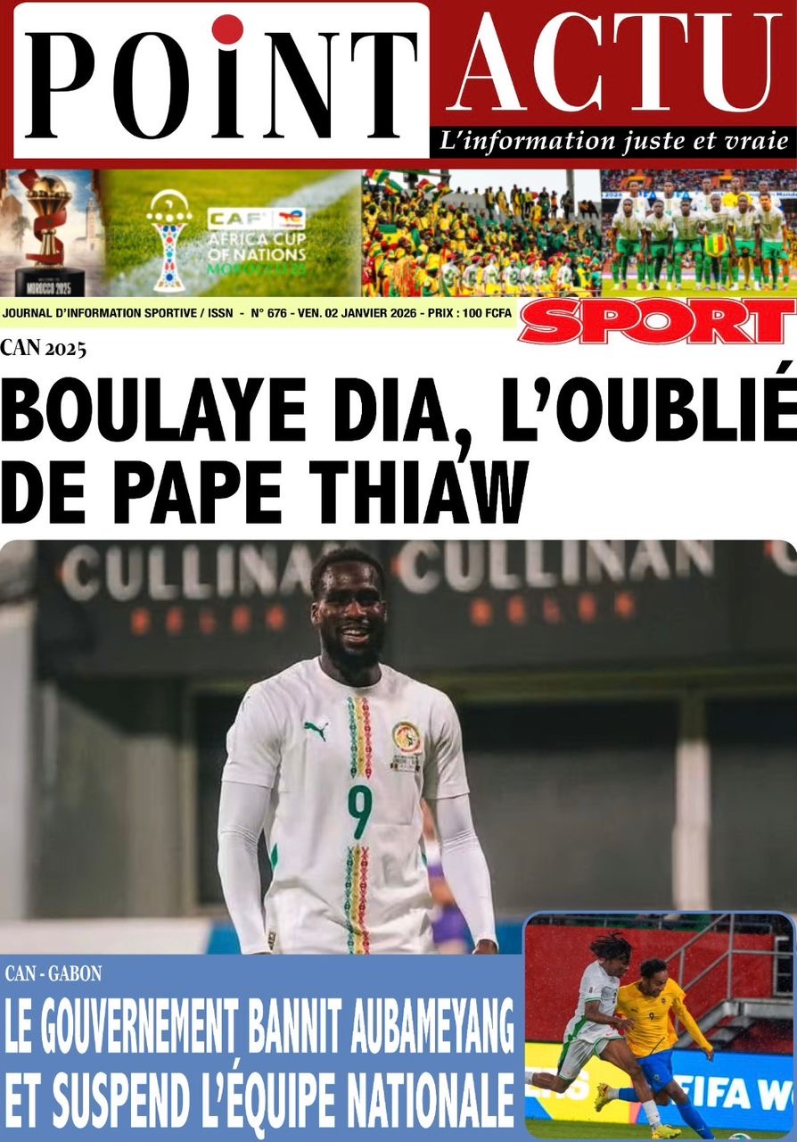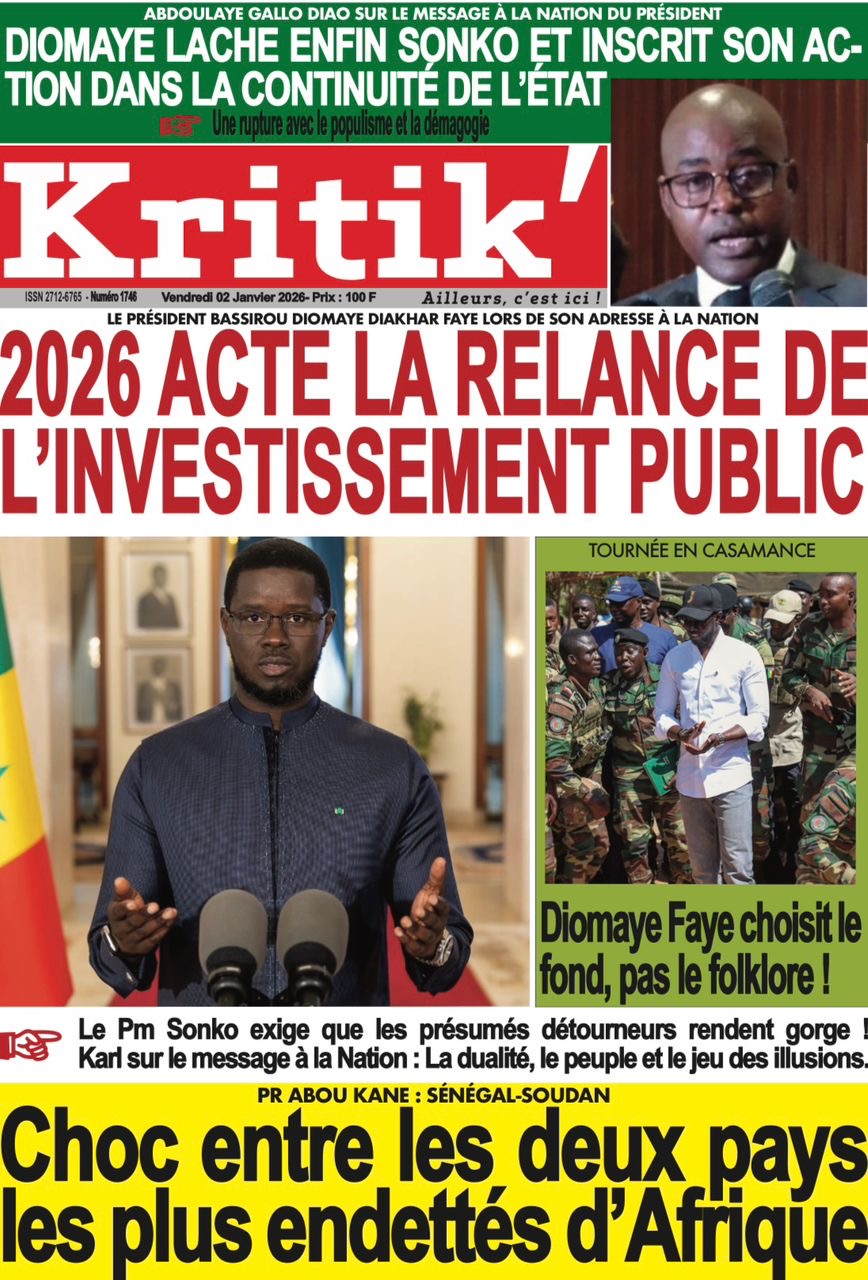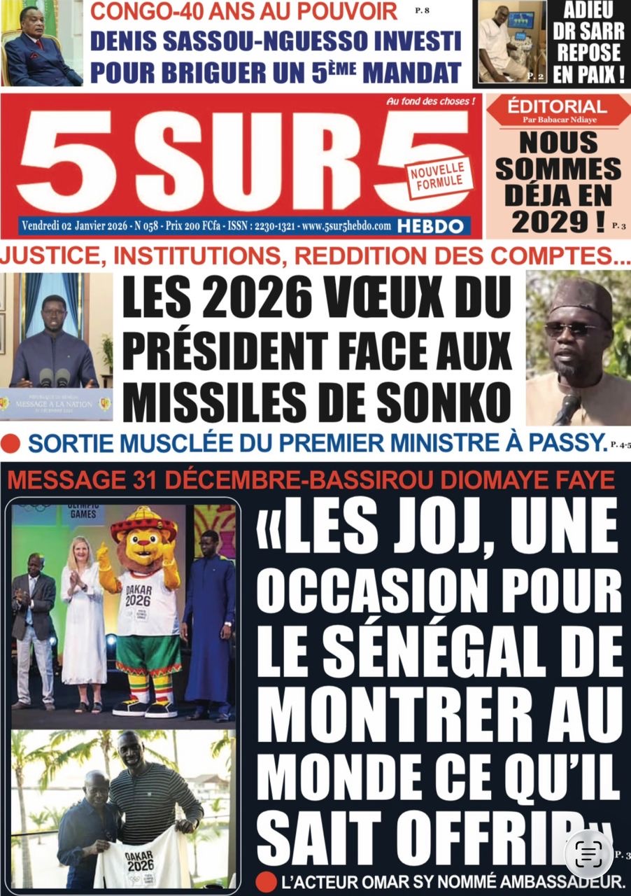 Les journaux sénégalais du vendredi 02 janvier 2026 sont largement dominés par le discours de fin d’année du Président Bassirou Diomaye à la Nation, la sortie virulente du Premier ministre Ousmane Sonko à Passy et la CAN 2025 avec le 1/8e de finale des Lions contre le Soudan.