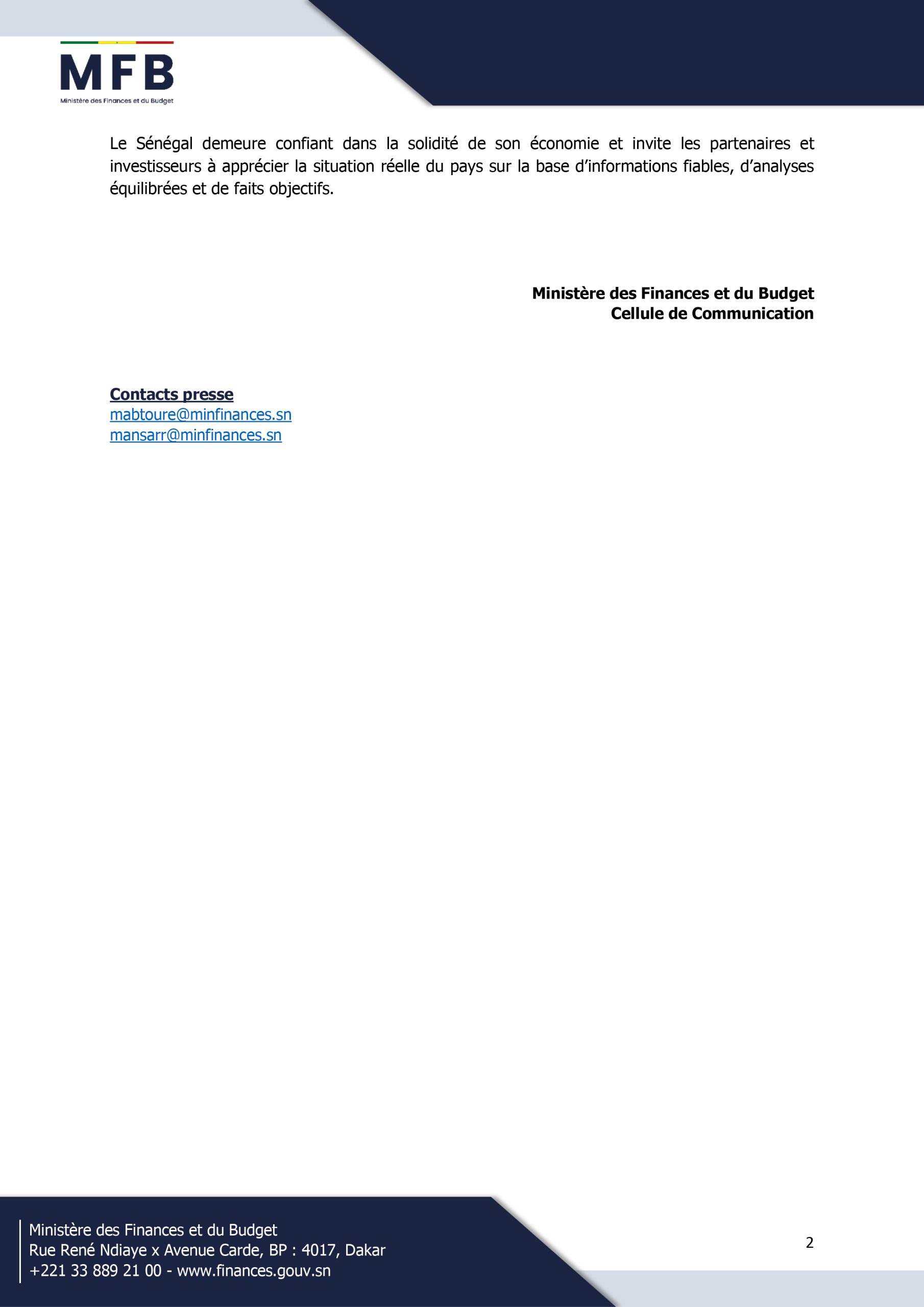 Les services du ministre Cheikh Diba indique dans un communiqué exploité par la RTS1 que « cette évaluation repose sur des hypothèses spéculatives, subjectives et biaisées et ne reflète en rien la trajectoire économique réelle du pays ».