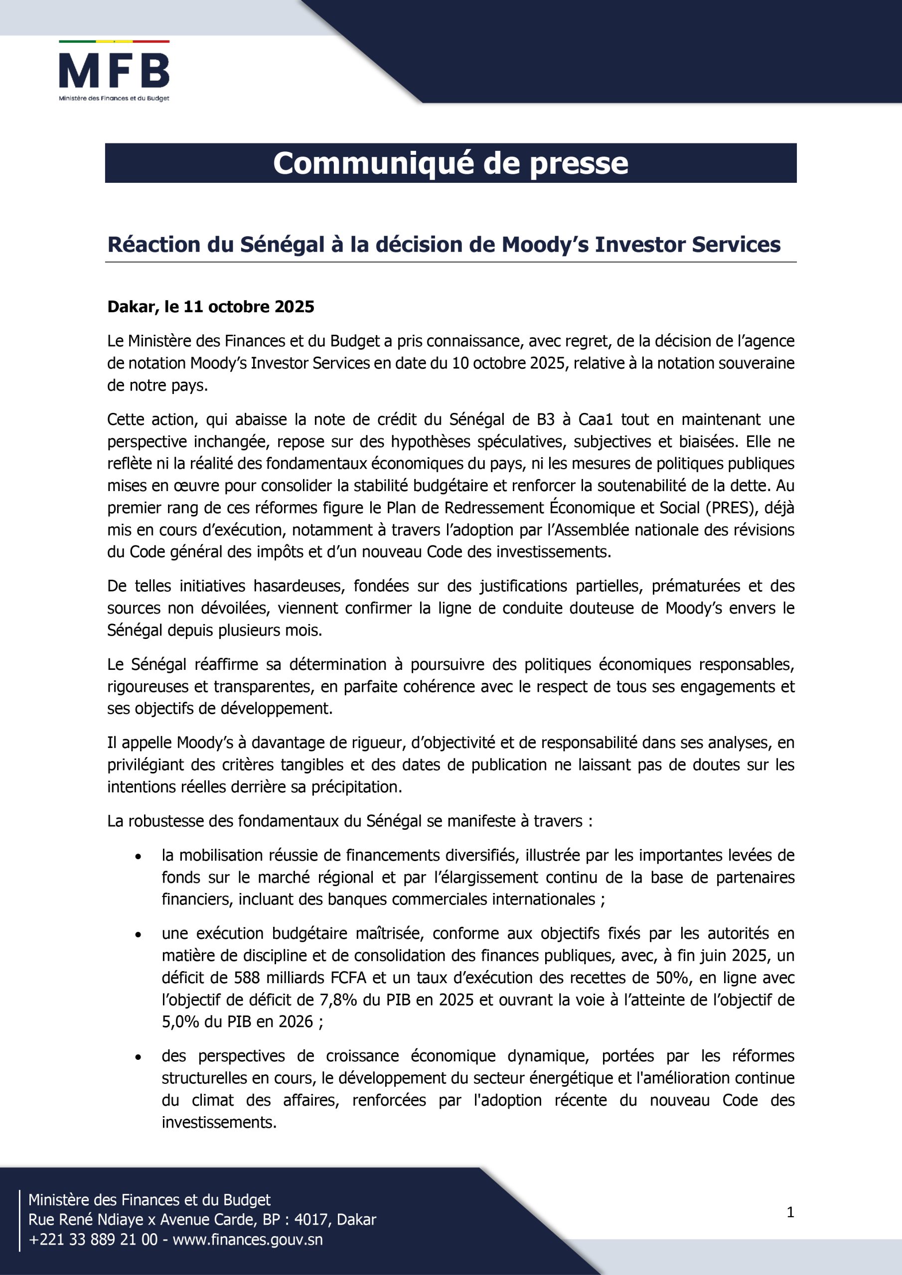 Le Gouvernement a réagi à la nouvelle notation de Moody’s dégradant le Sénégal de B3 à Caa1, via un ministère des Finances et du Budget.