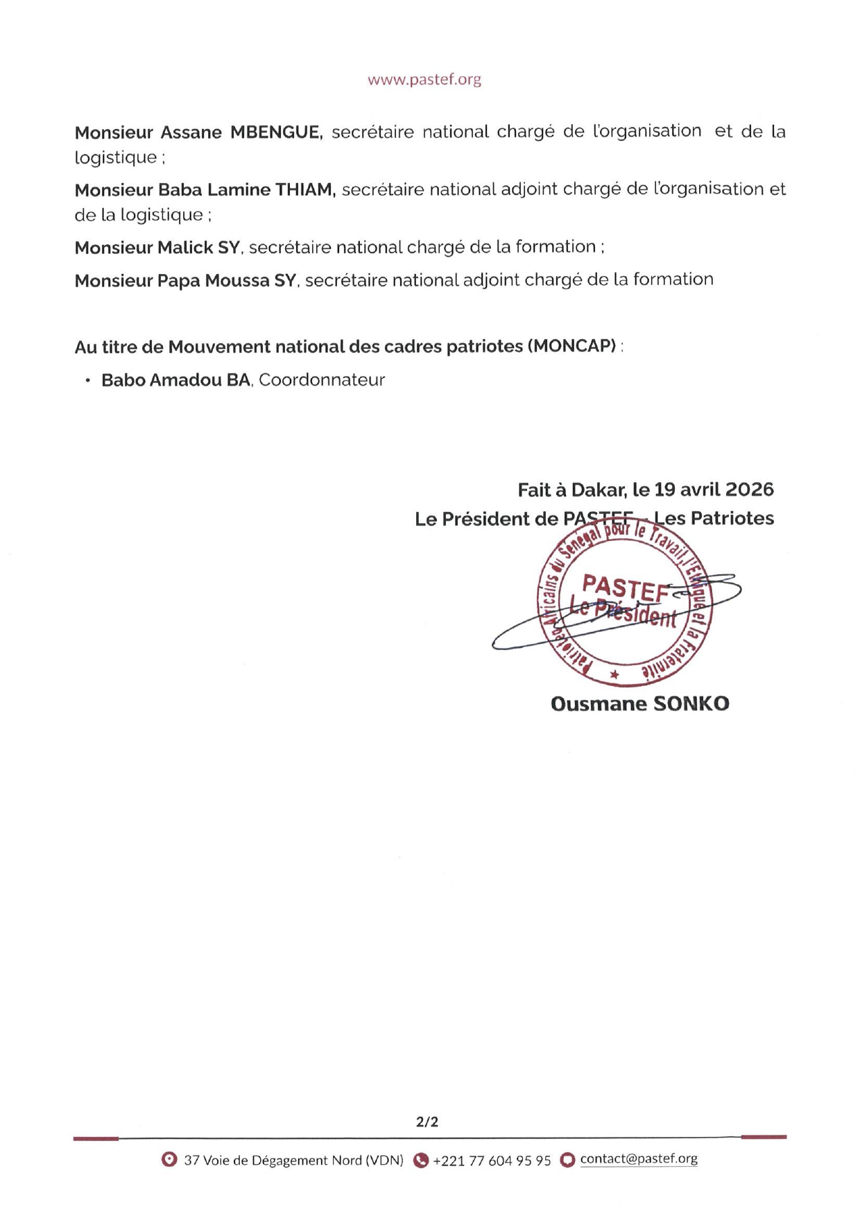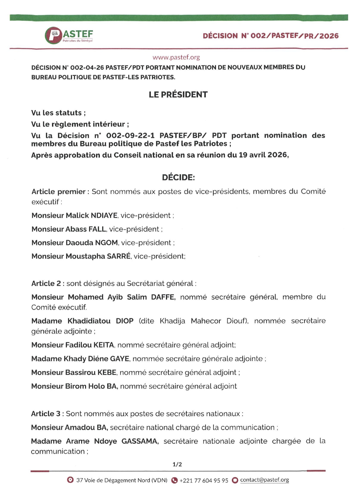 Ousmane Sonko a procédé, ce dimanche 19 avril, à plusieurs nominations dans les instances du Pastef. Plusieurs Vice-présidents et Secrétaires généraux adjoints émergent ainsi, tous étant des figures reconnues du parti et fervents défenseurs de leur leader.
