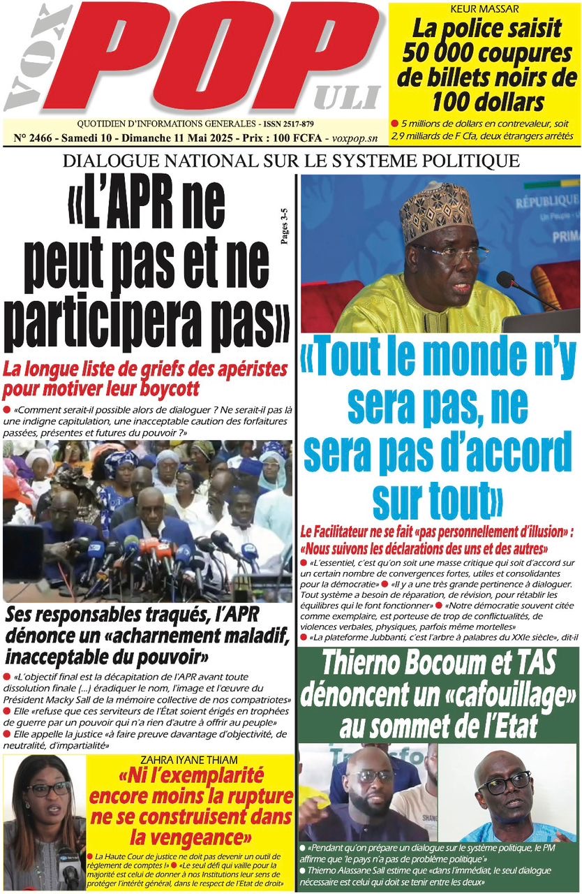 Revue de presse sénégalaise du samedi 10 mai 2025 : le dialogue national du 28 mai fait la UNE de plusieurs qui, abordent le sujet en mettant en exergue notamment l’annonce de boycott de l’APR de l’ex Président Macky Sall et le nombre d’entités qui vont participer.