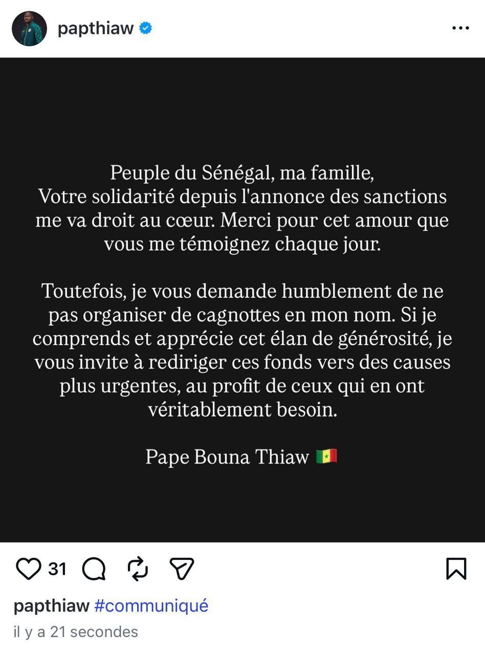 Pape Thiaw a réagi aux sanctions de la CAF le privant de banc des Lions pendant 5 matchs et surtout de la volonté émise par des Sénégalais d’organiser une cagnotte pour payer l’amende.